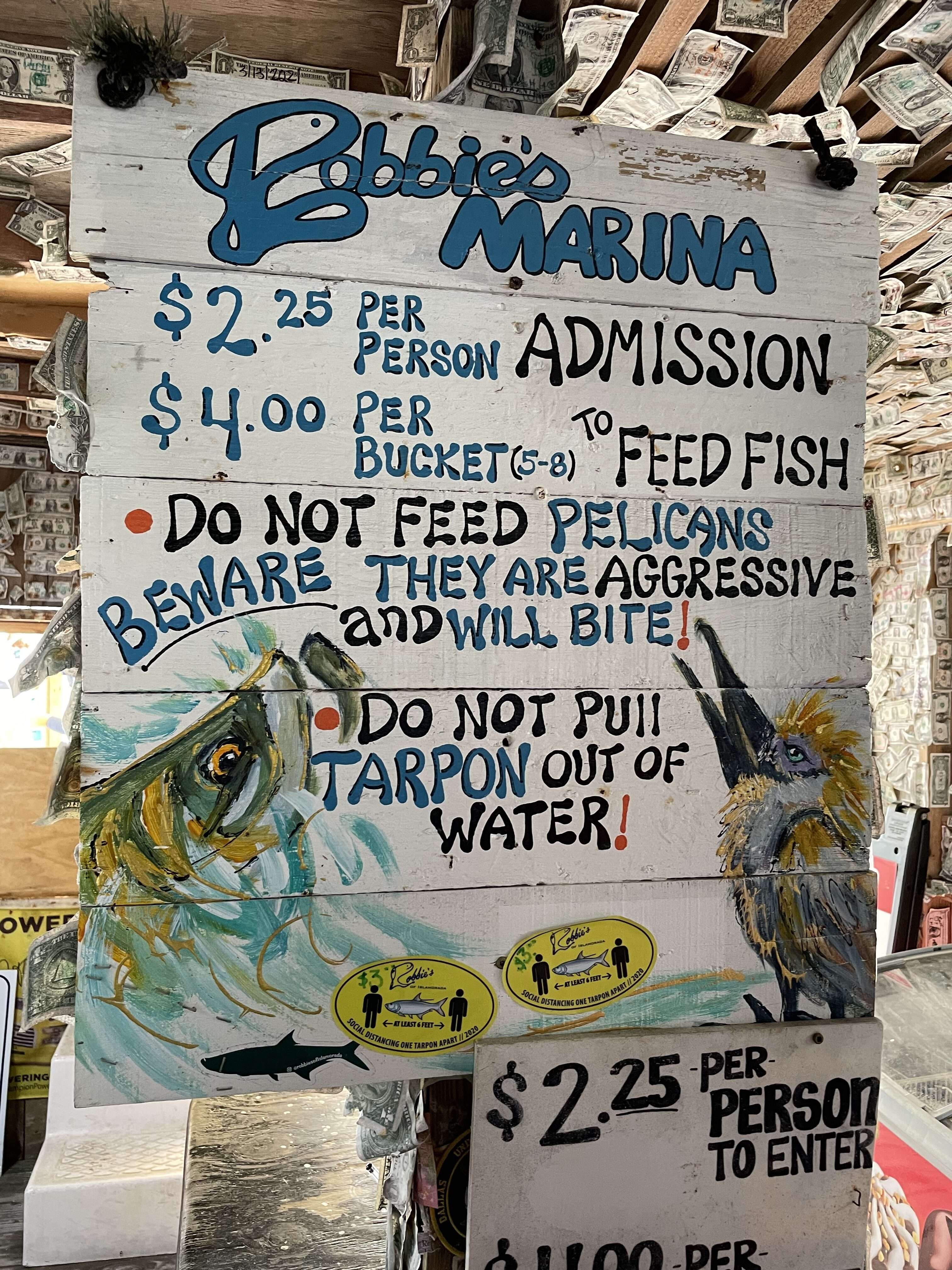 It cost $2.25 per person to go out on the dock and $4 per bucket of fish to feed the tarpon. Your entrance also came with a strict warning not to feed the pelicans because they would bite.
