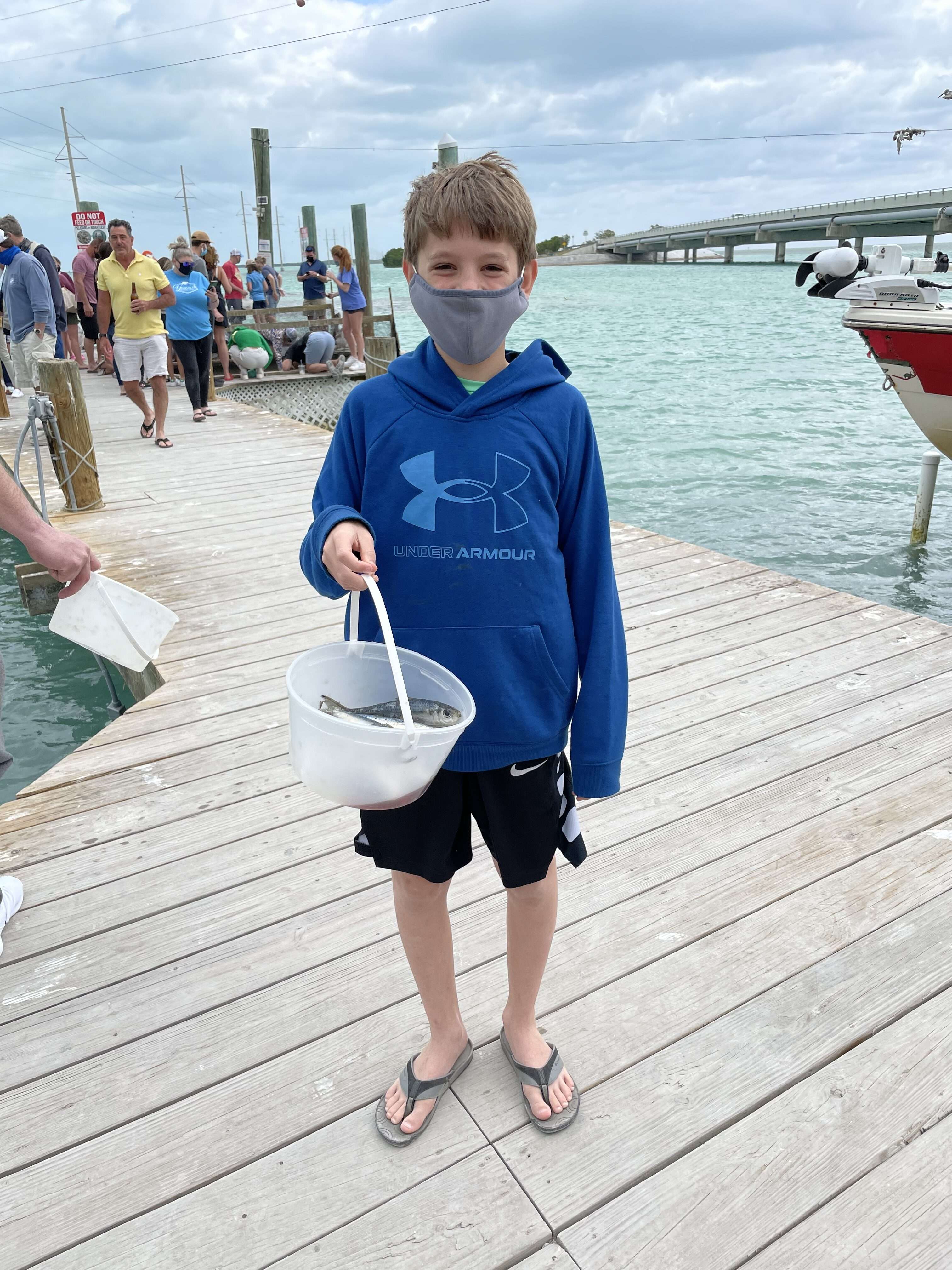 We bought one bucket of fish to share between the 5 of us but JB was the most eager participant. There were a lot of people out on the dock but even more pelicans. Social distancing wasn’t really possible in these tight quarters but everyone did adhere to the mask requirement.
