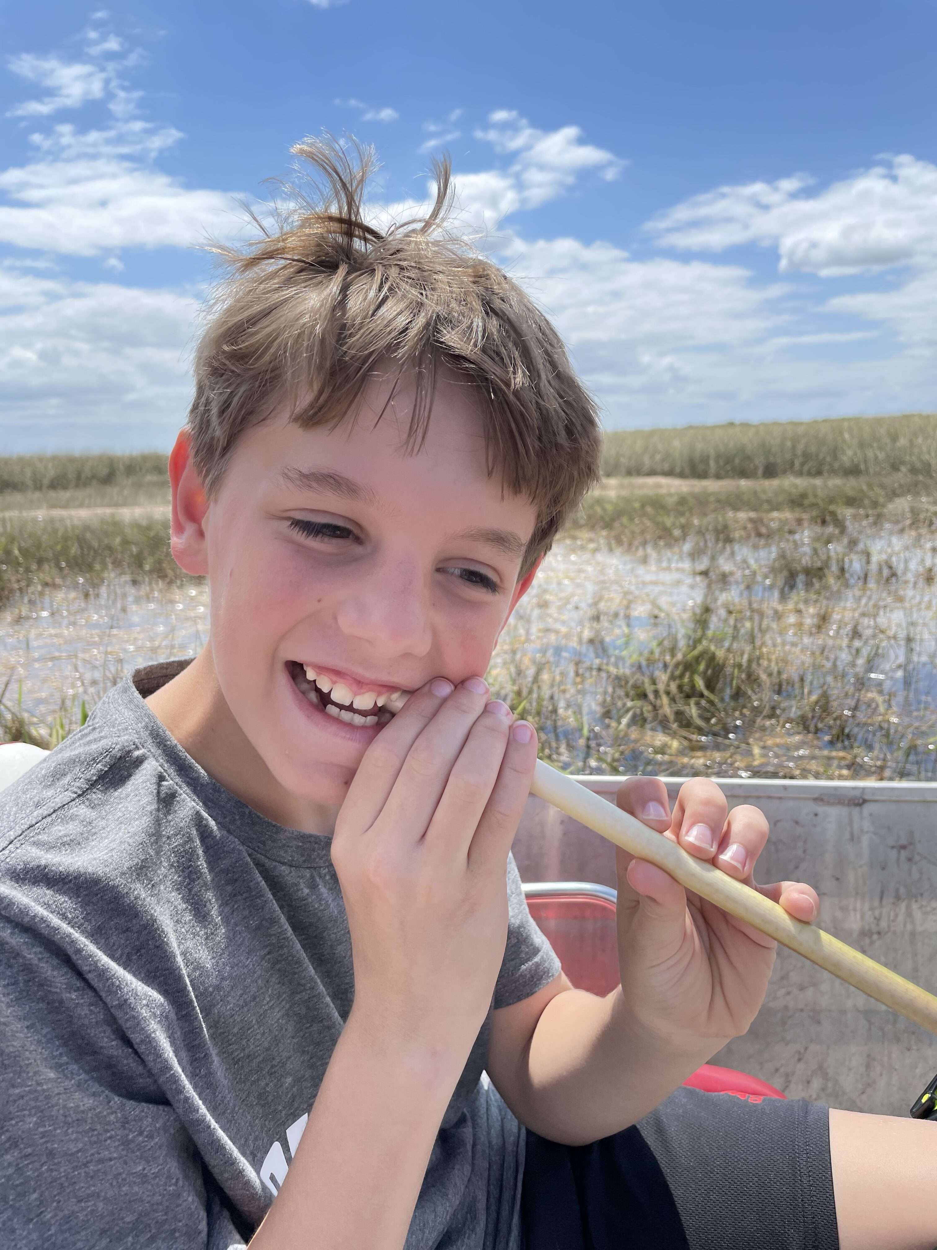 Our tour guide stopped the boat and gave us a lot of information about the Everglades and its “river of grass”. He was really knowledgeable and interesting. He taught us all about Cladium jamaicense, better known as sawgrass. He pulled a stalk to show us how its leaves are serrated and sharp enough to cut you if you run your hand along it in the wrong direction. He also told us that if we were ever lost in the Everglades, we could survive by eating the sawgrass stalks. He even convinced JB to try a bite!