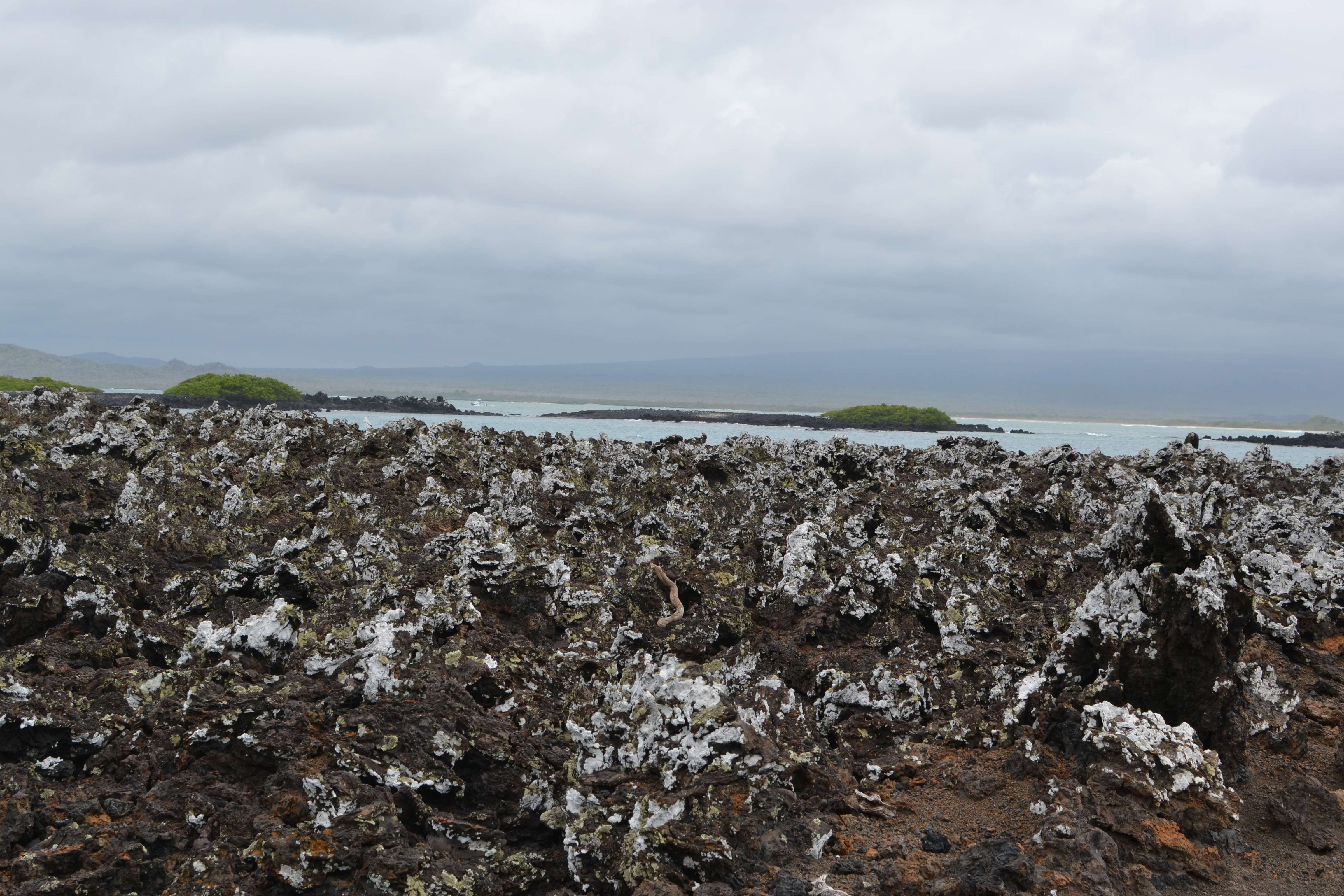 Though the rocks themselves were black, they were covered on one side with a white substance. When our guide asked us all what we thought it was, everyone unanimously answered “bird poop”. It seemed logical, given the preponderance of birds in the area. But it was actually white lichen endemic to the Galapagos that has learned to thrive on the aa (pronounced “ah-ah”) lava. Aa lava is rough and gets its name from the sound Hawaiians say one makes while trying to walk across its sharp surface.