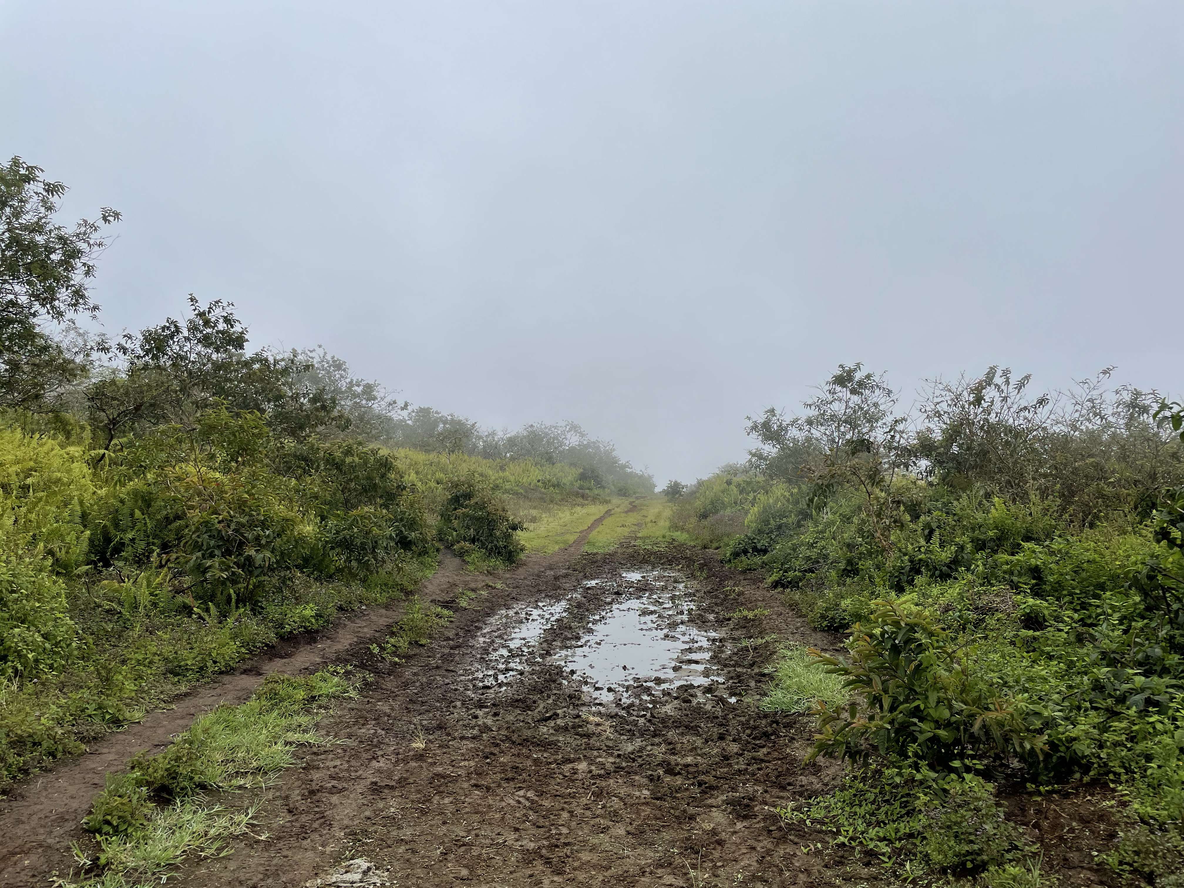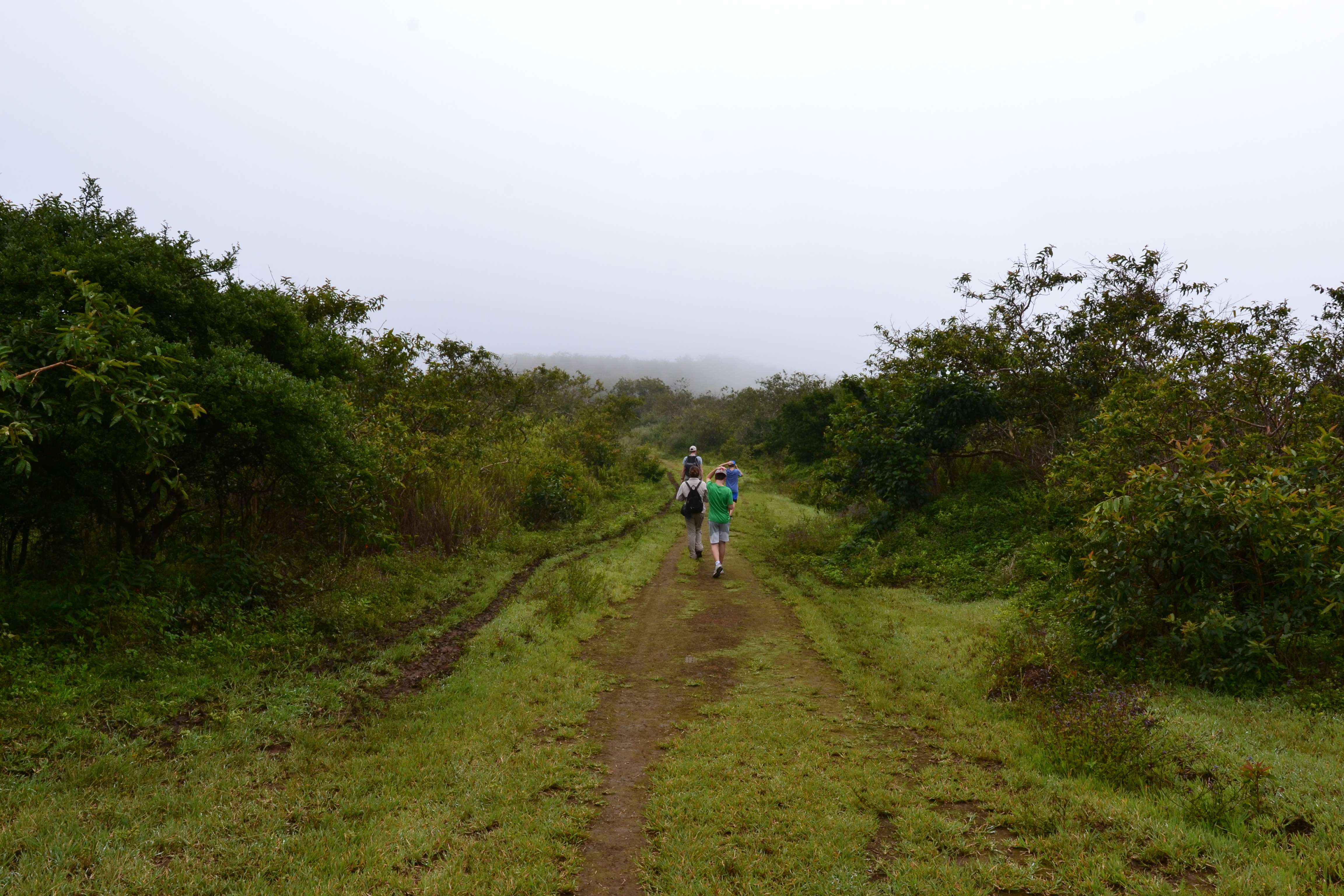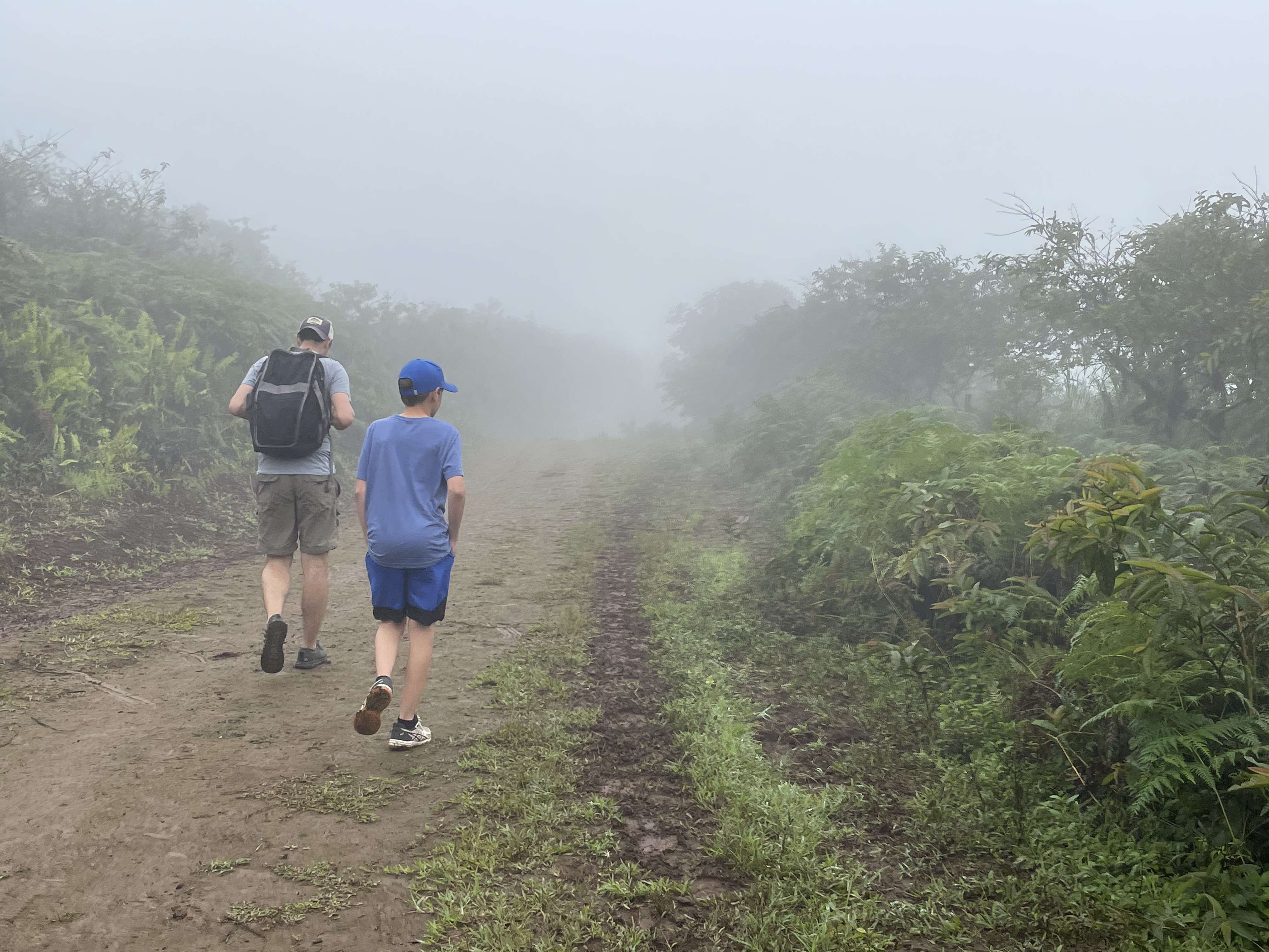 At this point, we had a decision to make. There was still quite a bit of trail ahead of us and the chance of the fog lifting improved as the day went on. But the boys really had no interest in going any further. They were really glad to have had the experience of being on the rim of a volcano and seeing into the caldera. But they didn’t really see a point in continuing along a muddy trail with no real scenery to speak of on the off chance that things might clear up.