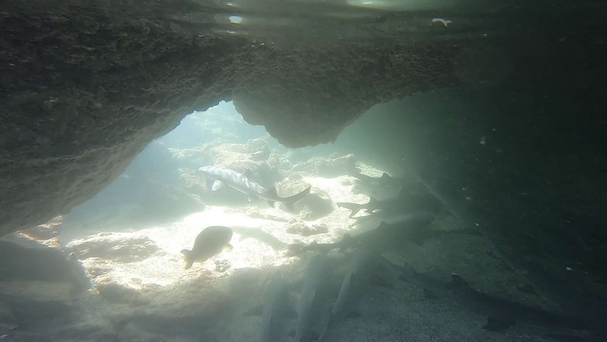 Then we followed our guide to peer into a cave where there were about a dozen whitetip reef sharks lounging around on the ocean floor. Yes, sharks! And lots of them. One swam around slowly but the others just laid in the sand, completely uninterested in us.