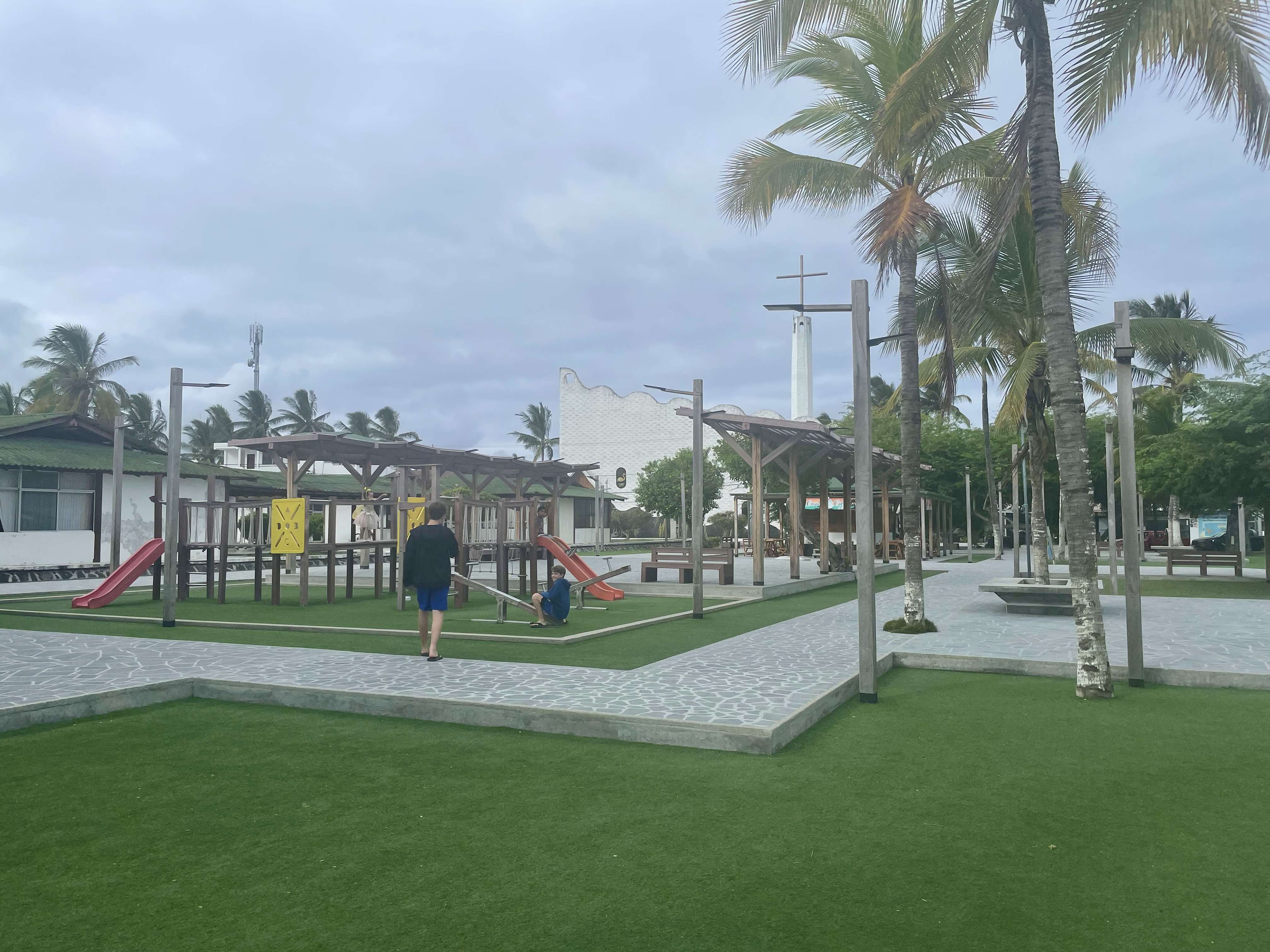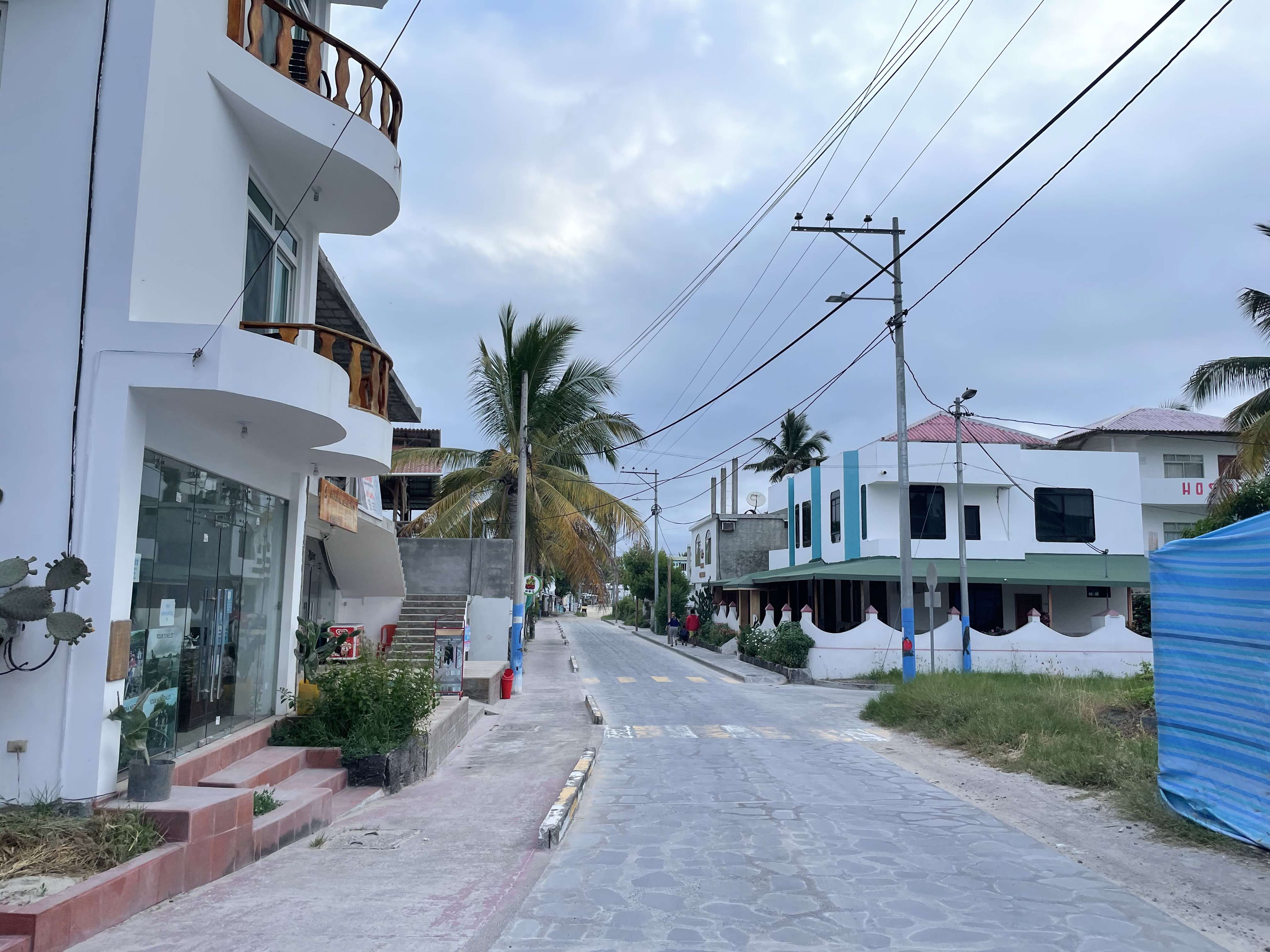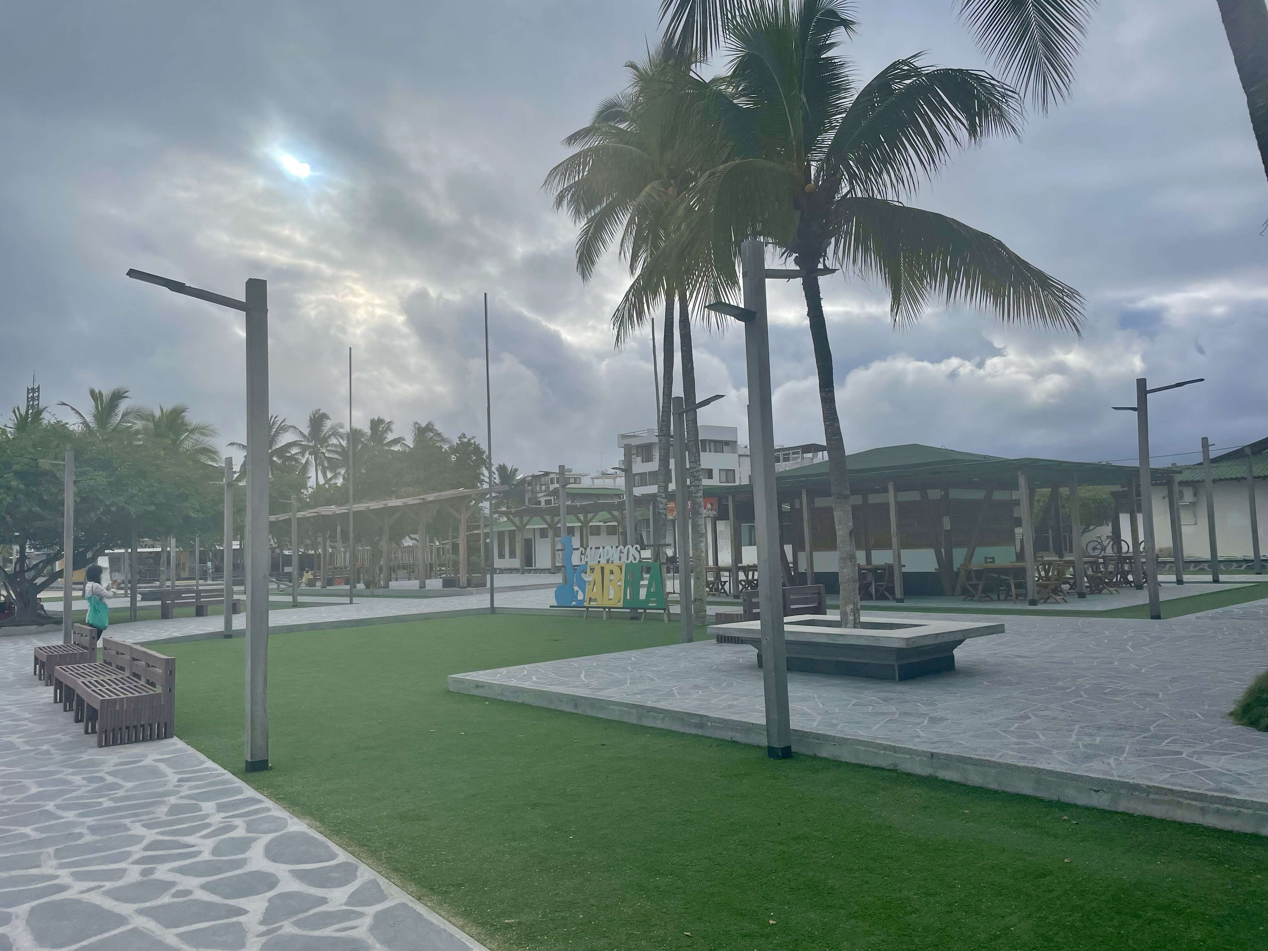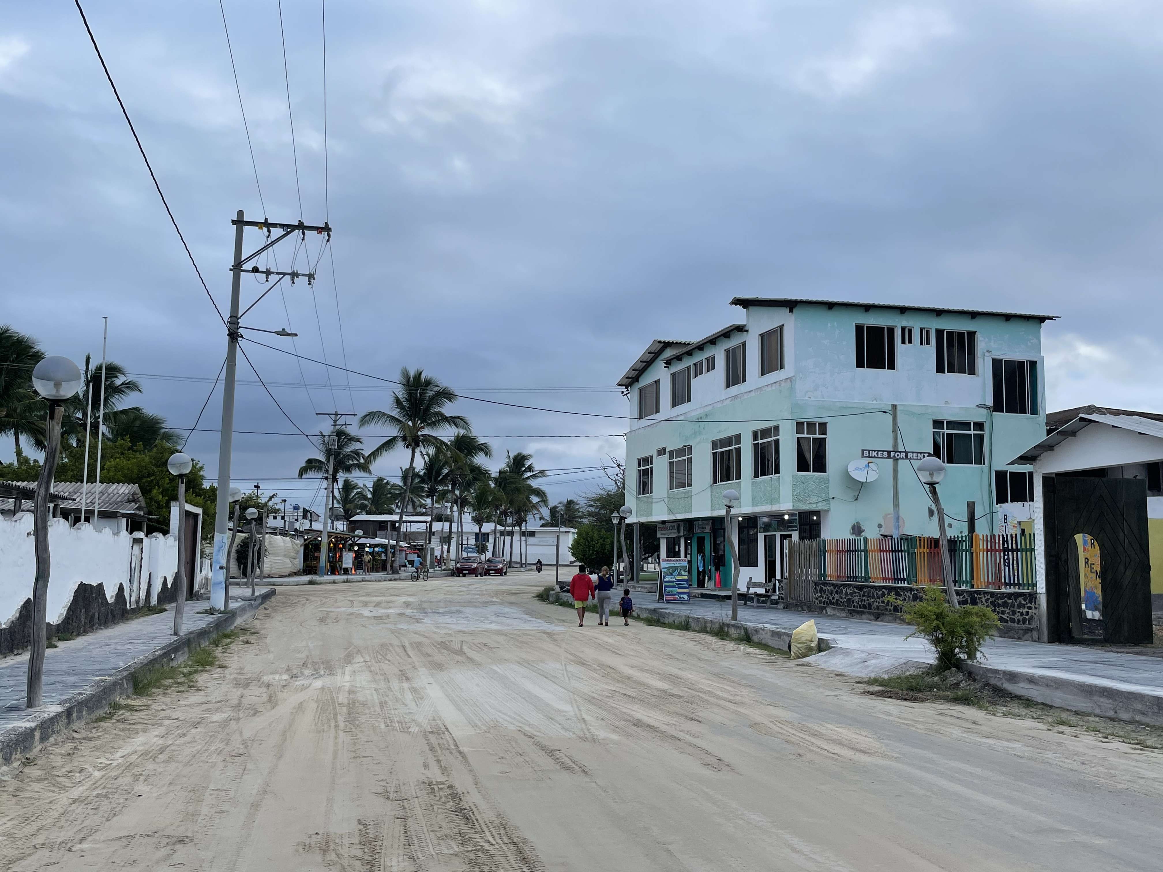 The town of Puerto Villamil has white sand streets lined with palm trees. The main town square features a park and a church. There are a dozen or so restaurants lining the square, although many of them were still not open when we were there due to the low tourist numbers during the pandemic. We ate one night at a pizza restaurant and they warned us that we would have to wait 30 minutes just for them to turn on their ovens and heat them up.