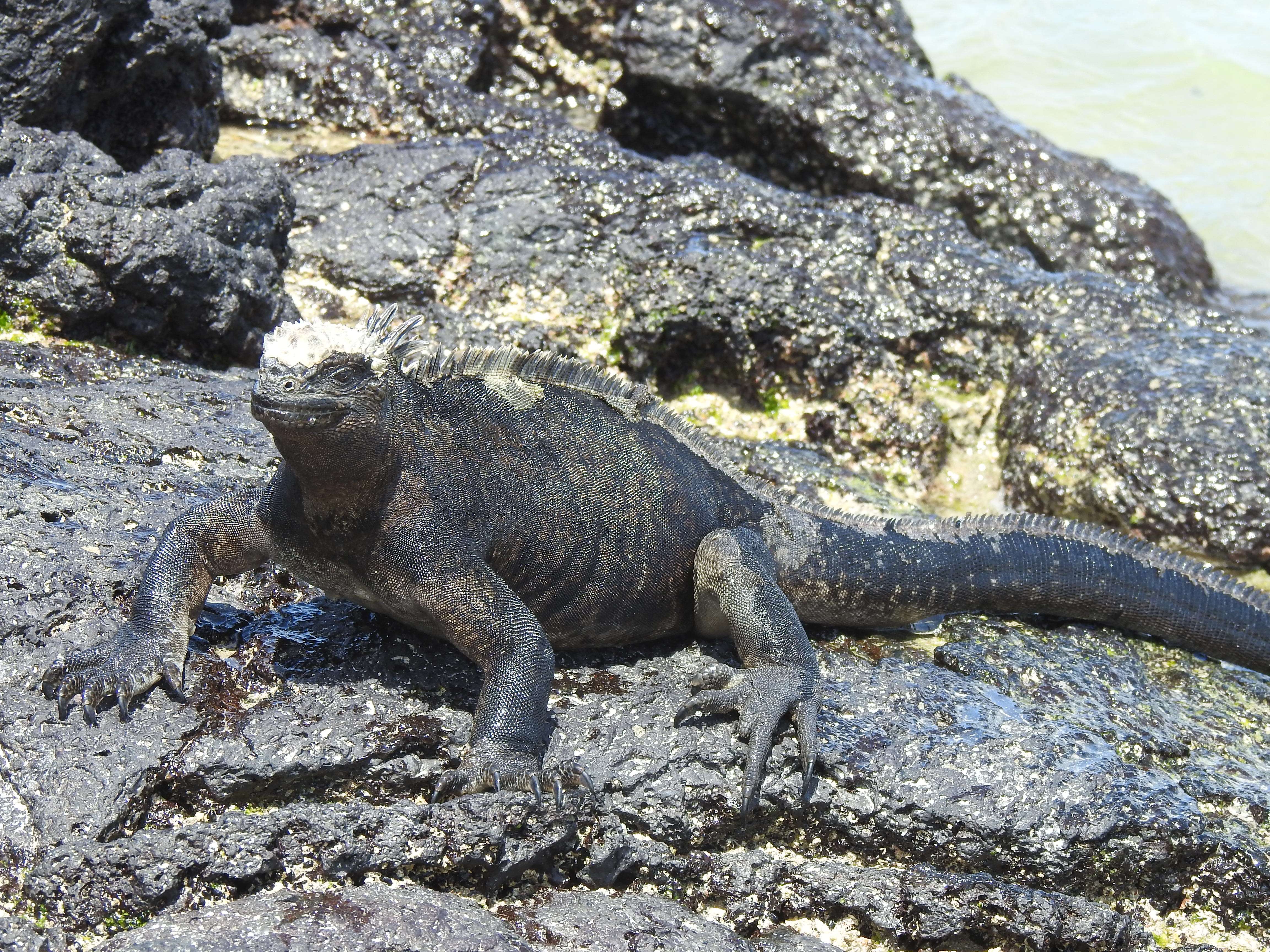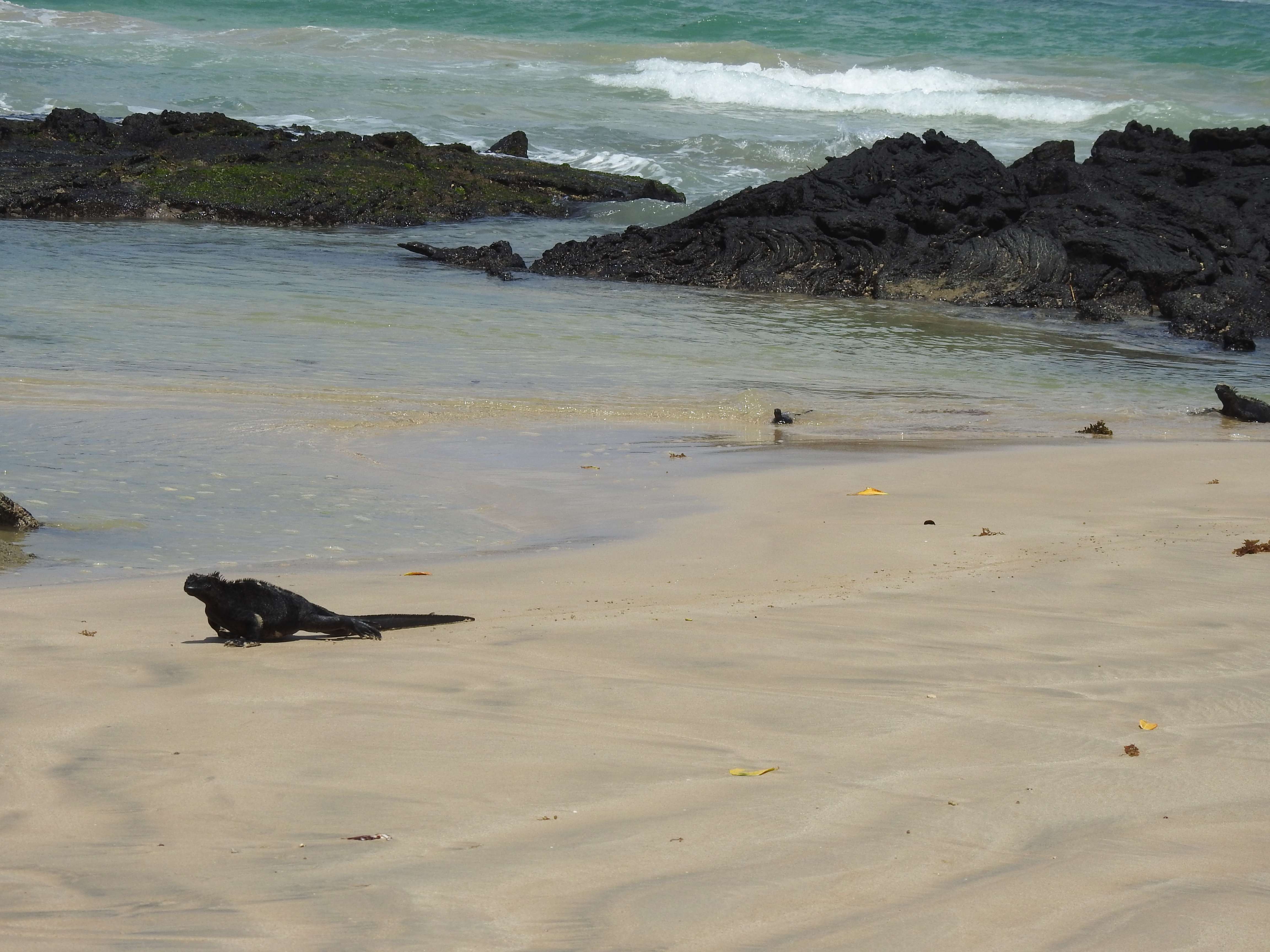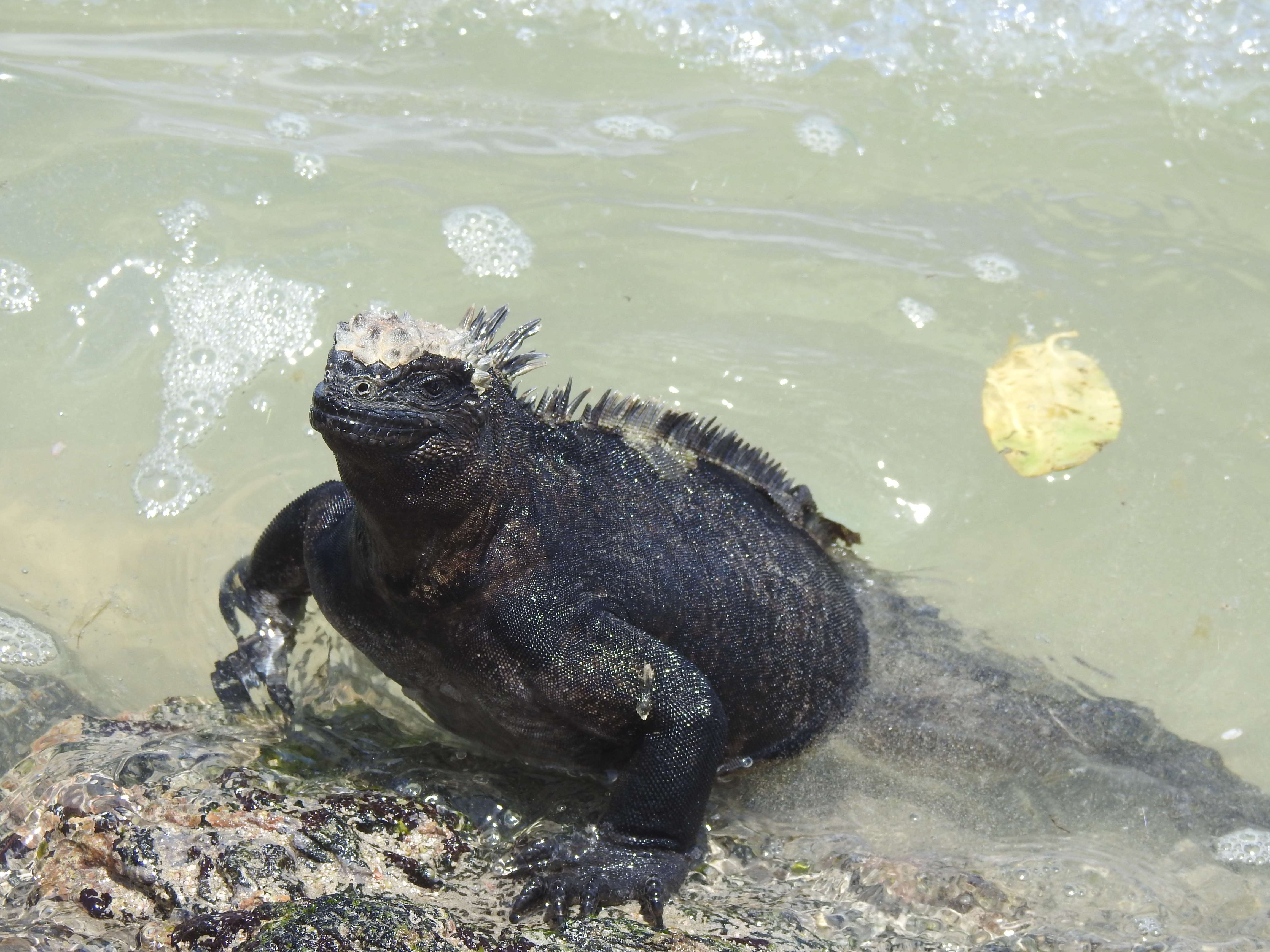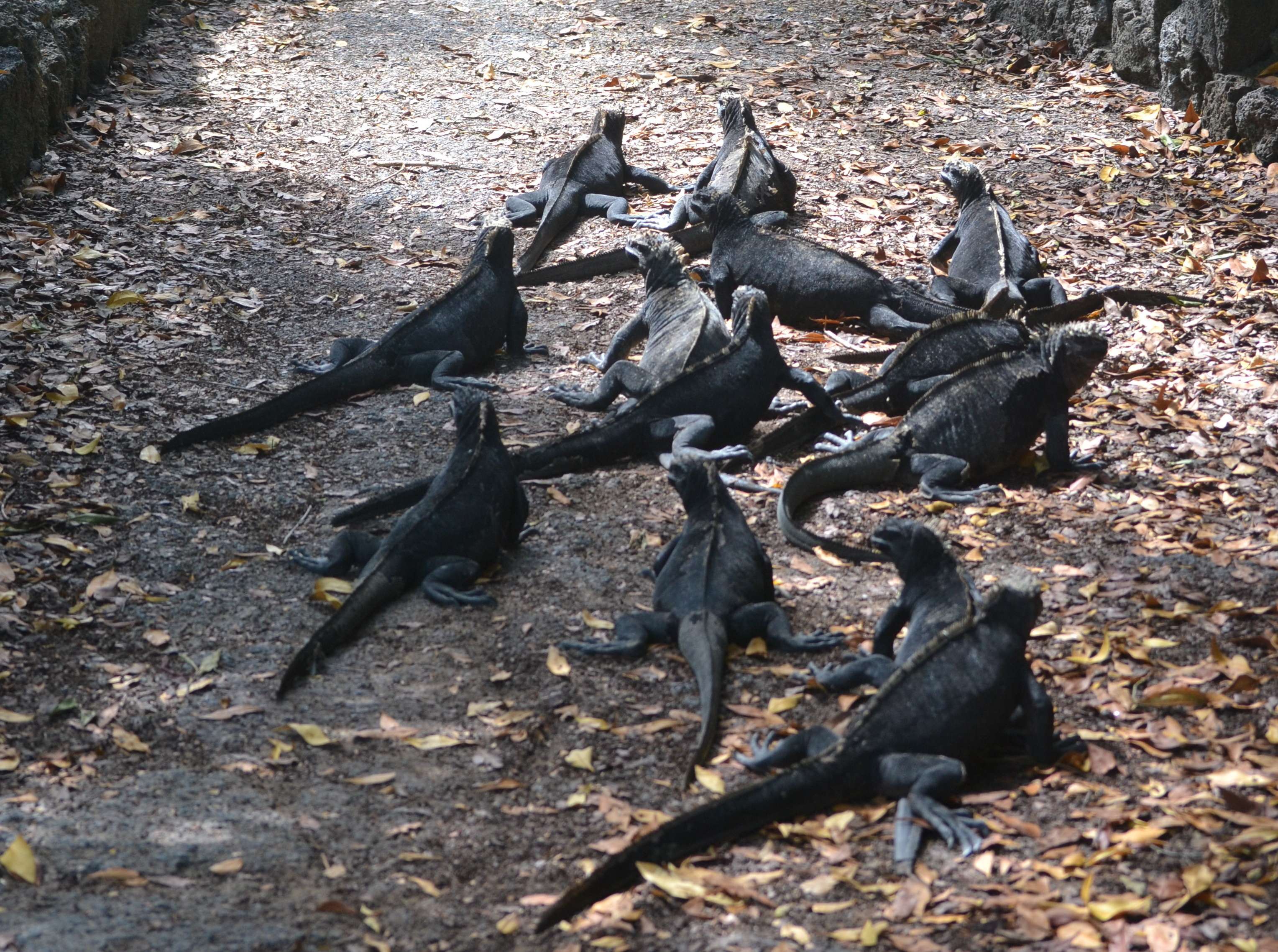 One of my absolute favorite memories of our entire trip was when we went across the street after lunch one day to visit the marine iguanas only to discover that they were not on their signature spot on the rocks. But within minutes we saw an amazing site – one after another they started swimming in from the ocean! There was a series of lava rocks out in the water that created a calm, shallow pool between the open water and the rocks on the beach. The marine iguanas swam in from the ocean, stopped to rest (and eat) on the outer rocks, and then swam across the protected pool before scampering up on the rocks on the beach to lounge in the sun. It was incredible to see them all returning en masse.