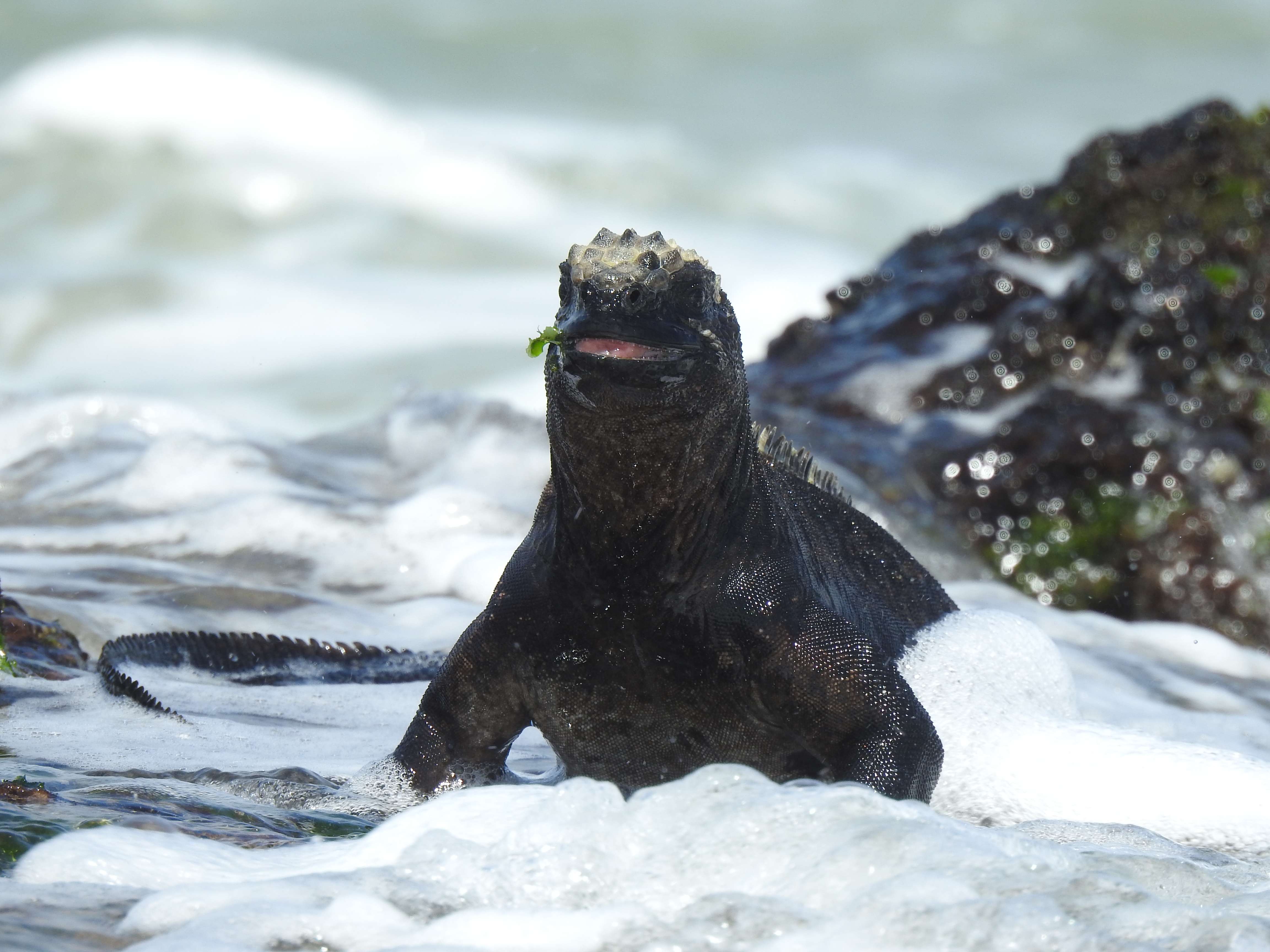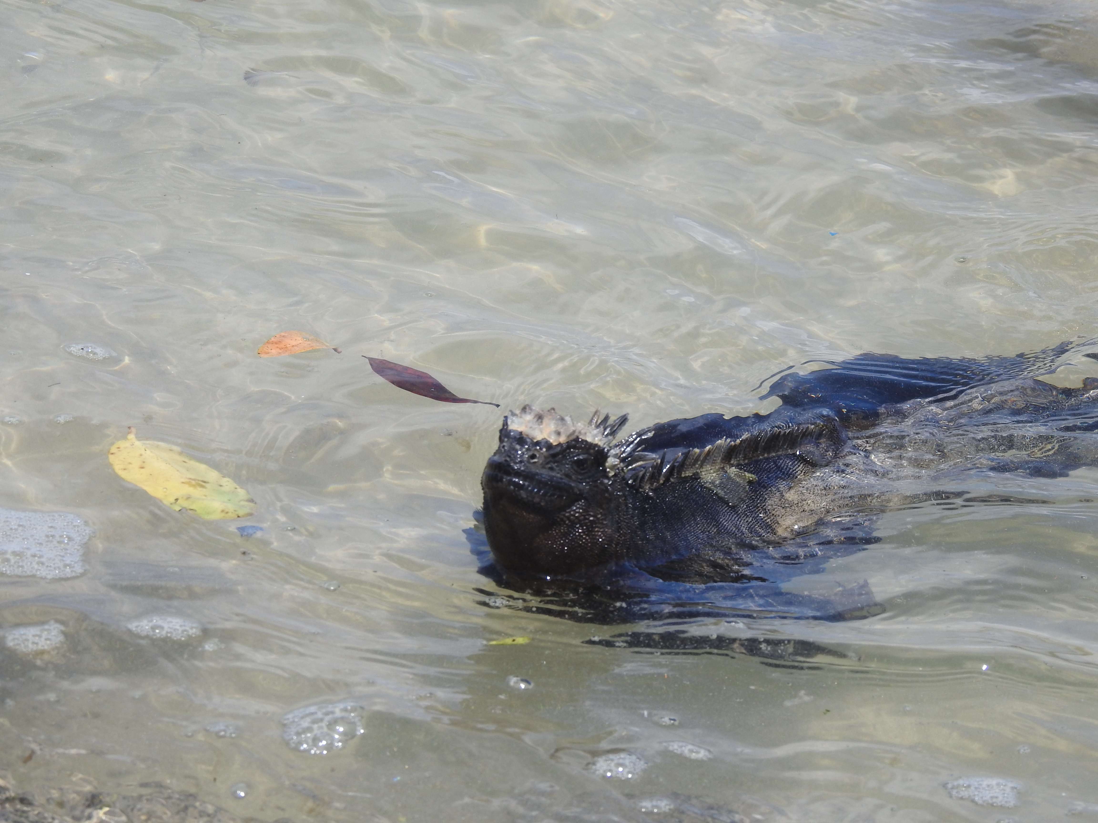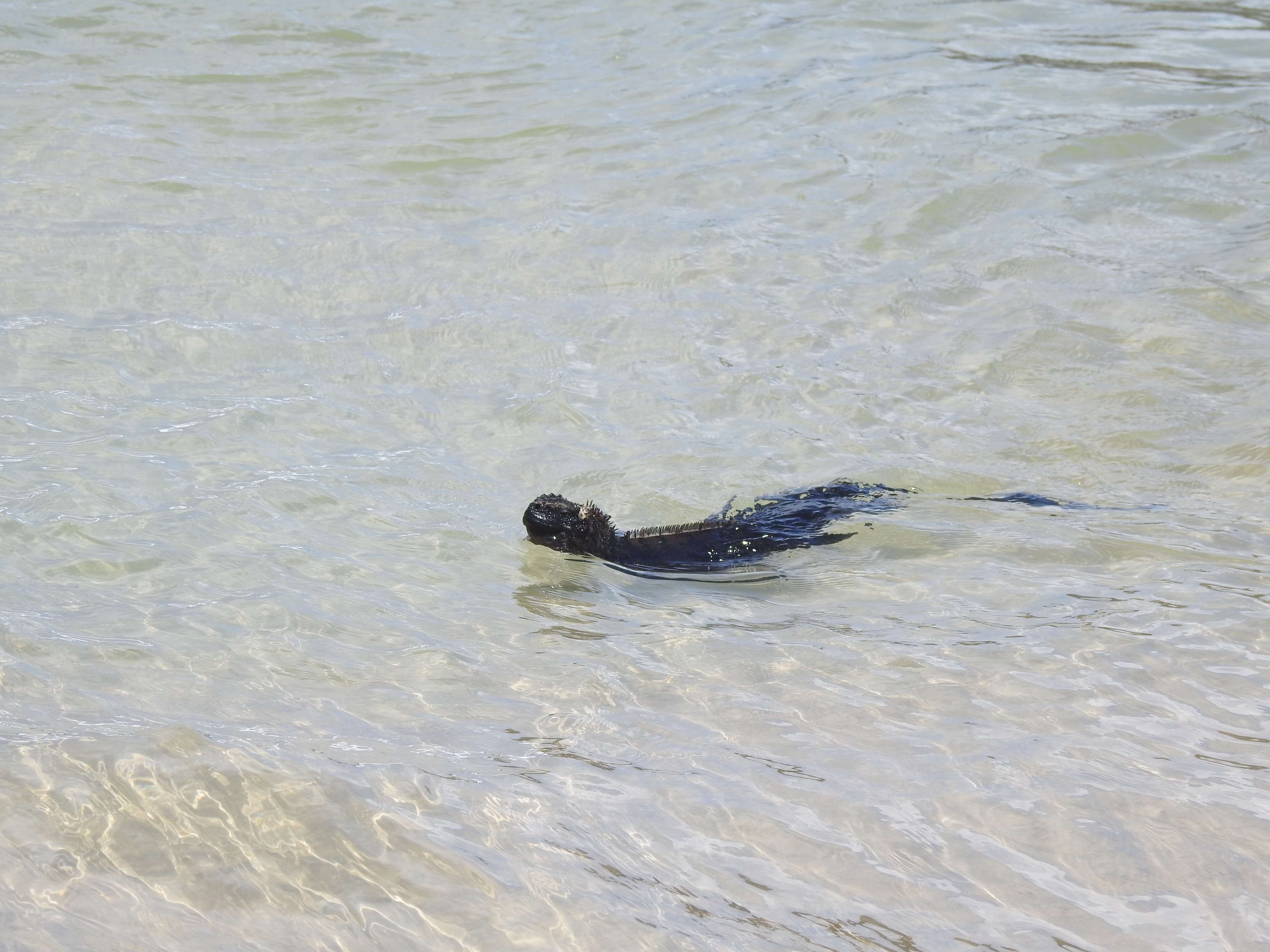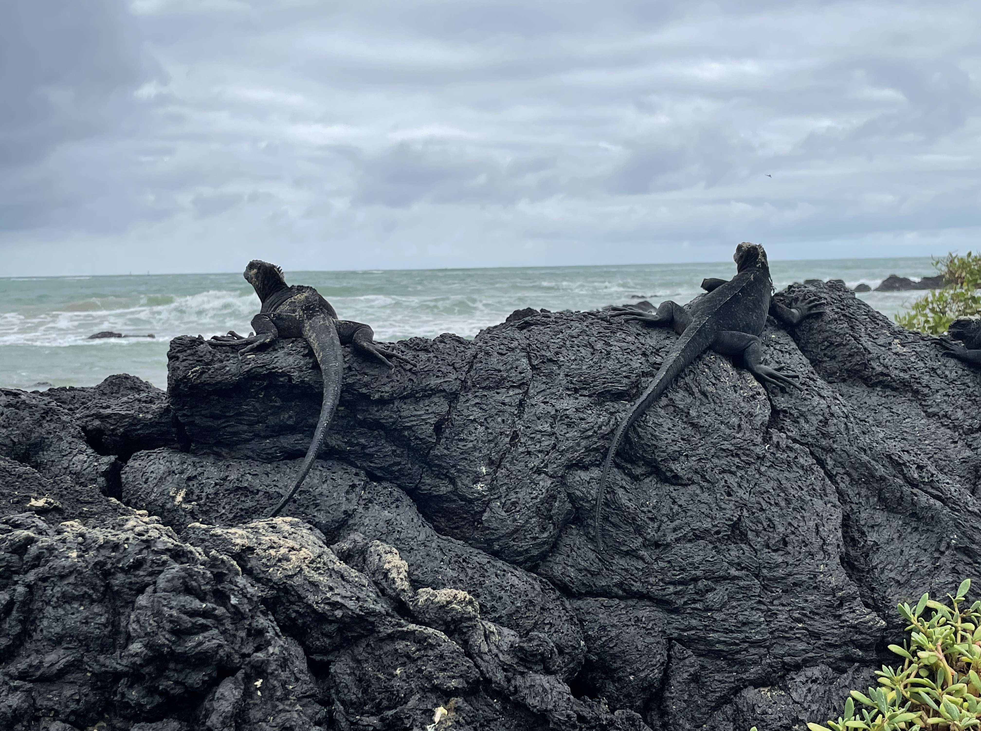 One of my absolute favorite memories of our entire trip was when we went across the street after lunch one day to visit the marine iguanas only to discover that they were not on their signature spot on the rocks. But within minutes we saw an amazing site – one after another they started swimming in from the ocean! There was a series of lava rocks out in the water that created a calm, shallow pool between the open water and the rocks on the beach. The marine iguanas swam in from the ocean, stopped to rest (and eat) on the outer rocks, and then swam across the protected pool before scampering up on the rocks on the beach to lounge in the sun. It was incredible to see them all returning en masse.
