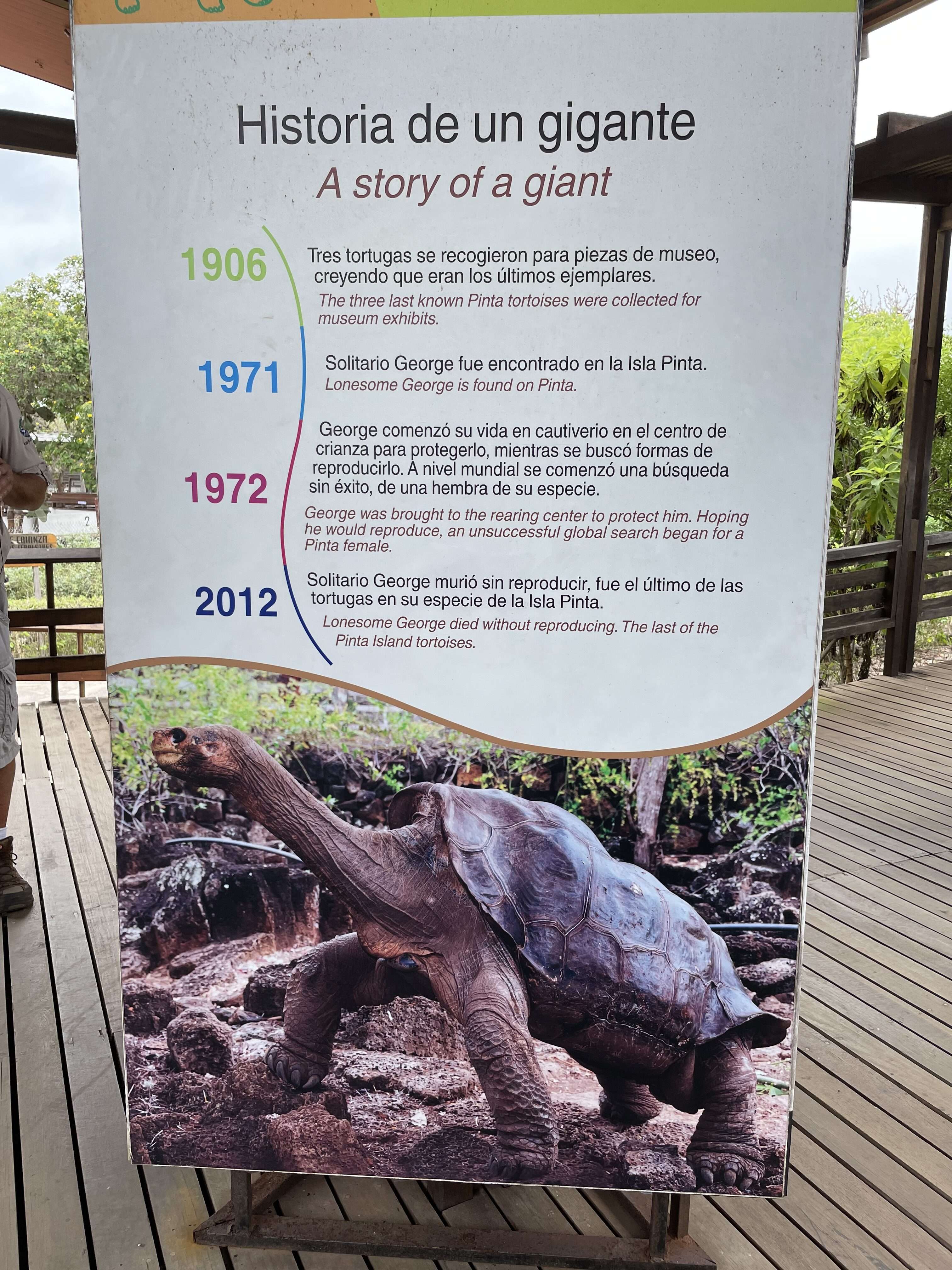 The final exhibit room had the embalmed body of Lonesome George on display. Lonesome George was the last surviving tortoise of the species Chelonoidis abingdoni from Pinta Island. Prior to the early 1970s, the Pinta tortoises were thought to be extinct. But George was discovered on the island in 1971, and a year later he was brought to the Charles Darwin Research Station on Santa Cruz in an effort to protect him while trying to finding him a mate in order to save the species from extinction. Sadly, a mate was never found and when Lonesome George died in 2012 at over 100 years old, the Pinta Tortoise species was officially extinct.