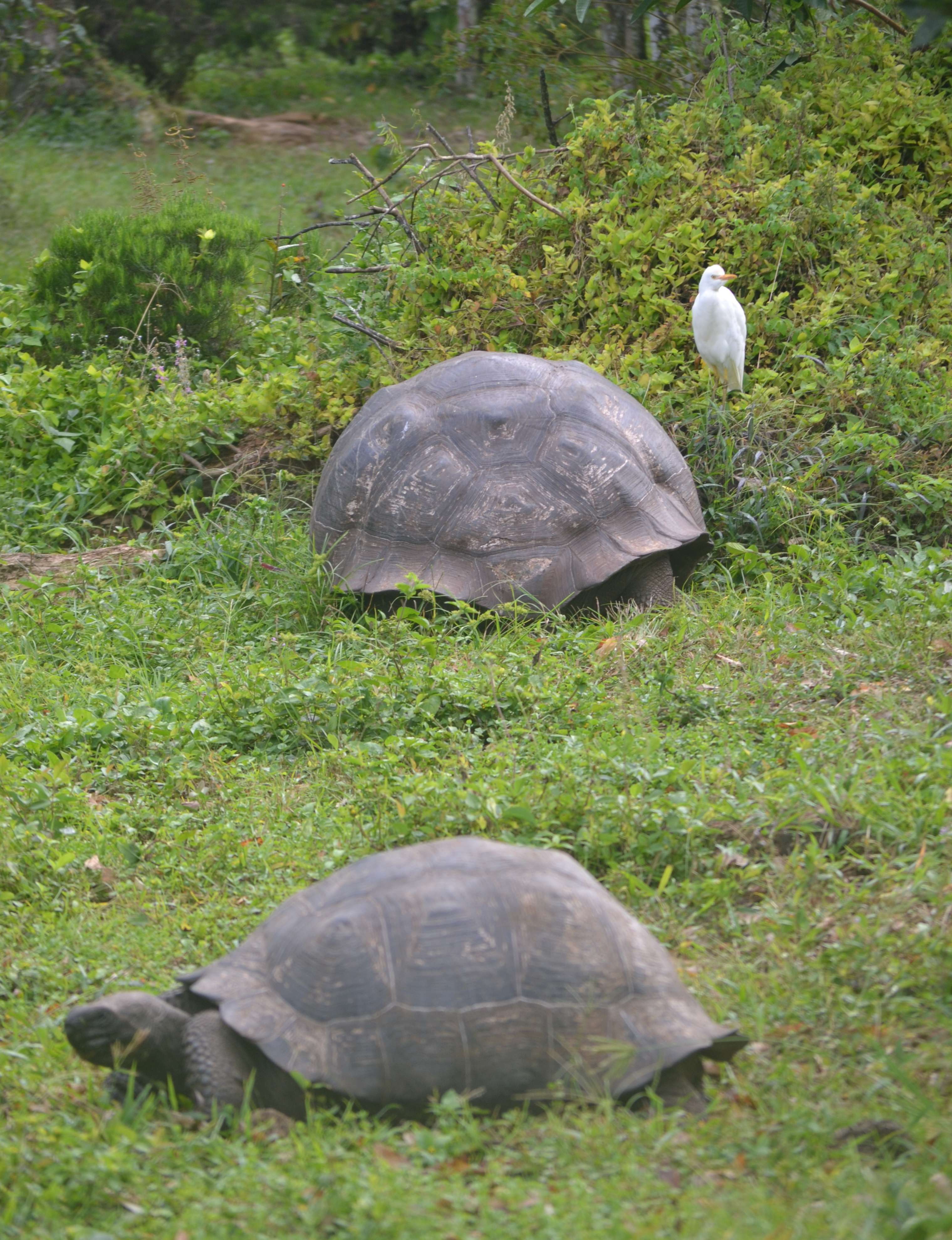 From there we continued around a few of the loops, spotting tortoises near the path and out in the fields. There were also lots of birds around, and we saw quite a few cattle egrets hanging around the grazing tortoises. We even saw one trying to catch a ride (albeit a very slow one) on the back of a giant tortoise. (Unfortunately we were too far away for my zoom to catch it and he flew off when we got closer.)