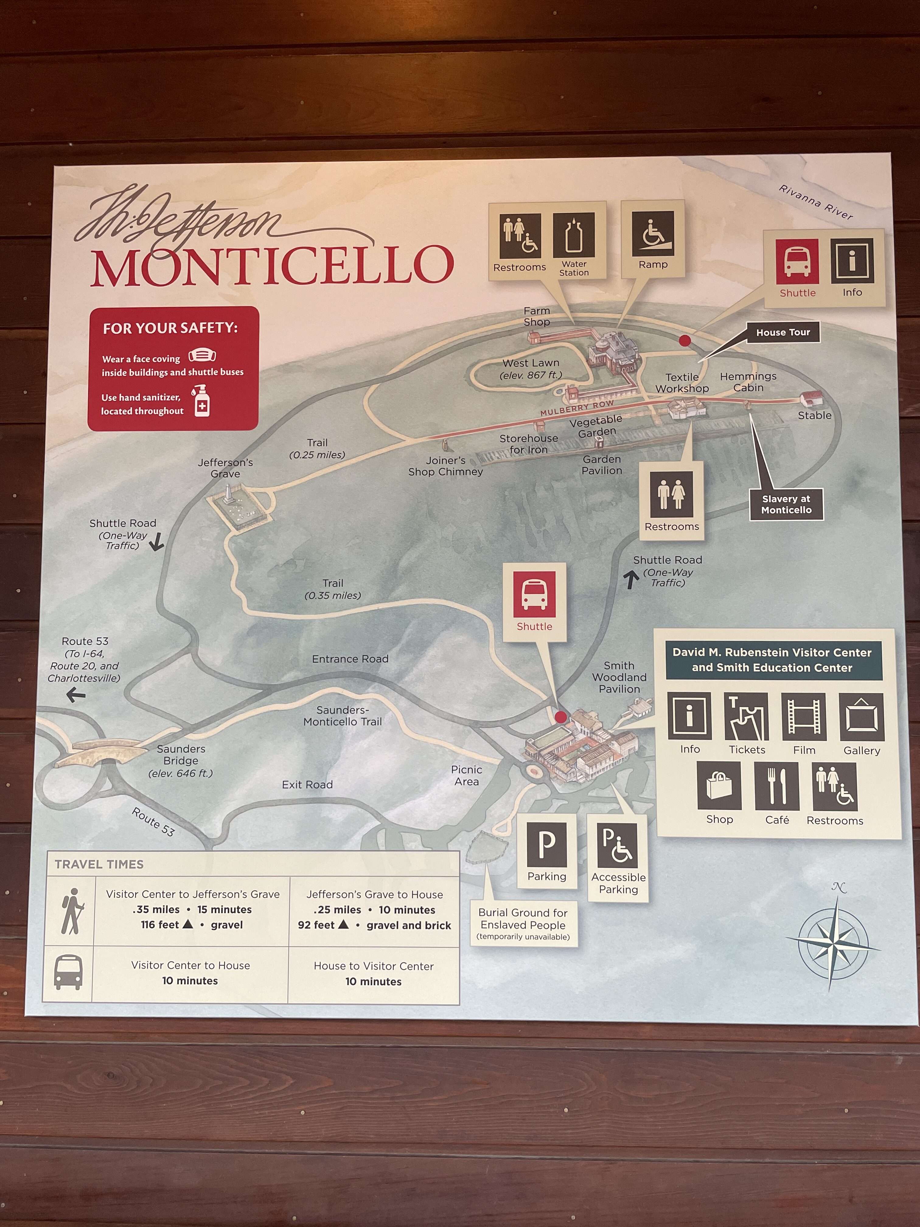 Parking is free and plentiful. After parking, you have to walk up to the visitor’s center, where you can watch a short film, visit a few exhibits, and of course browse in the gift shop. To get to Jefferson’s home, you have to take a shuttle from the visitor center up to the house. Tickets are checked and bags screened prior to boarding the shuttle.