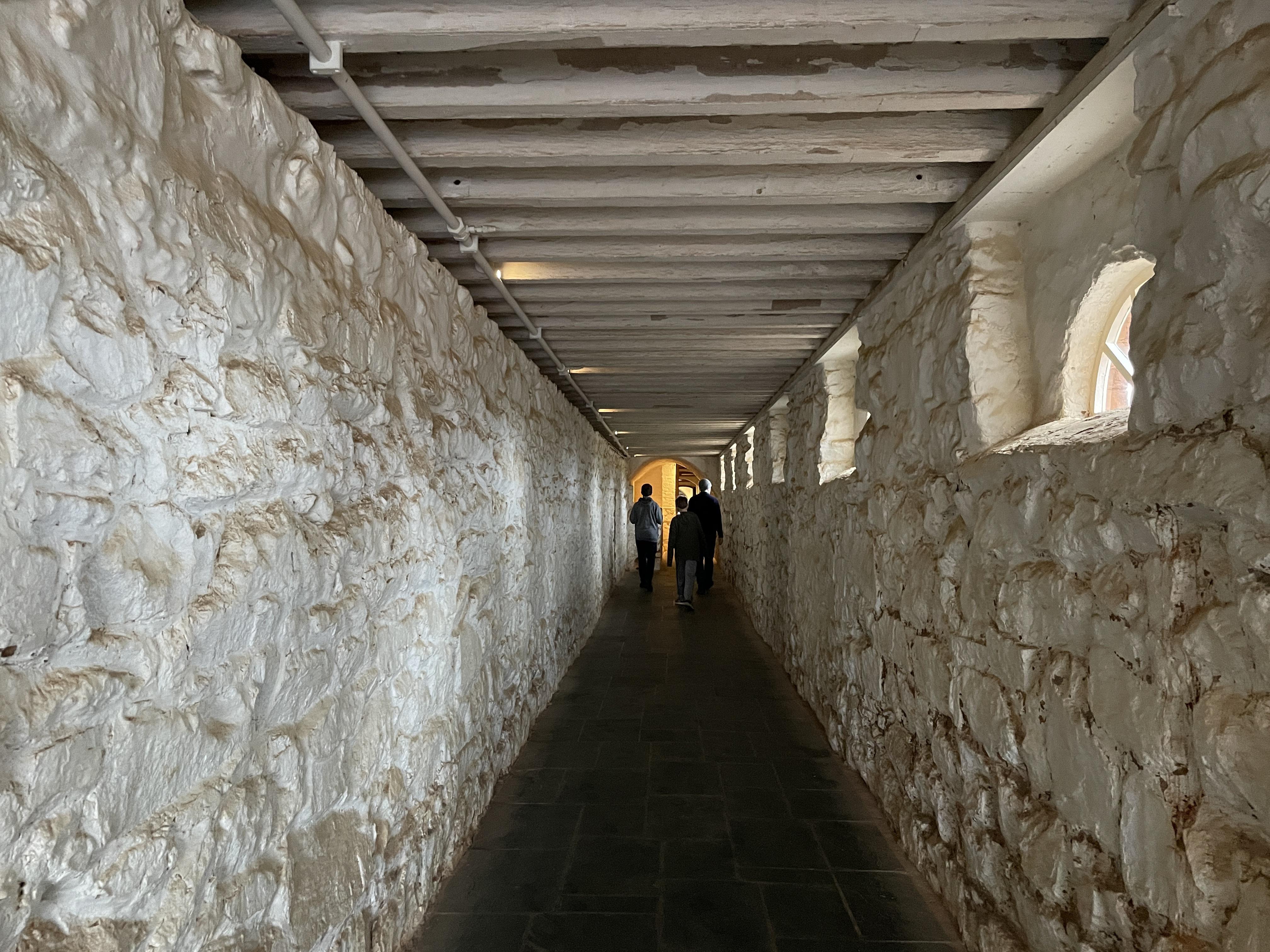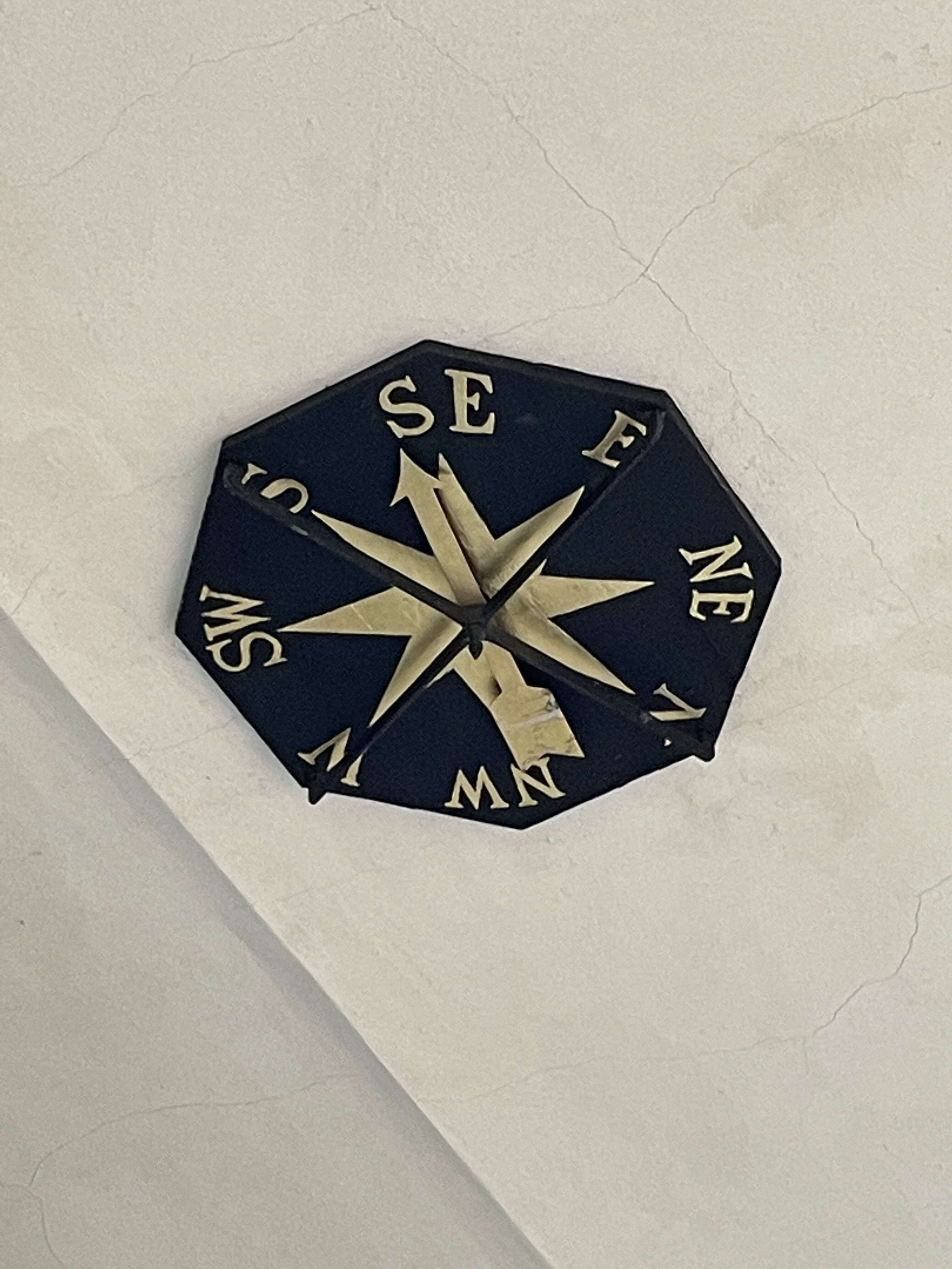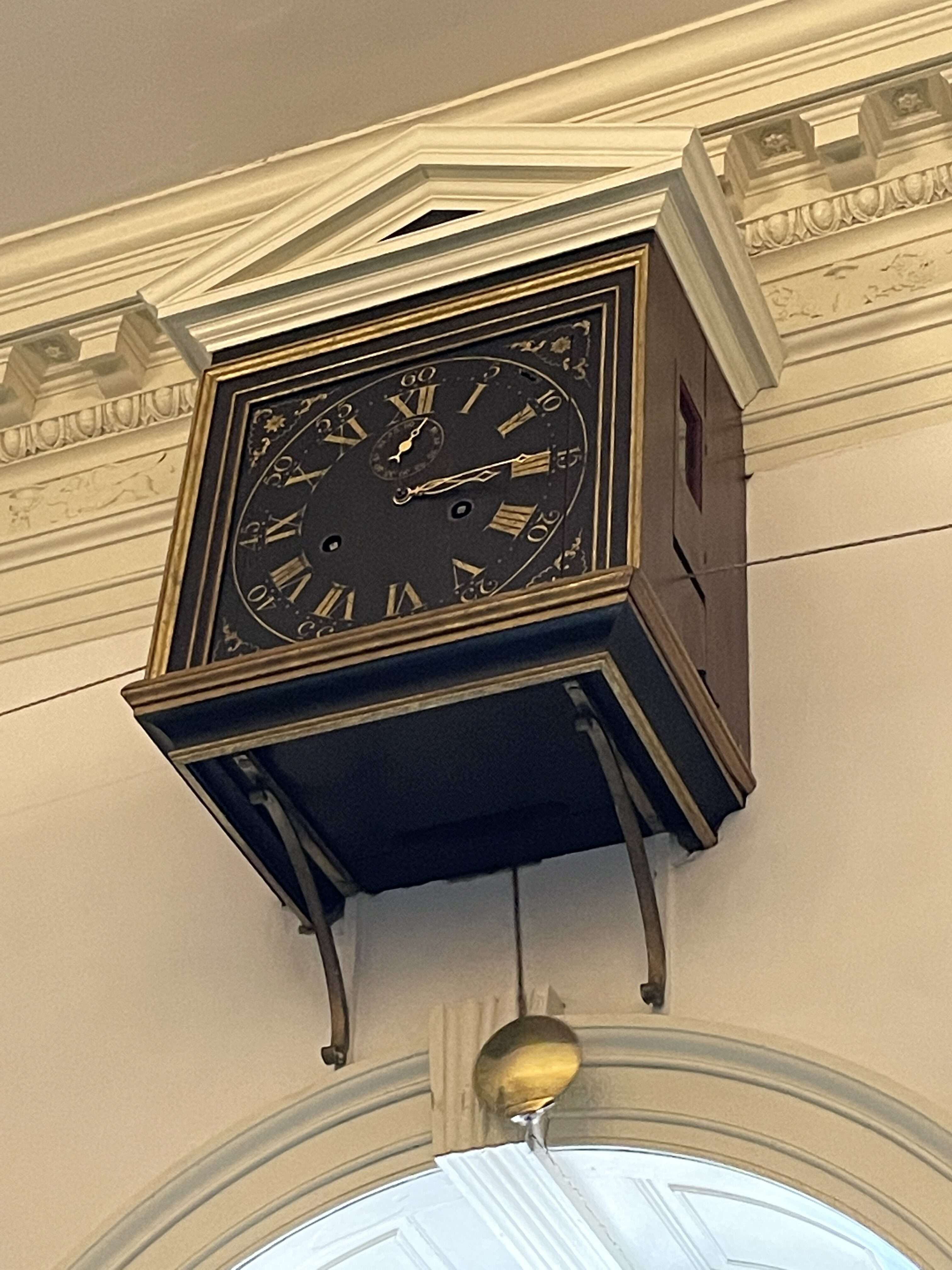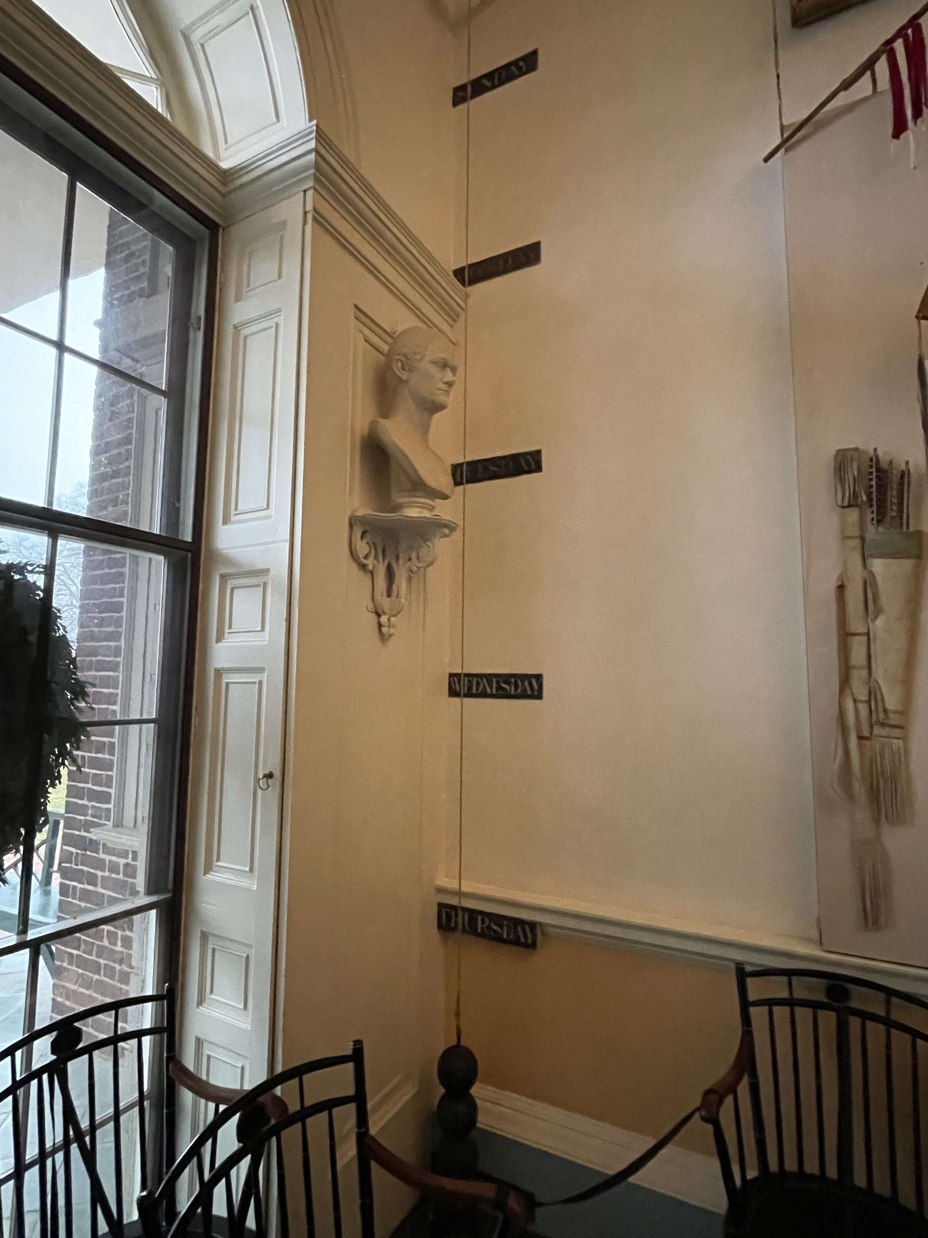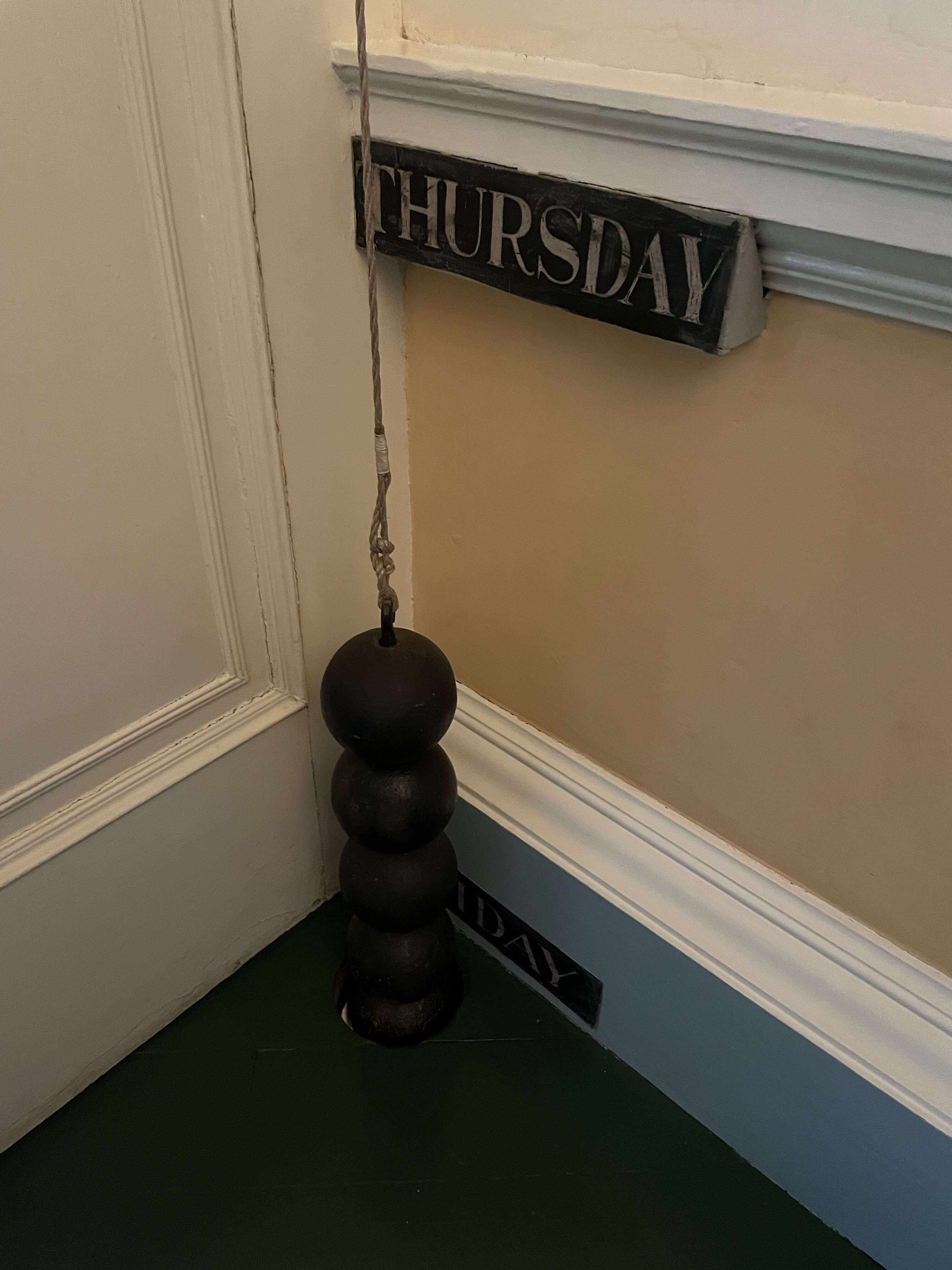 The clock was built in 1792 and is still operational today. It is powered by several 18 pound round weights that are attached to the ends of the rope. There are labels on the right hand wall marking the different days of the week. Rewound every Sunday, the balls start at the top of the wall and descend over the course of the week, with the top ball marking the current day. The design was ingenious but there was an issue found upon installation – the ceiling wasn’t tall enough to allow for the full length of the rope to measure all of the days of the week. The solution was to cut a hole in the floor to allow the balls to continue their descent and place the marker for Saturday in the basement.