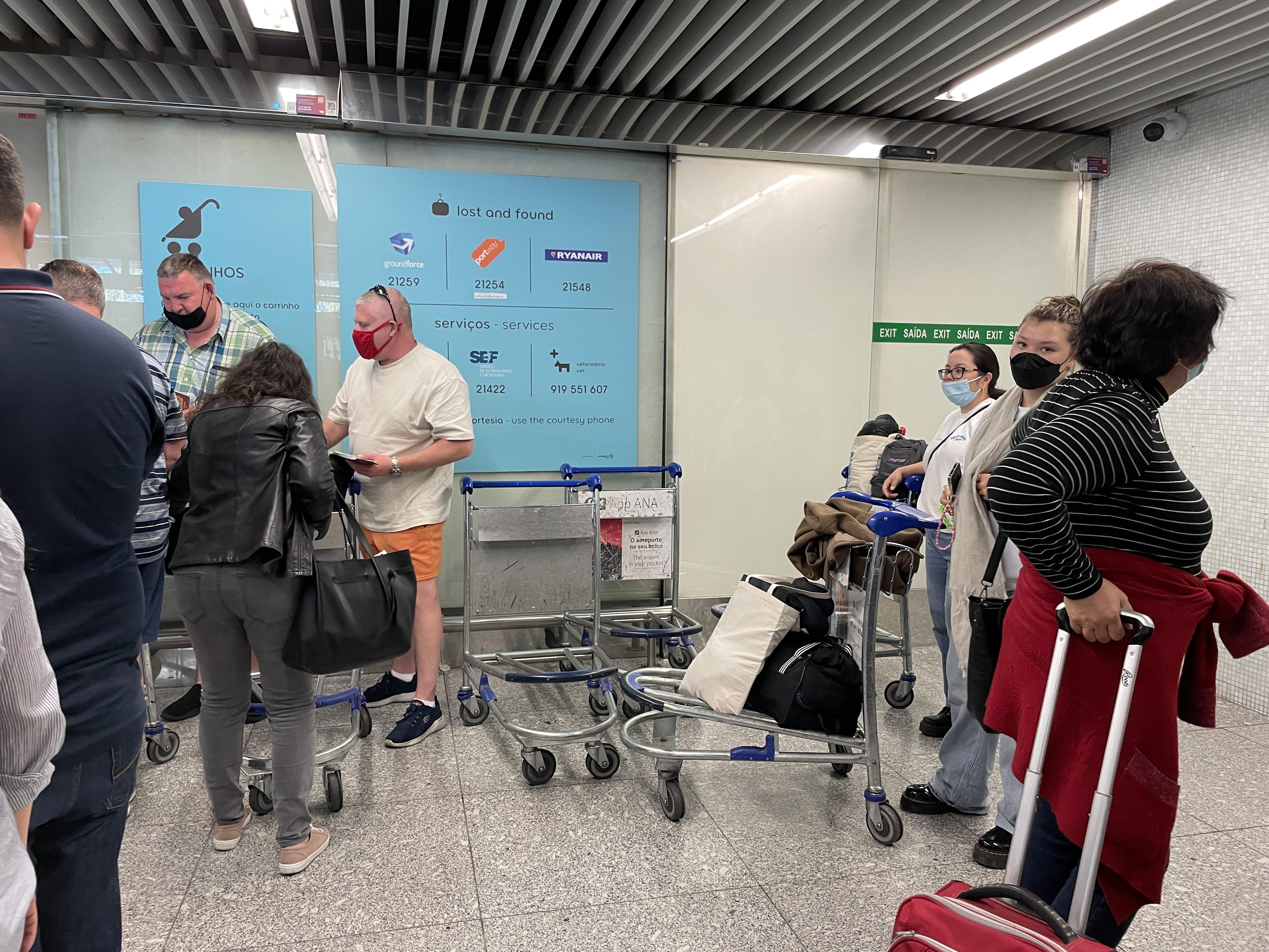 We went to the spot where baggage claim exits into the unsecured part of the airport and talked to the security guard stationed there. He pointed behind me to two phones – one for Portway and one for Groundforce, the two baggage handling companies. But there was something else behind me… a lot of frustrated looking people.