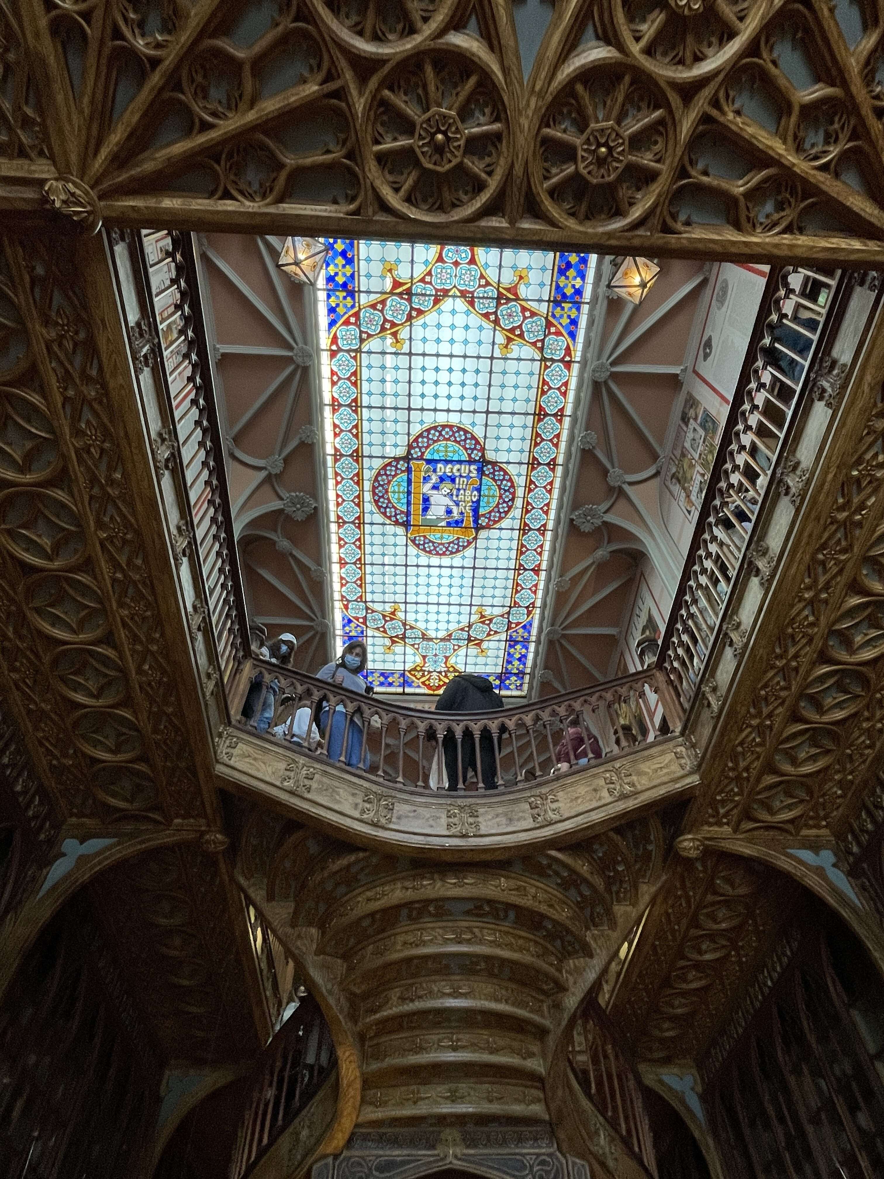 While the interior is the reason that most people visit, the exterior should not be overlooked. And trust me – you’ll have plenty of time to study it while you wait on line! Designed by Jose Bielman, the Neo-Gothic exterior facade of the bookstore features two figures on either side of the windows that represent Art and Science. Below the windows in an ornate Gothic font are the words “Lello & Irmao”, or Lello & Brother, and below that in the window are the words “Livraria Chardron”, a nod to the original owner of the bookstore, Ernesto Chardron.