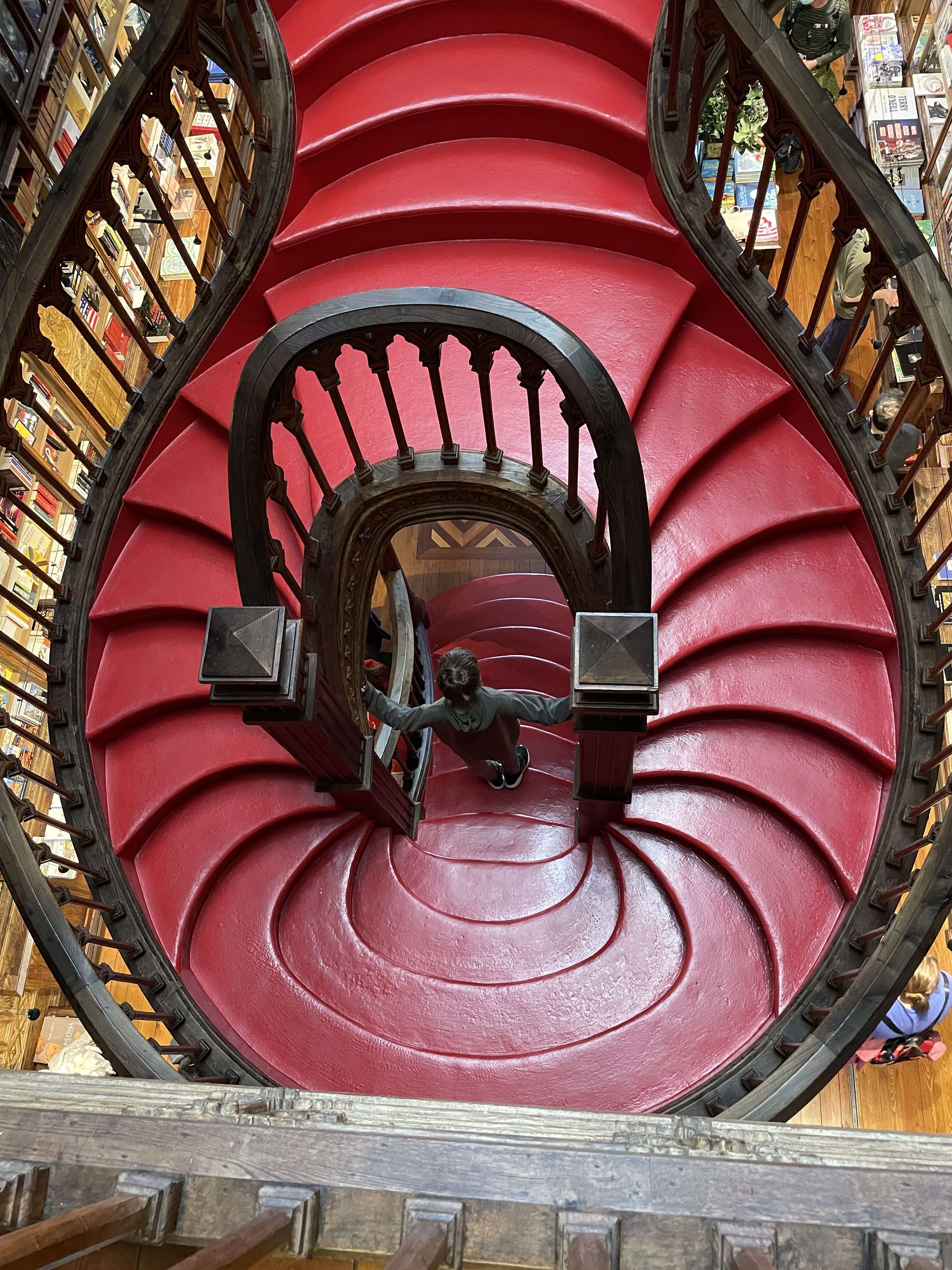 The bookstore’s main attraction is its stunning red spiral staircase. Upon entering the store, the staircase is straight ahead in the center of the store and is immediately captivating. But it really must be seen from every angle to truly appreciate it. The stairway splits and spirals in both directions before meeting together and splitting again, creating a dizzying impression from above. From below you can admire the intricate designs adorning the bottom of the stairs. Although they look like ornate wood carvings, they are actually made of painted plaster.