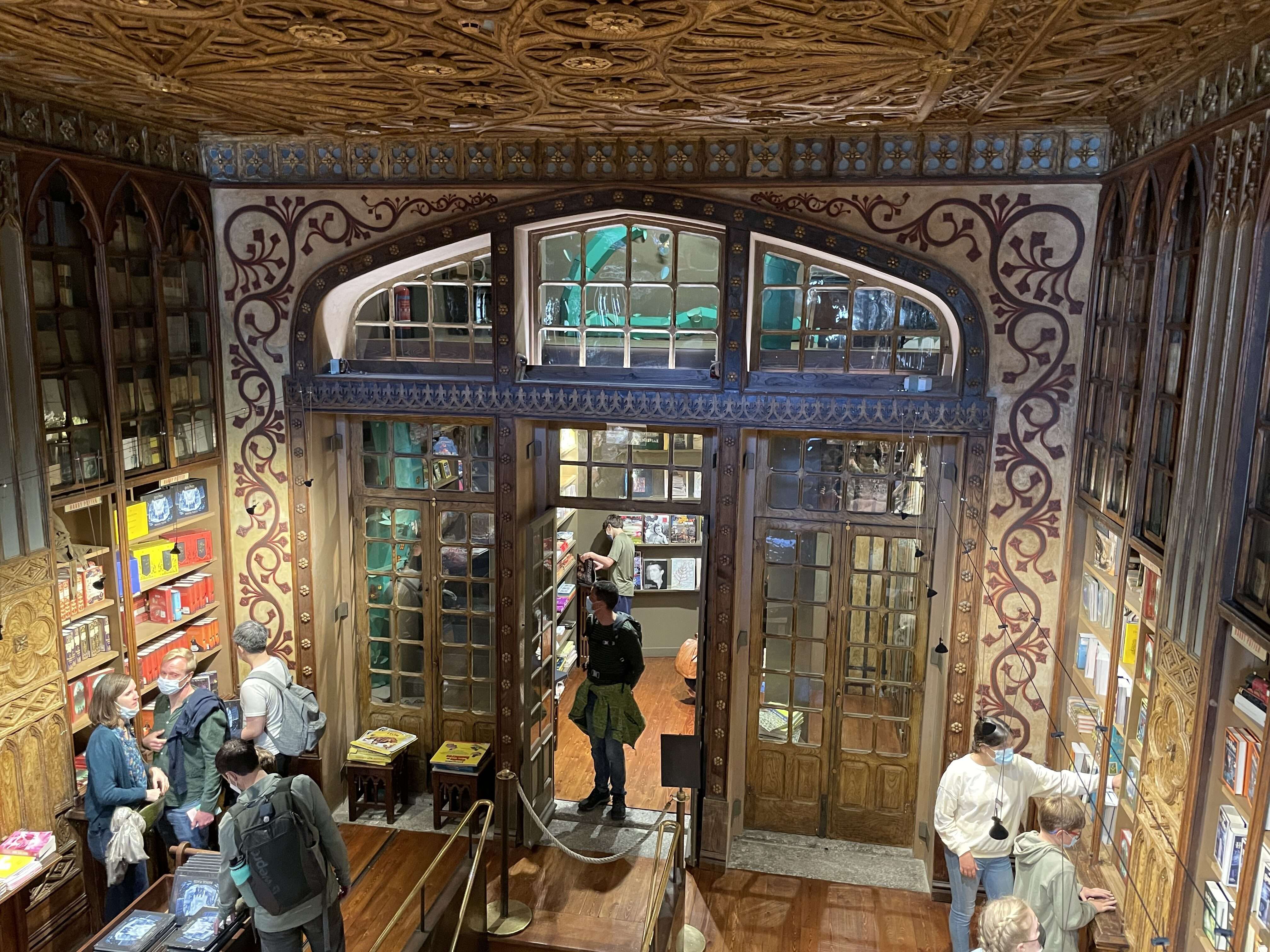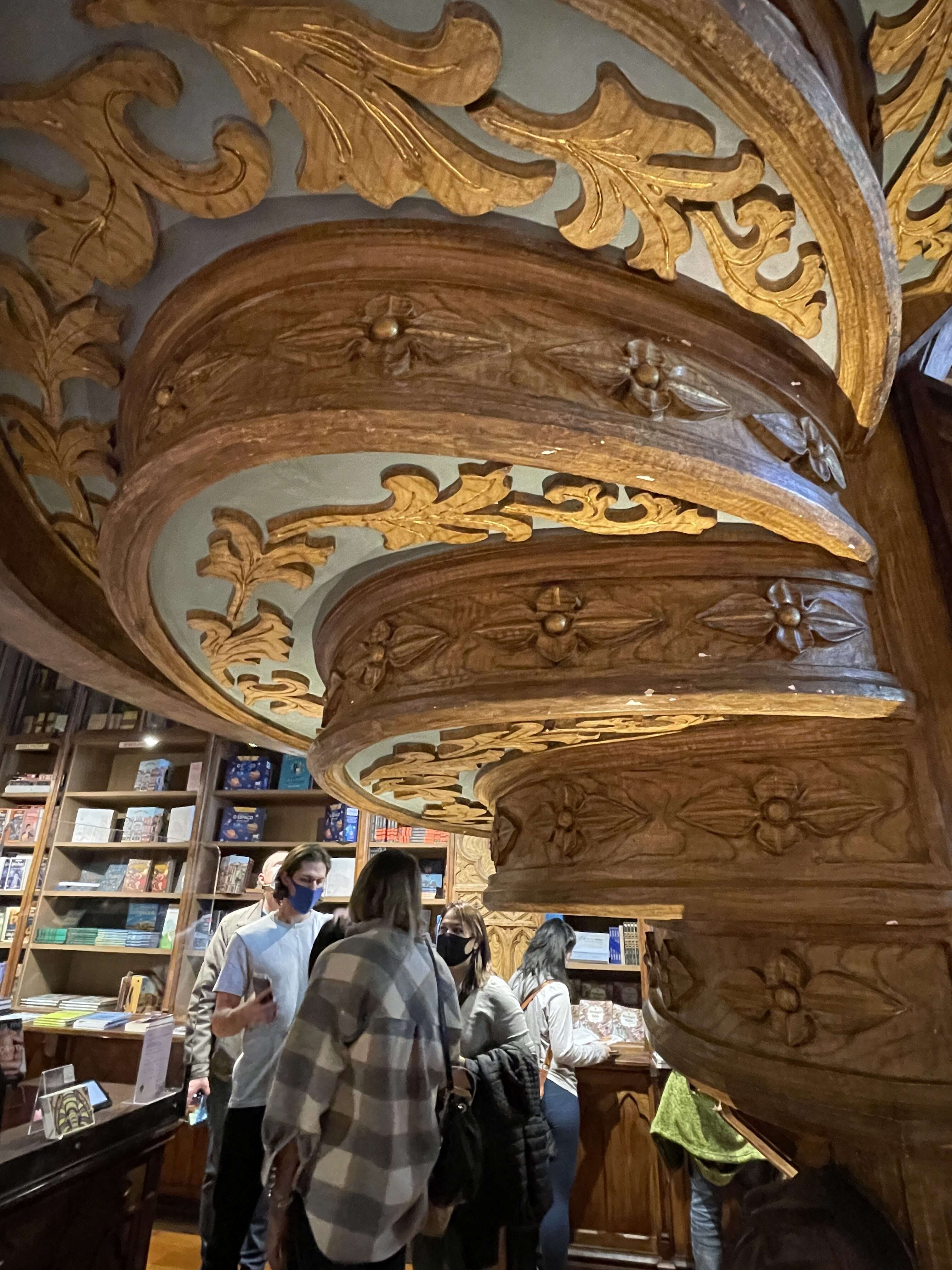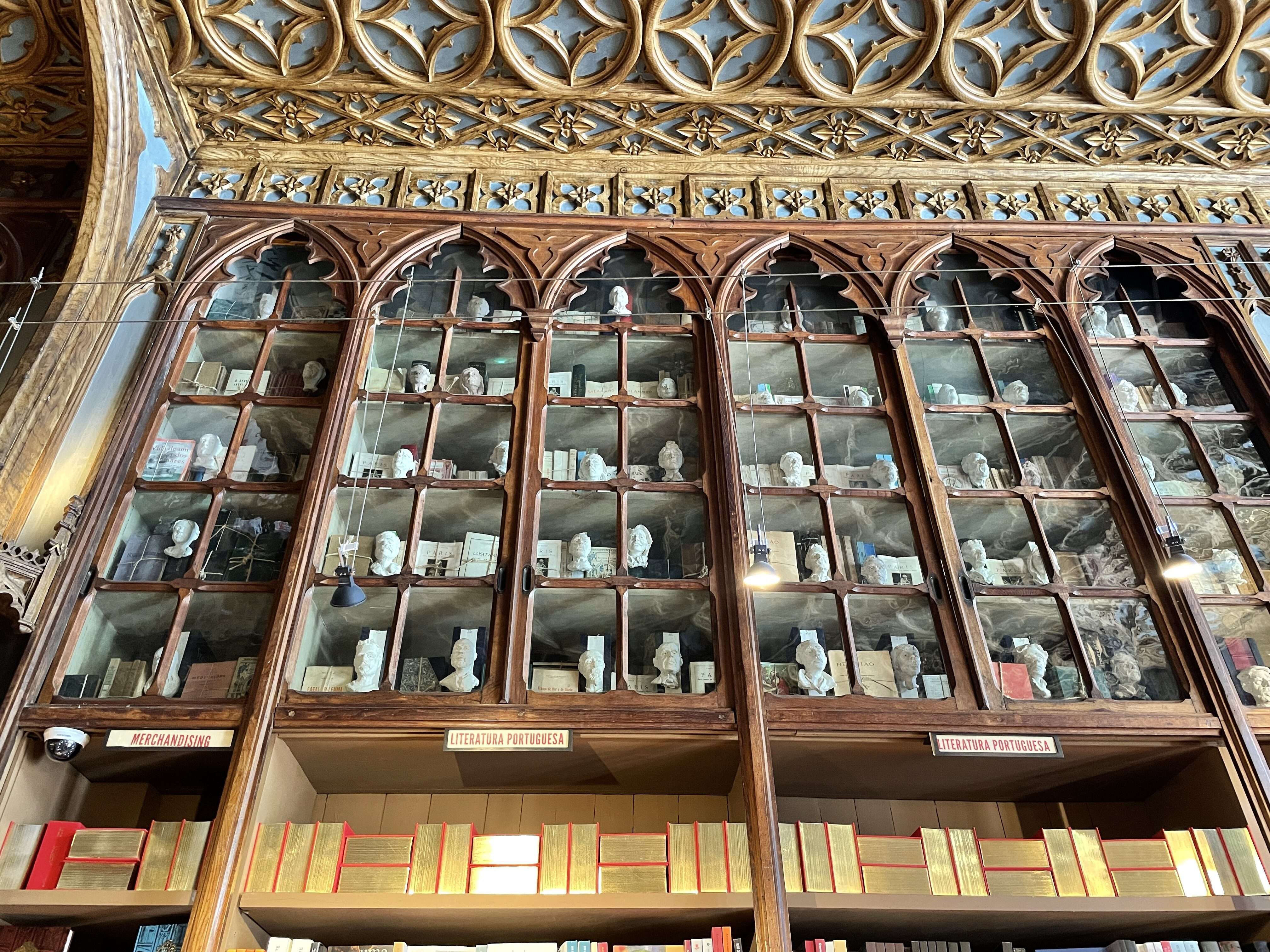 There are numerous other design details throughout the store that make it so unique and so interesting to explore. Triangular light fixtures hang from intricately carved wooden posts. The ceilings and walls are covered with plaster designs emulating intricate wood carvings. Clay busts of famous Porto citizens line the shelves. Tracks for the book trolley are still embedded in the floor. Every square inch is covered with a unique design or architectural feature that would take days to fully explore.