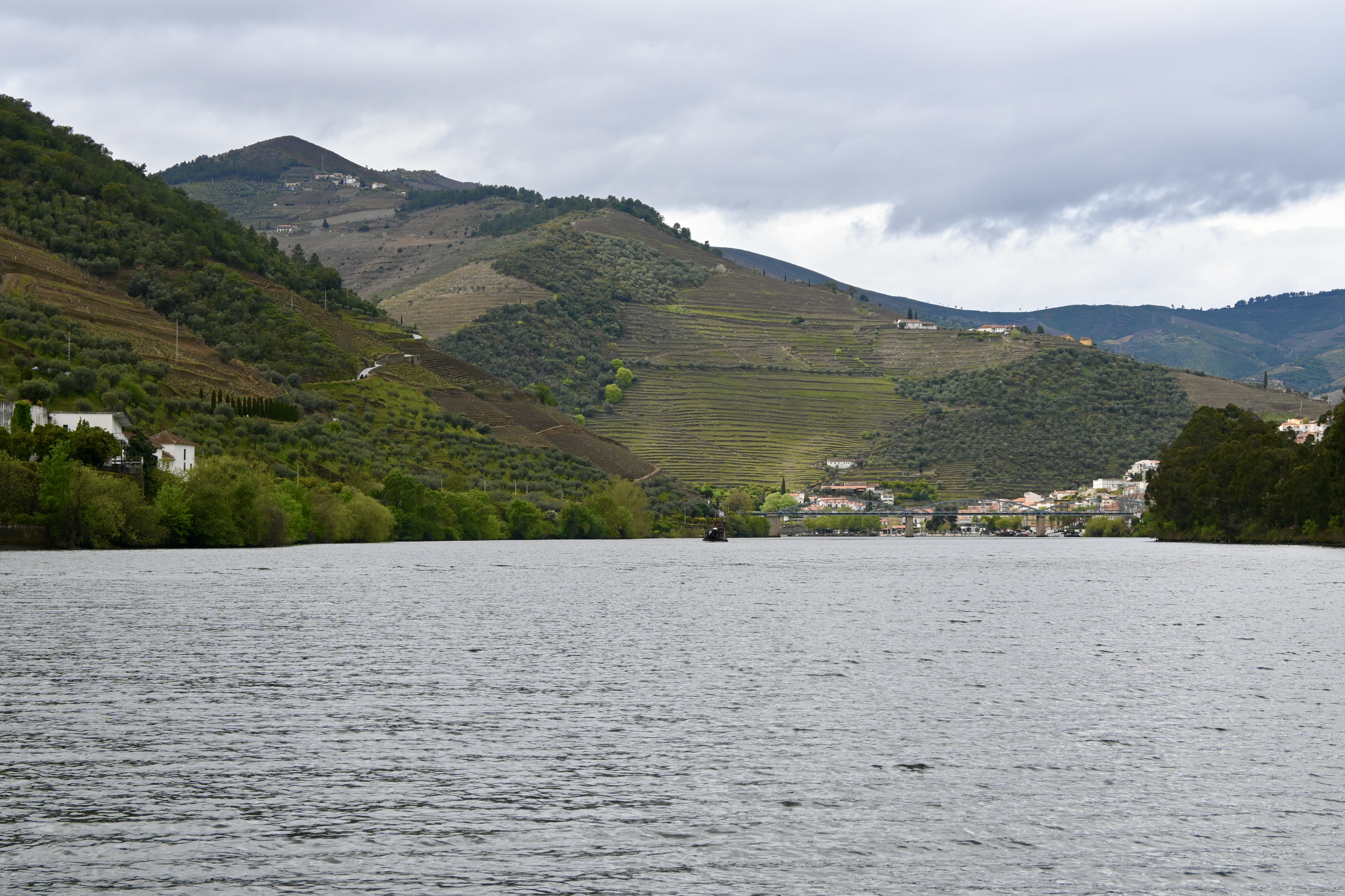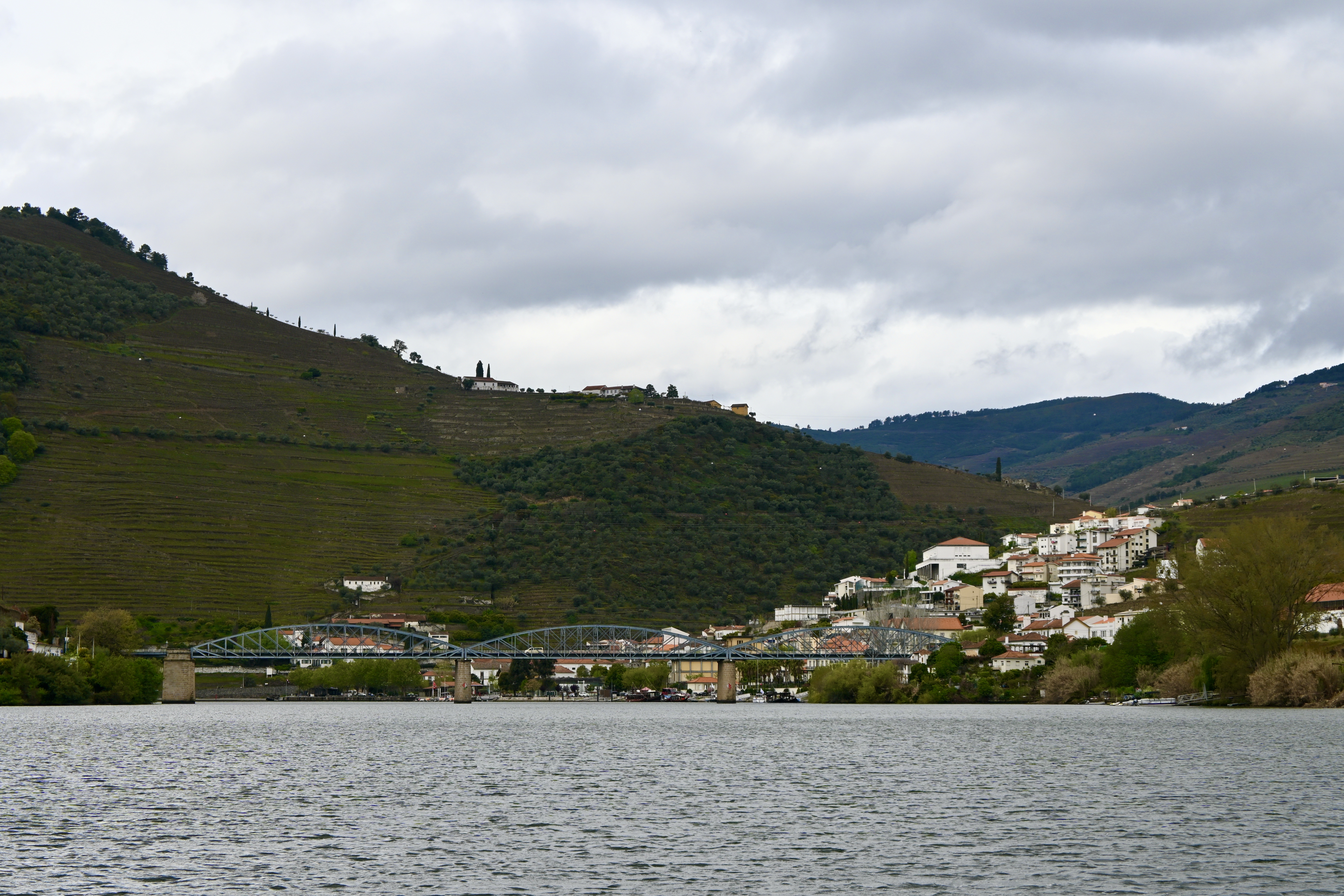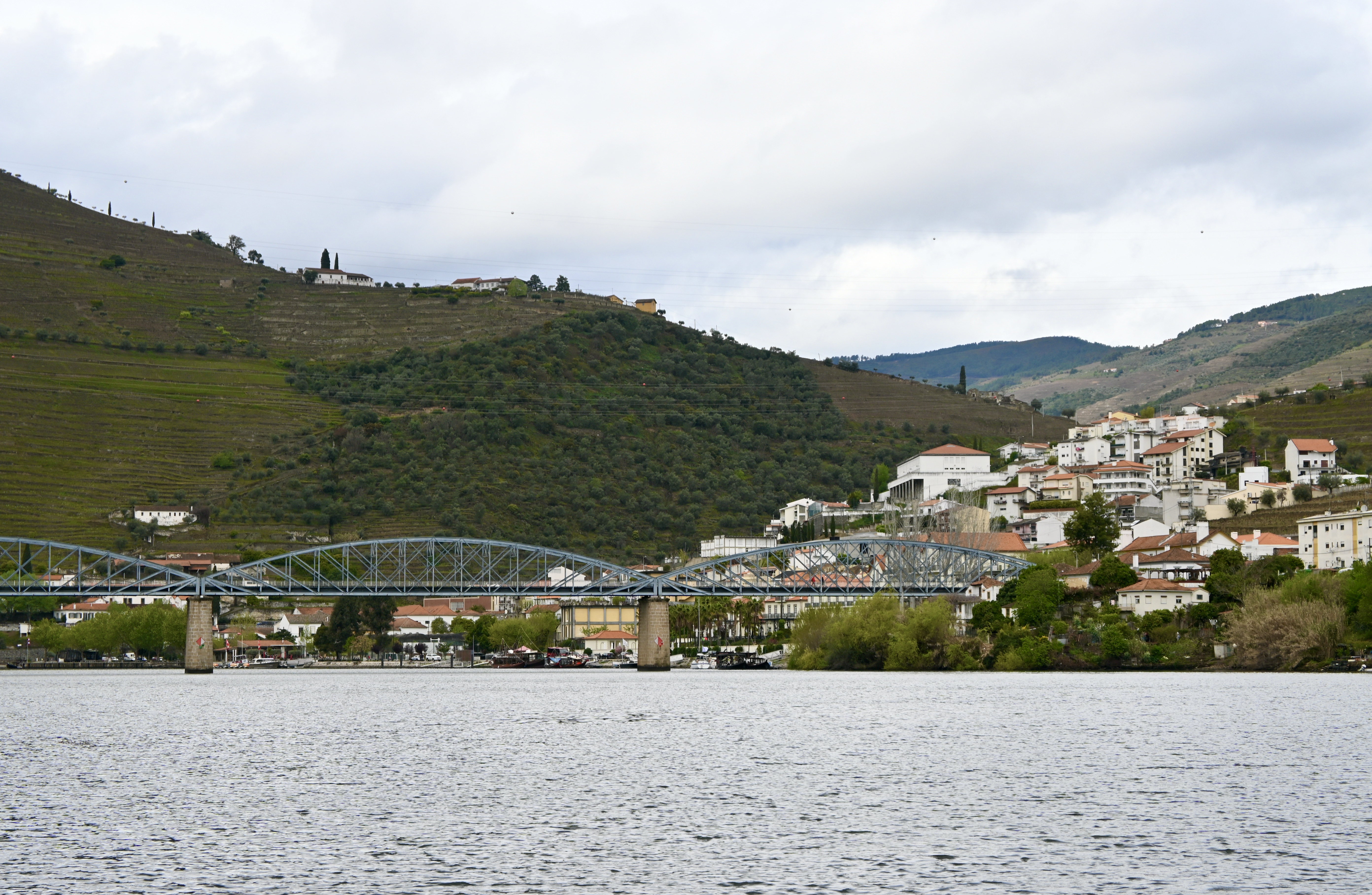 After less than half an hour, we turned around and headed back to Pinhao. I enjoyed the scenery as we approached the town. Beyond the bridge, the town’s white buildings with red roofs climbed the slopes, popping against the green and brown hillsides.