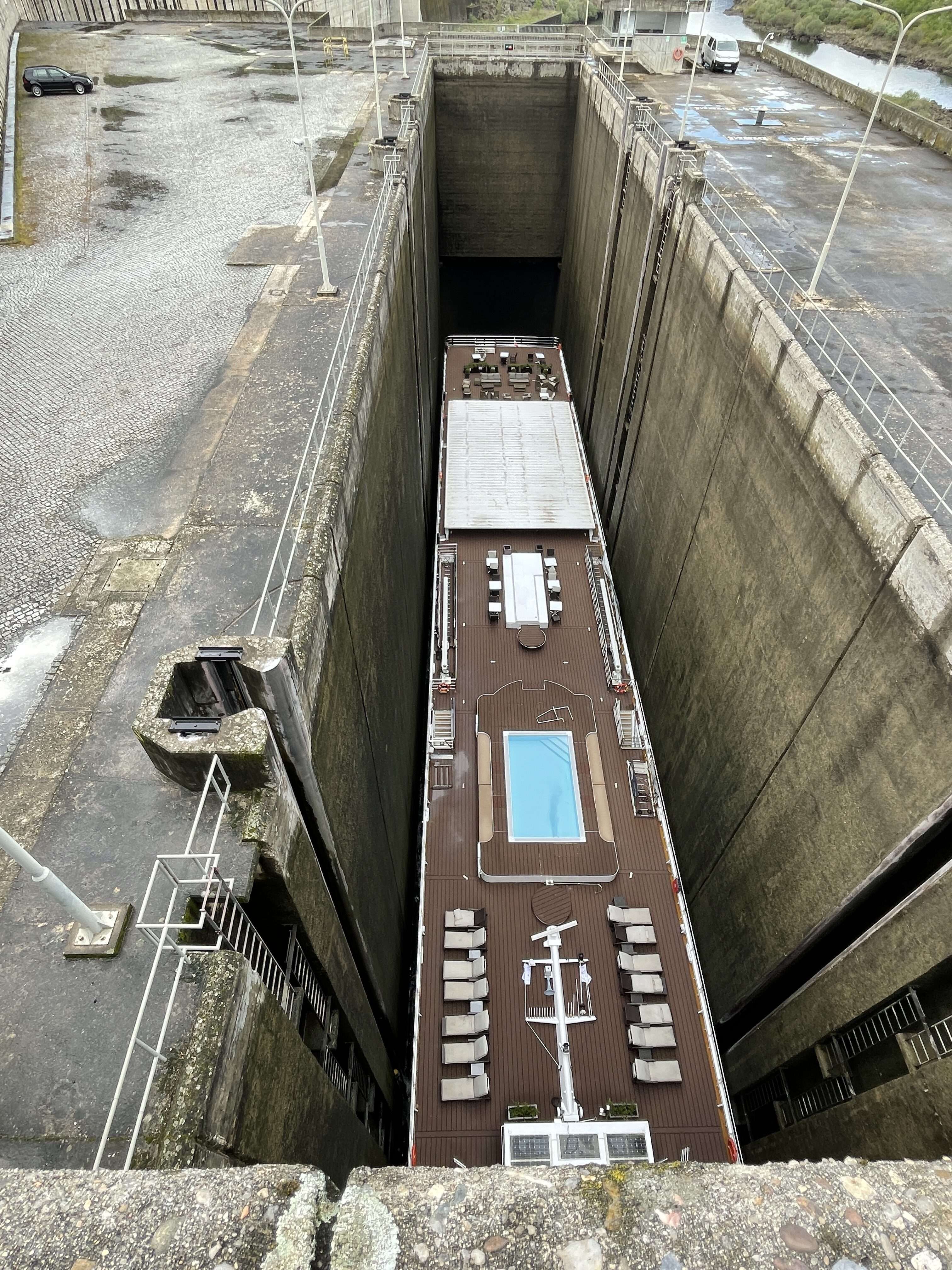We had one more unplanned but really interesting stop on the drive home. Historically, the Douro River was very rough and difficult to navigate. In order to make it easier for boats to travel the river, several dams were installed in the late 1960s. Since water levels vary on either side of a dam, locks are used to raise and lower boats to the different levels of the river. We got to see a river cruise ship in a lock being raised up to the higher side of the river. It was incredible! The boat navigated into a very narrow chamber, where it was closed in so that water could be pumped in to raise it to the level above the dam. I could not get over how narrow it was in the chamber. It was so cool to watch the process from above, and it must have been an amazing experience to be on board the boat when it went through the locks.