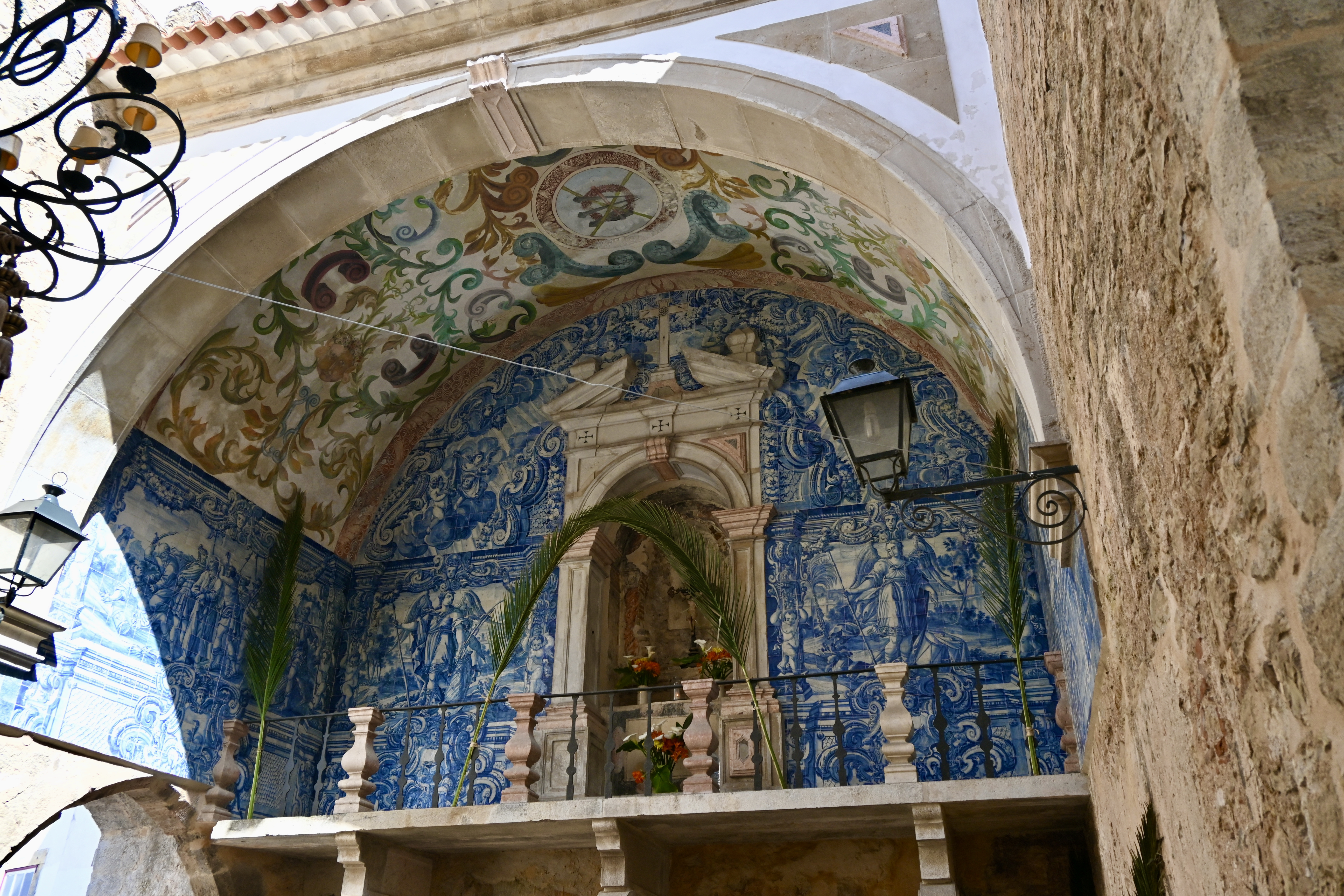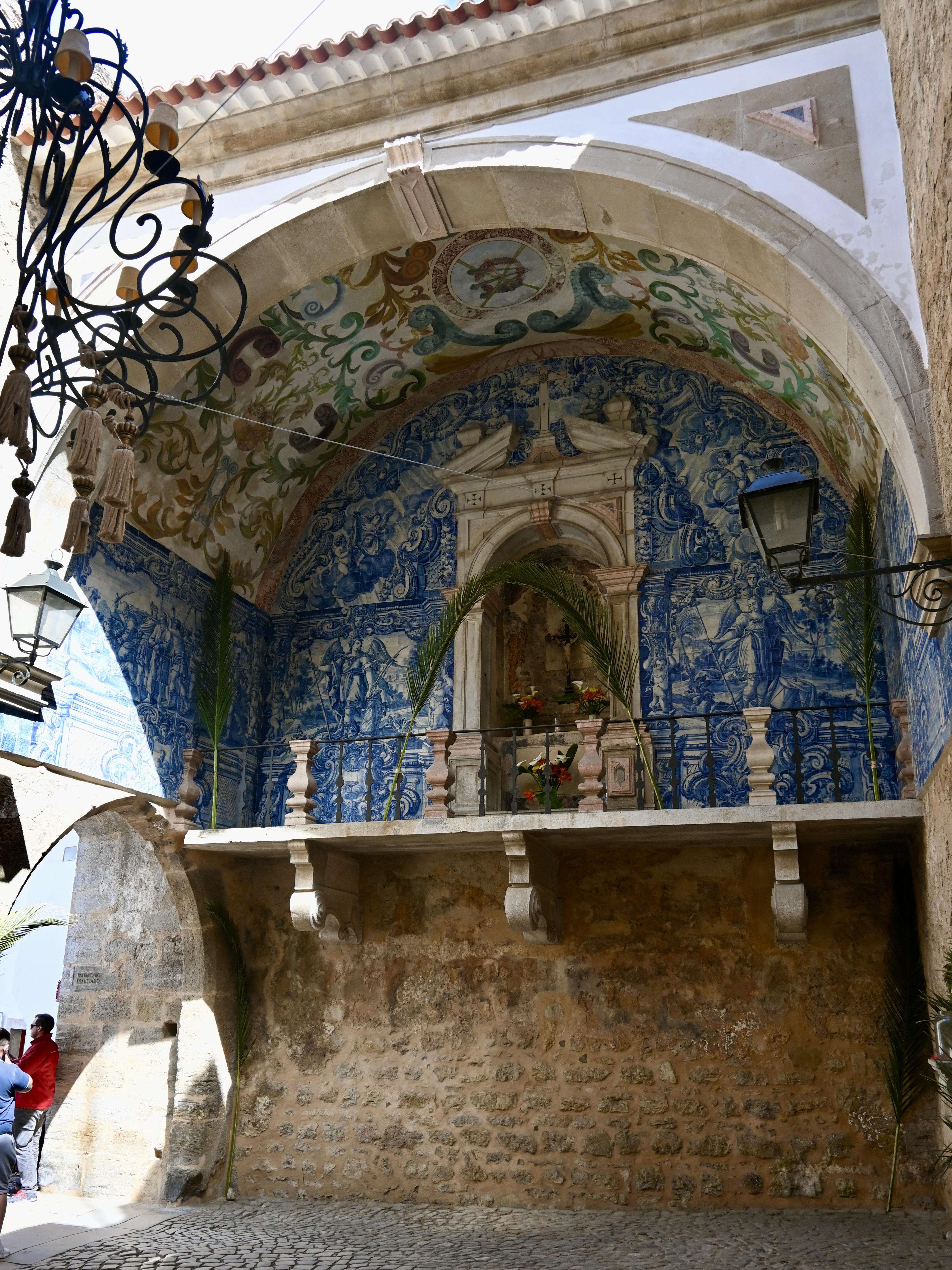 The entrance to the city is actually made up of two arched gateways, staggered in an elbow formation in order to defend the city against direct attack. The pretty entryway between the two gates features a balcony oratory decorated with blue and white azulejo tiles depicting the Passion of Christ.