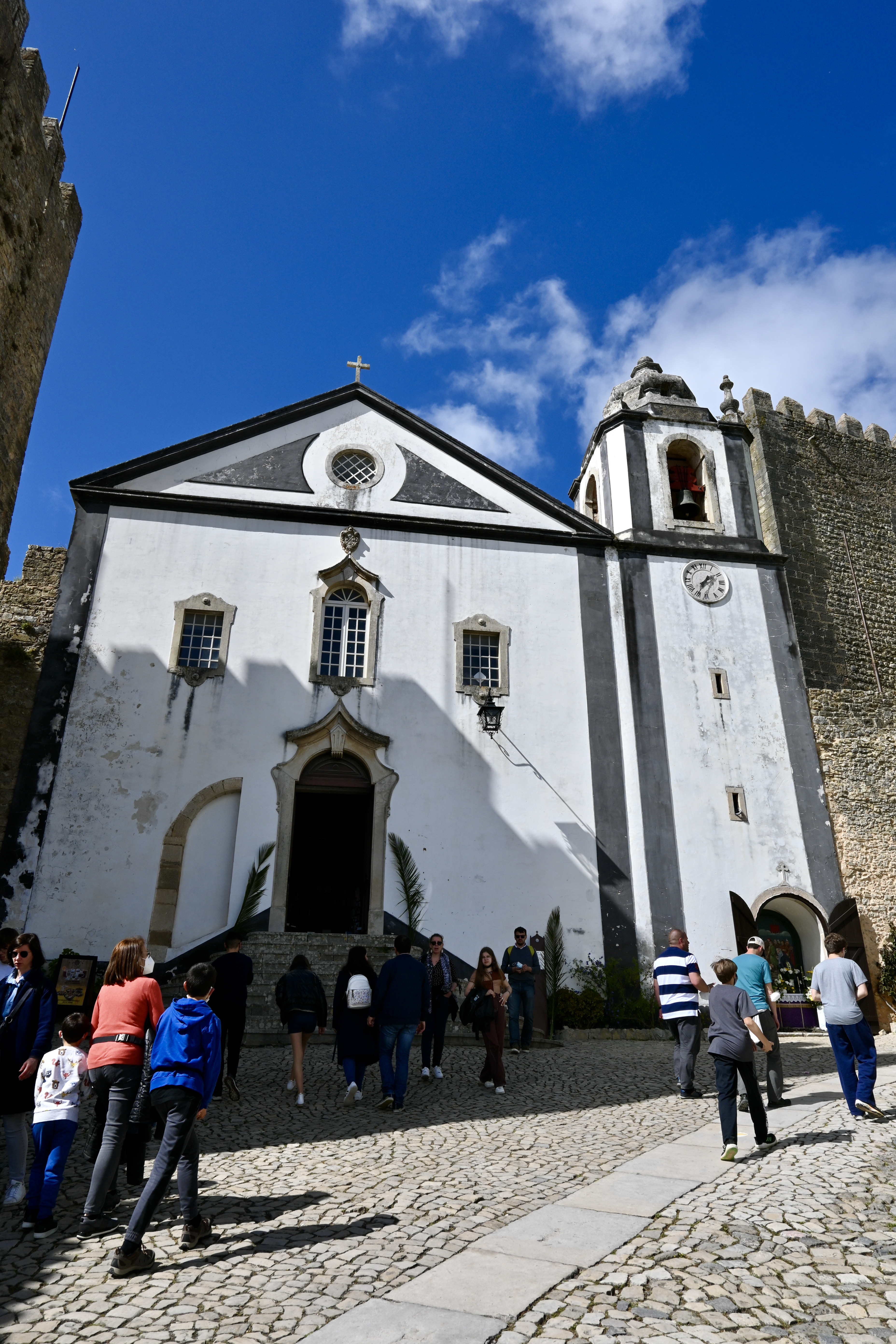 Igreja de Santiago is located at the end of Rua Direita, next to the entrance to the castle. It is built into the castle walls and its white facade stands out against the gray stone walls that abut it. The original church was built in 1186 and was connected directly to the inside of the castle, making it easily accessible to the royal family. The church was destroyed by an earthquake in 1755 and was rebuilt in 1772 in a baroque and neoclassical style that varied from its original Gothic design. Today, the church interior has been converted into a bookstore.