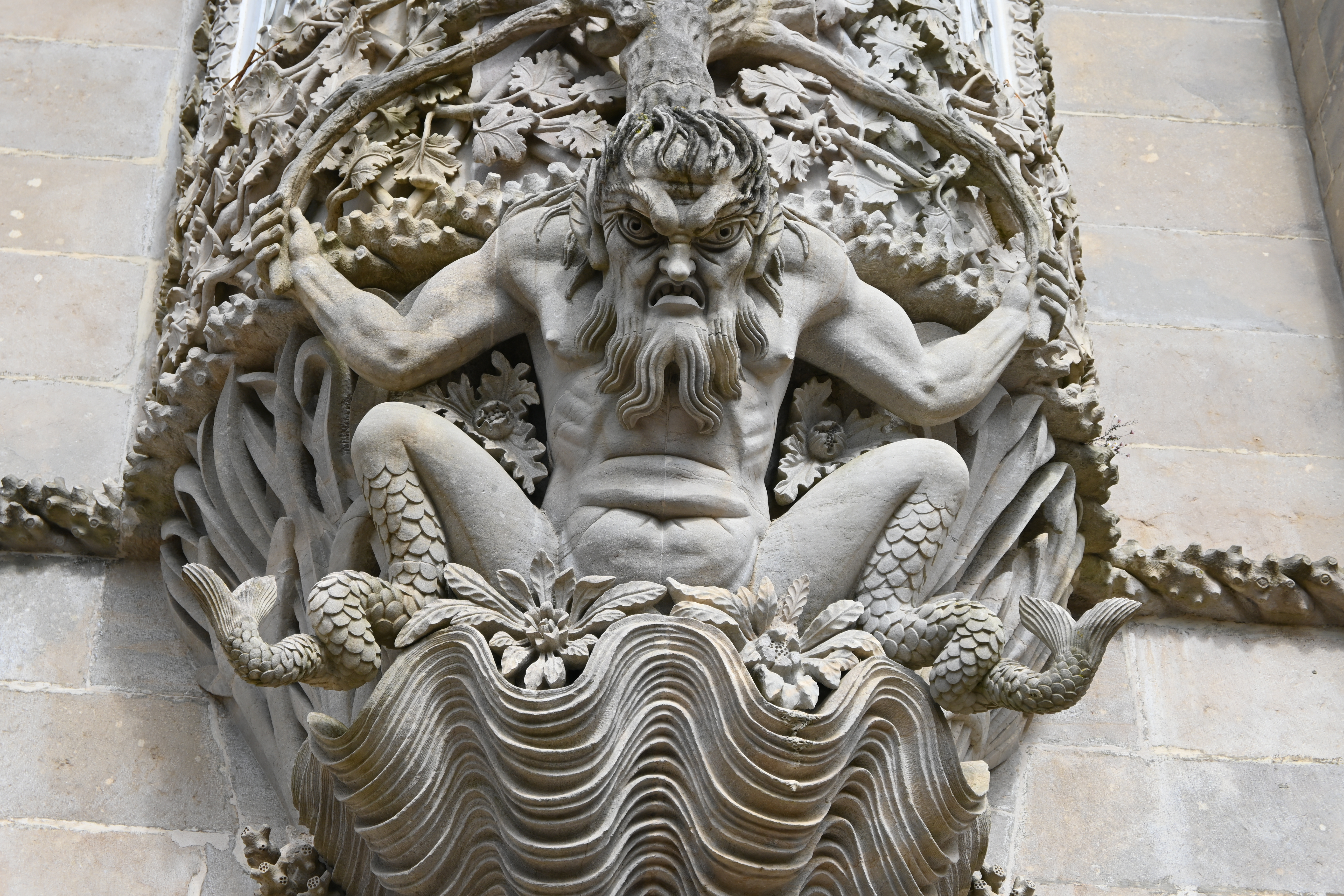 One of the most stunning features of the palace is the Arch of Triton. On a section of the palace that is covered by gorgeous azulejo tiles, a stone merman looks down menacingly over the arched gateway. The statue of triton represents a merging of land and sea. The figure sits on a large conch shell, with coral and waves below him. He is holding a tree on his shoulders, its leaves and branches spreading out above him. It is a truly stunning site and we stood there for quite a while taking in all its details.