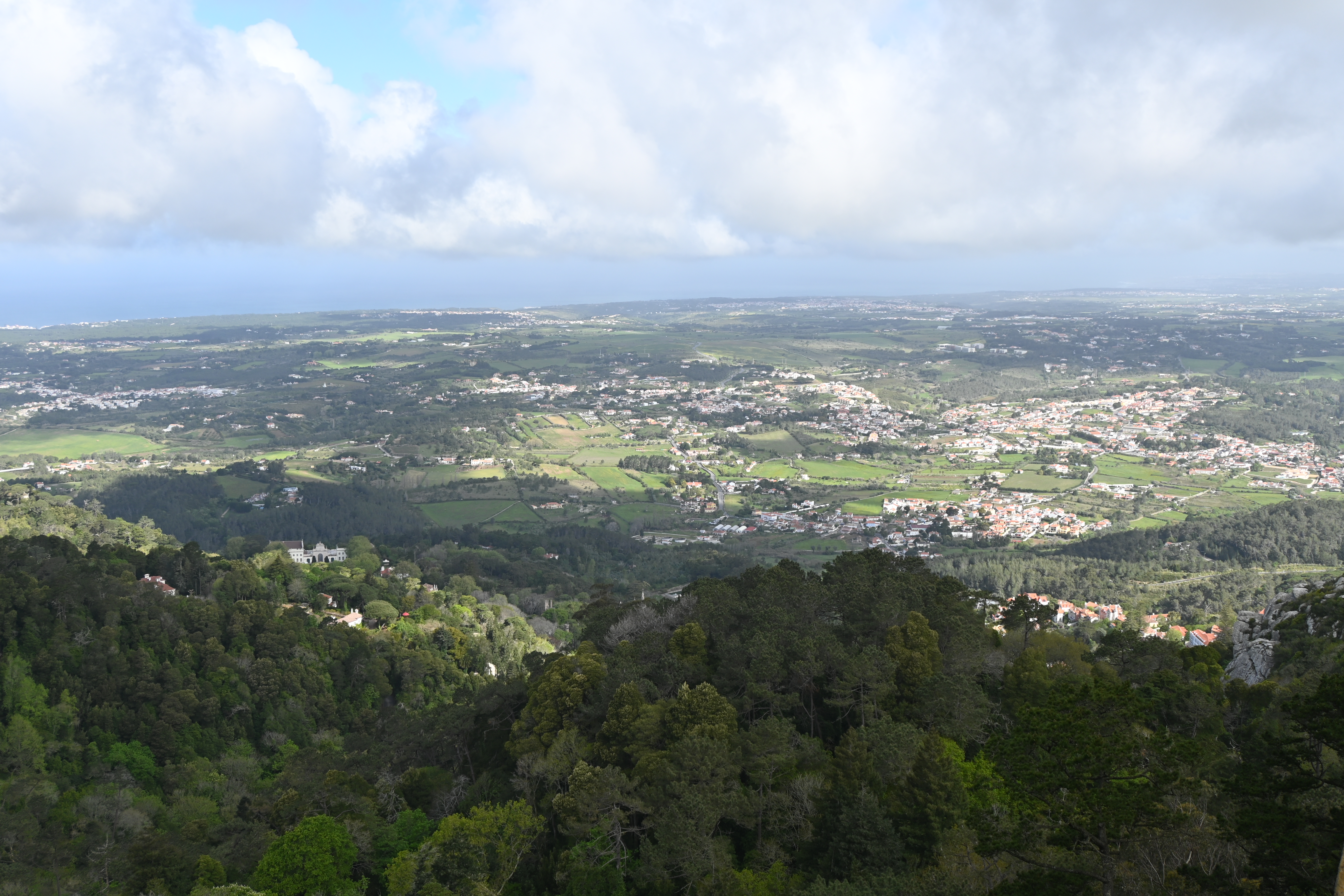 So we took the next set of stairs and headed towards the exit. We headed back to the Courtyard of Arches so that we could walk around the outer wall of the castle. From here we got a great view of the Moorish Castle, as well as a cool side view of Pena Palace. Oh – and a view of the line to tour the interior snaking well outside the palace entrance!