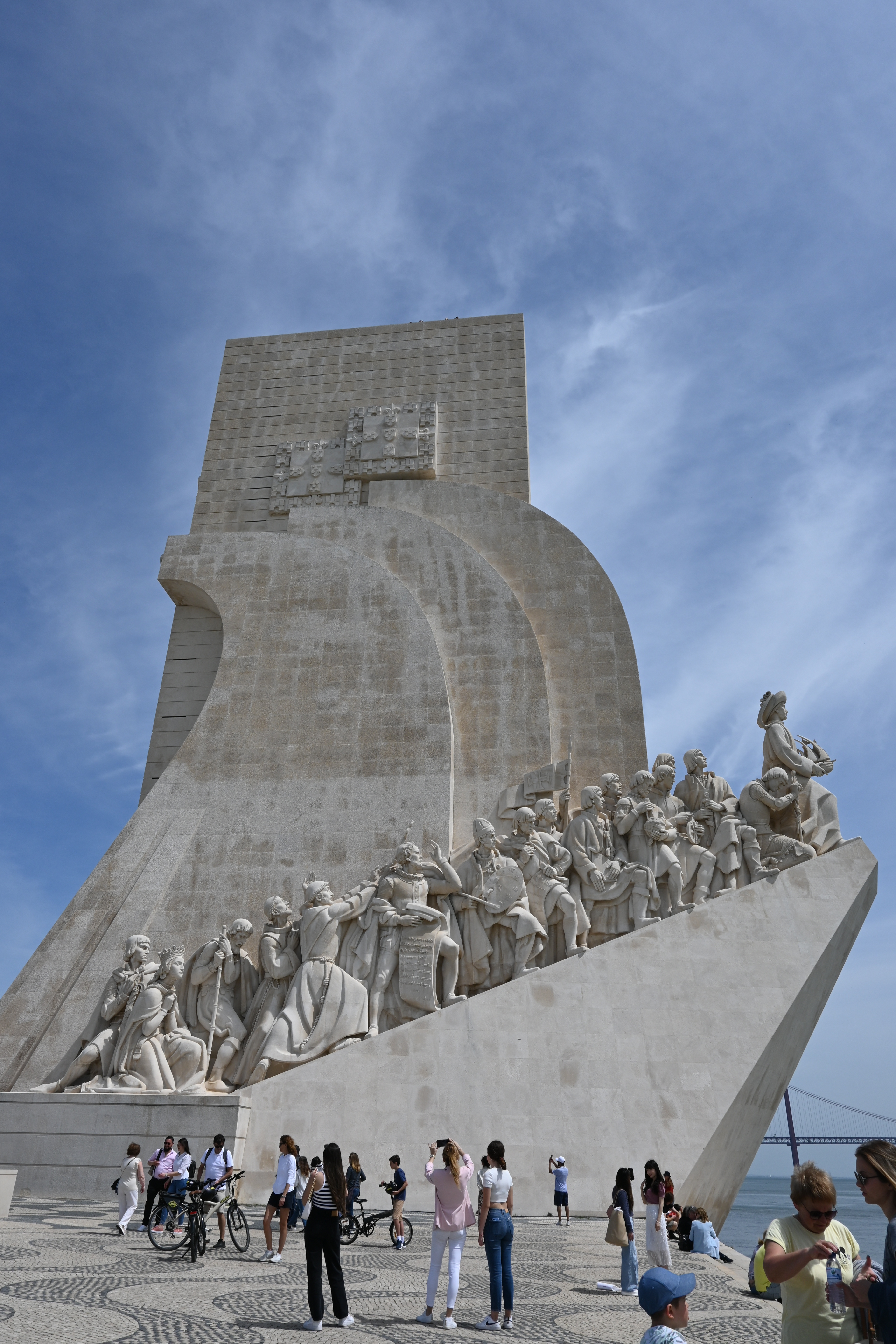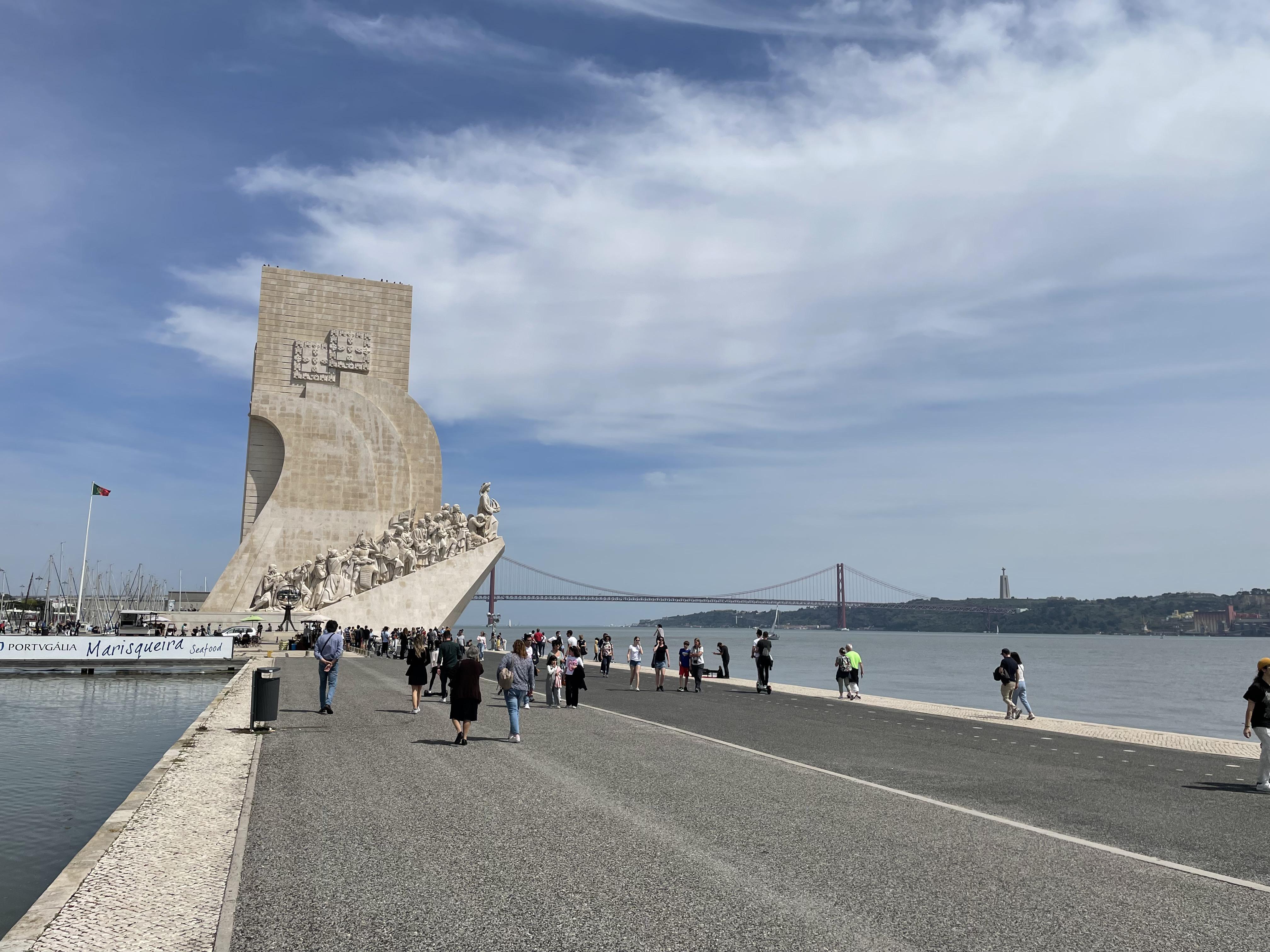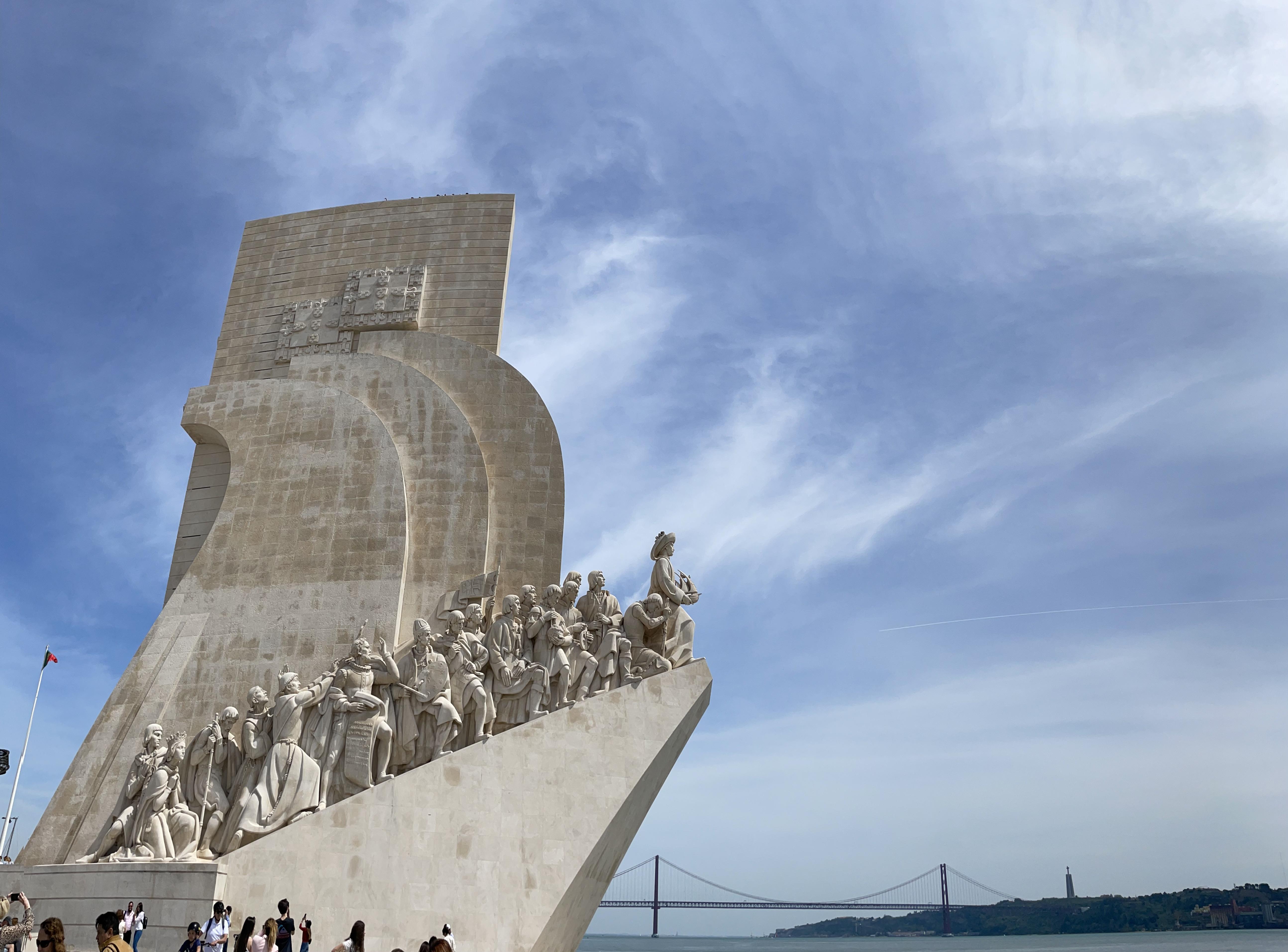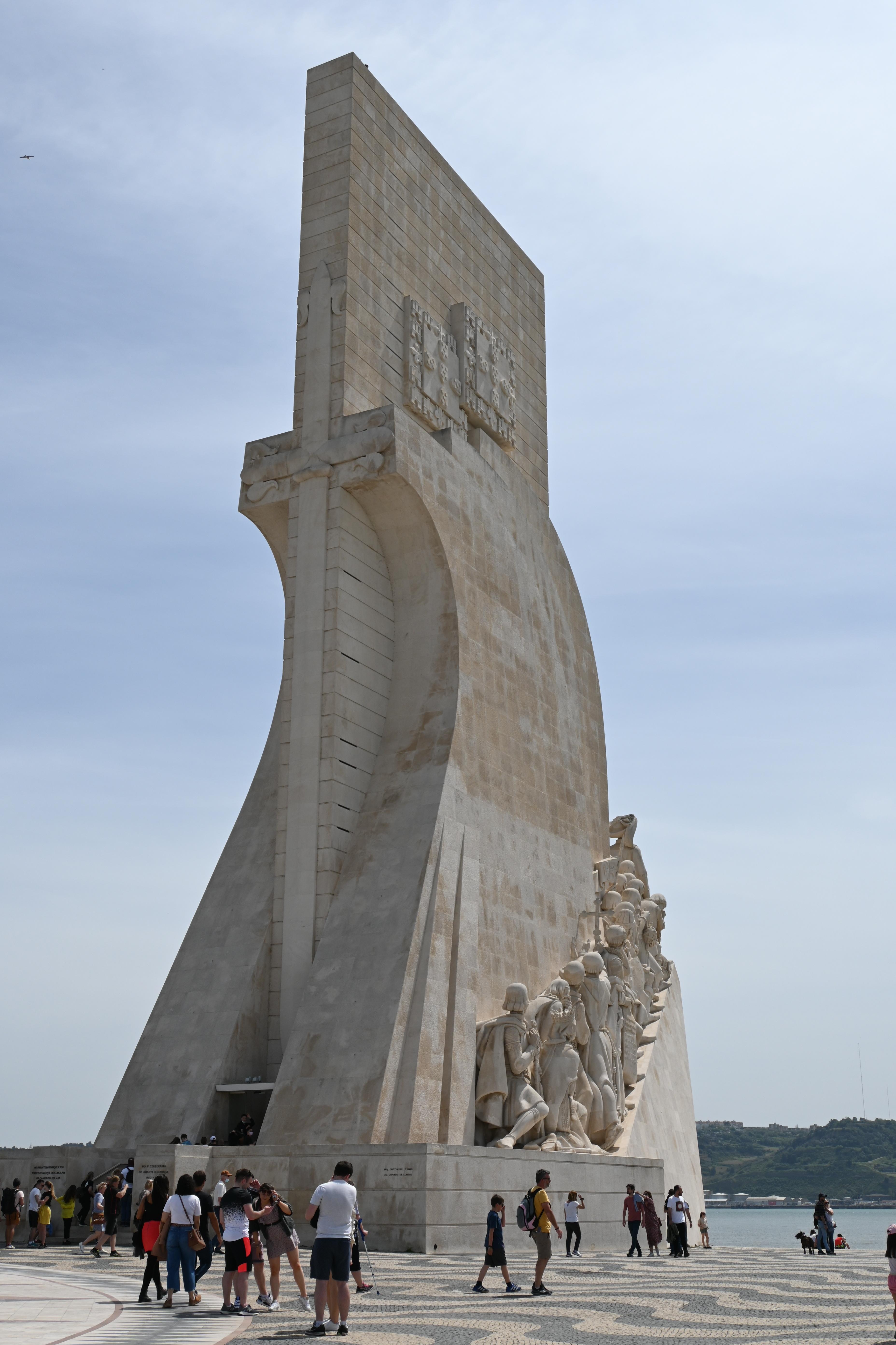 Across the street is the impressive Padrão dos Descobrimentos, or Monument to the Discoveries. It was a little confusing to get there, as we had to find the pedestrian tunnel that went under the very busy road, but we eventually figured it out. The monument is a tribute to the great explorers of Portugal. The 170 foot concrete statue of a caravel, or Portuguese sailing ship, features 32 men who played a significant role in the Age of Discoveries, with Henry the Navigator leading the way. The details on the limestone figures are really impressive, as is the overall structure of the monument. From the sides it is clearly the prow of a sailing ship, but from the back it takes the form of a sword within a cross.