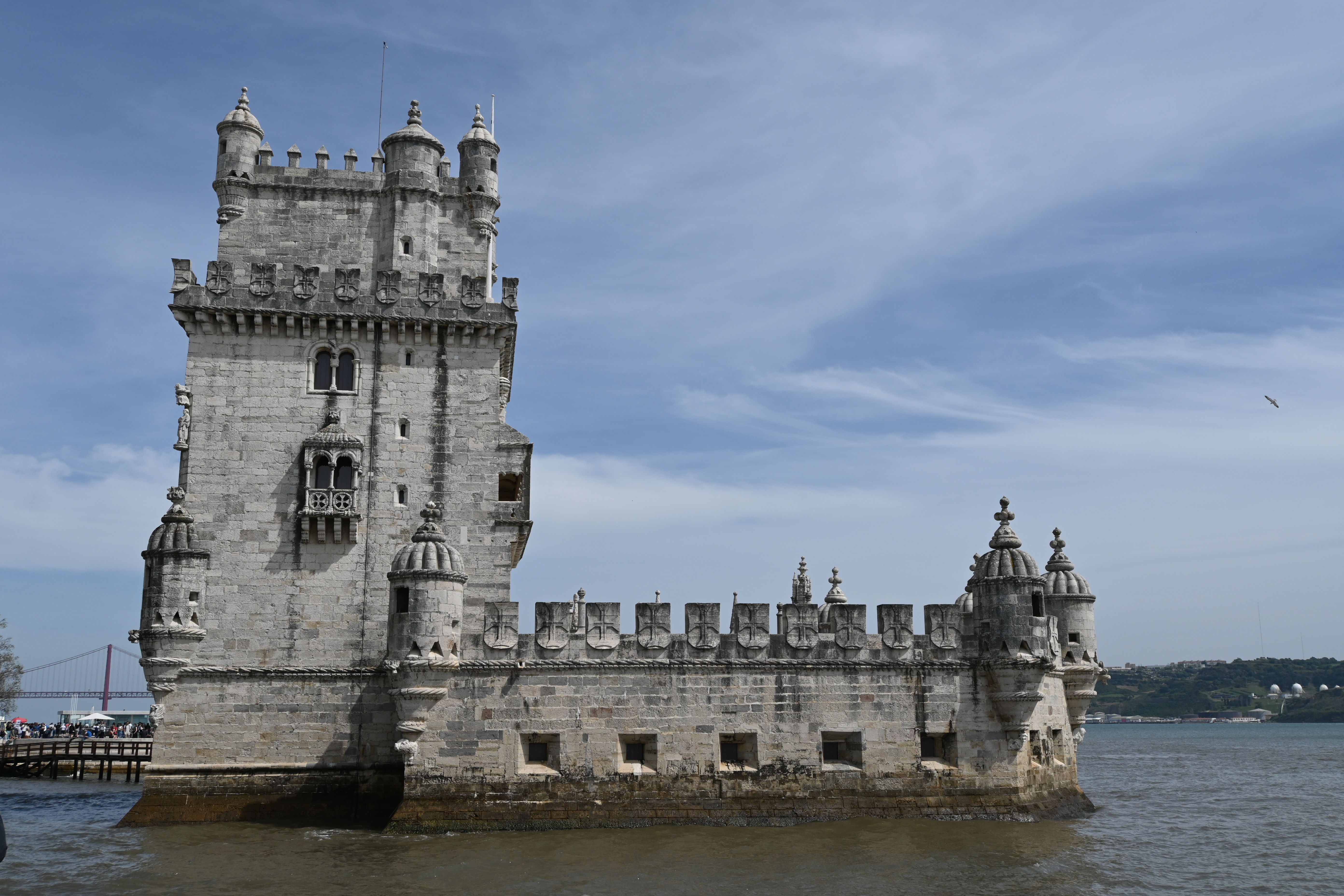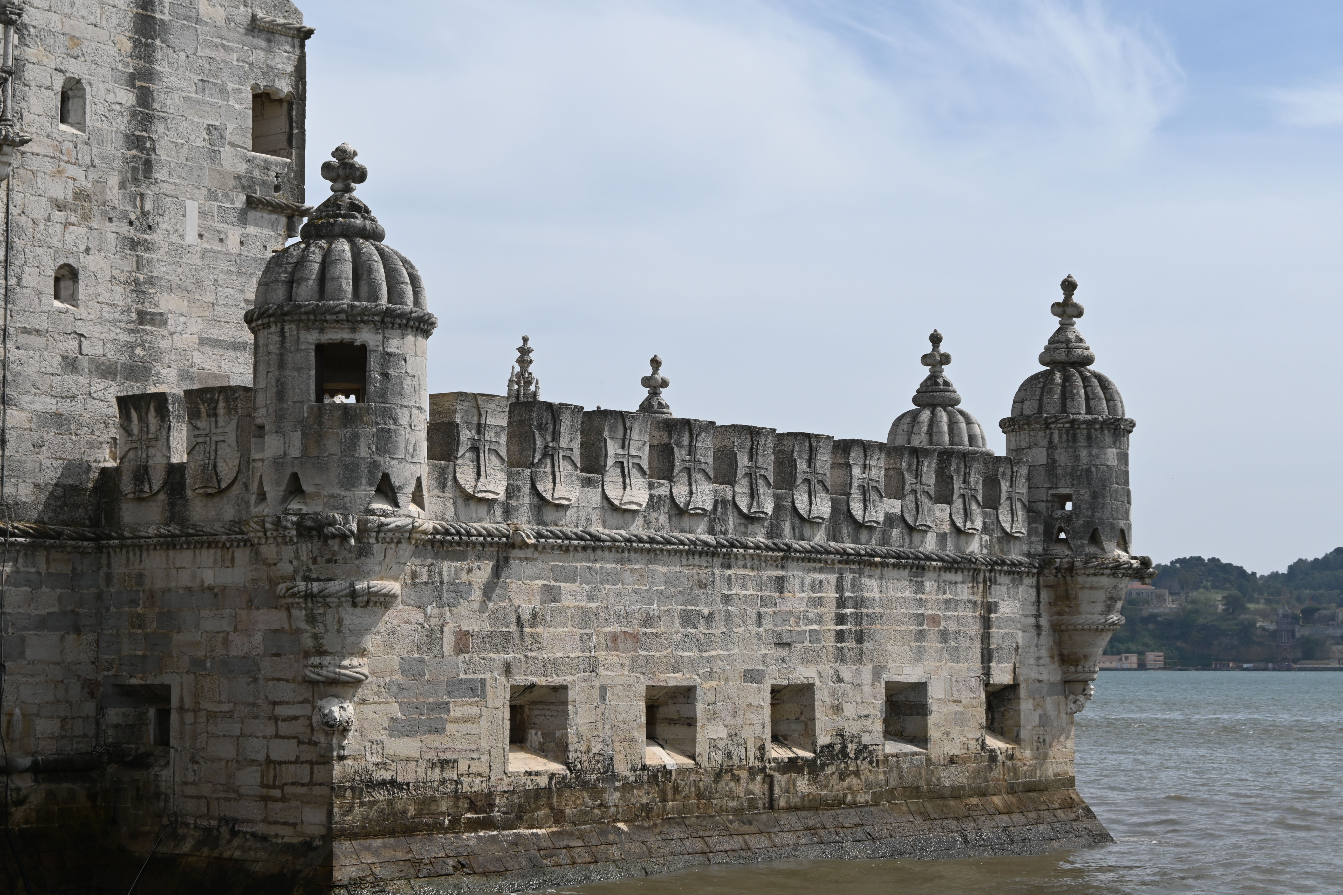 Torre de Belém was built from 1514-1520 to defend the city against naval attacks from the Tagus River. The tower seems to float in the river but is actually built on a small island. Originally located closer to the center of the river, earthquakes, erosion, and time have shifted the shore so that the tower is now quite close to land. The fort is made up of a 4 story tower and 2 level bastion. While the fort was impressive aesthetically, it was not impressive defensively. In 1580 the fort came under attack by the Spanish navy and fell in just 4 hours. As a result, King Philip II of Spain was crowned King of Portugal and the countries were united under Spanish rule for 60 years.