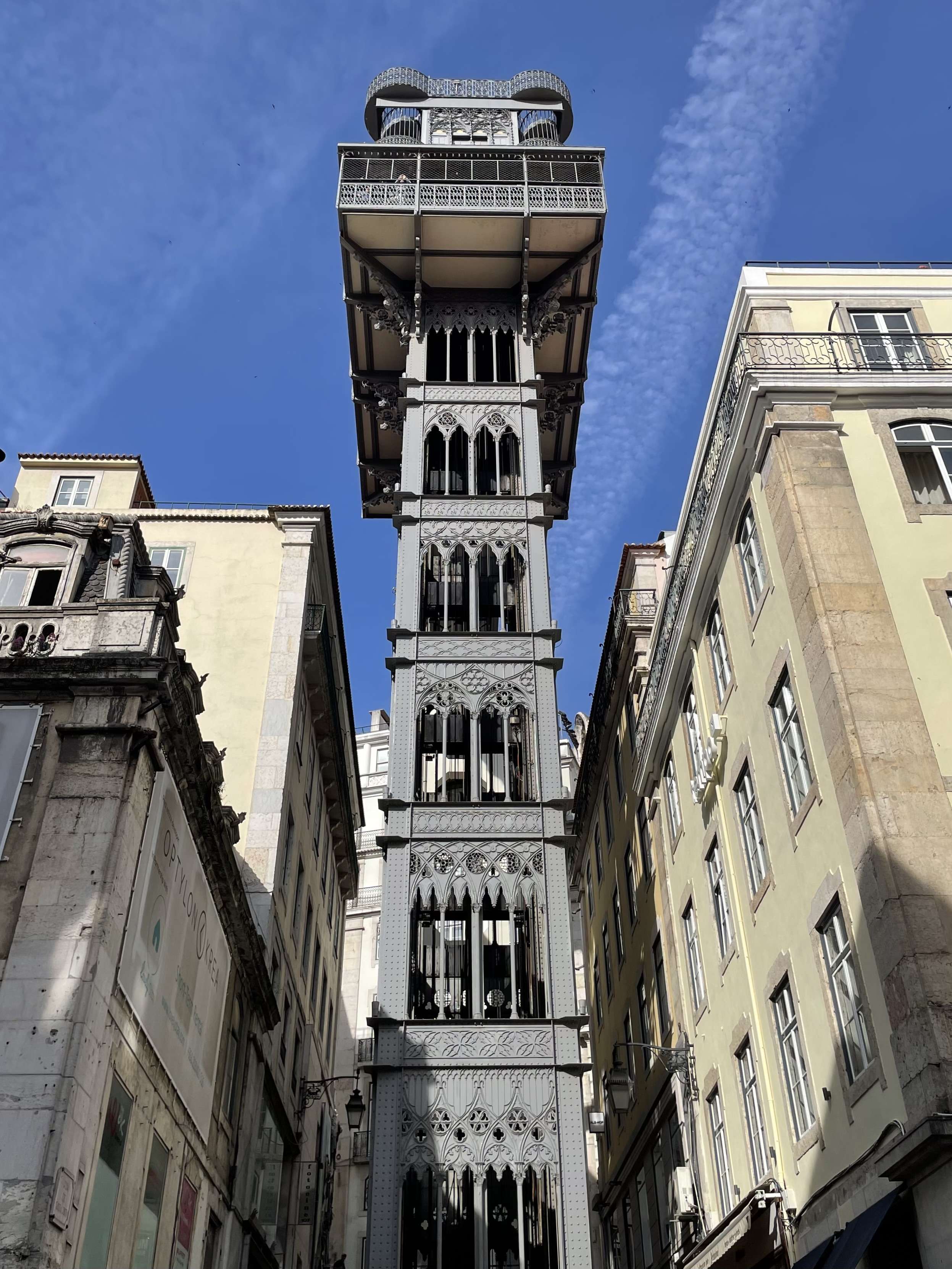 Our trip to Belém took up most of our second day in Lisbon but we saw some other great sights throughout out 2.5 days in Lisbon. One of the most unique attractions in the city is the Elevador de Santa Justa. The historic Neo-gothic wrought iron elevator transports people 45 meters straight up, where they can access a viewing platform and walkway to the street in the neighborhood above. Built in 1902, the lift connects the Baixa and Bairro Alto districts, offering people an alternative to walking the steep hills of Lisbon’s city streets. It is really quite a sight and an ingenious way to get people from one level of the city to another.