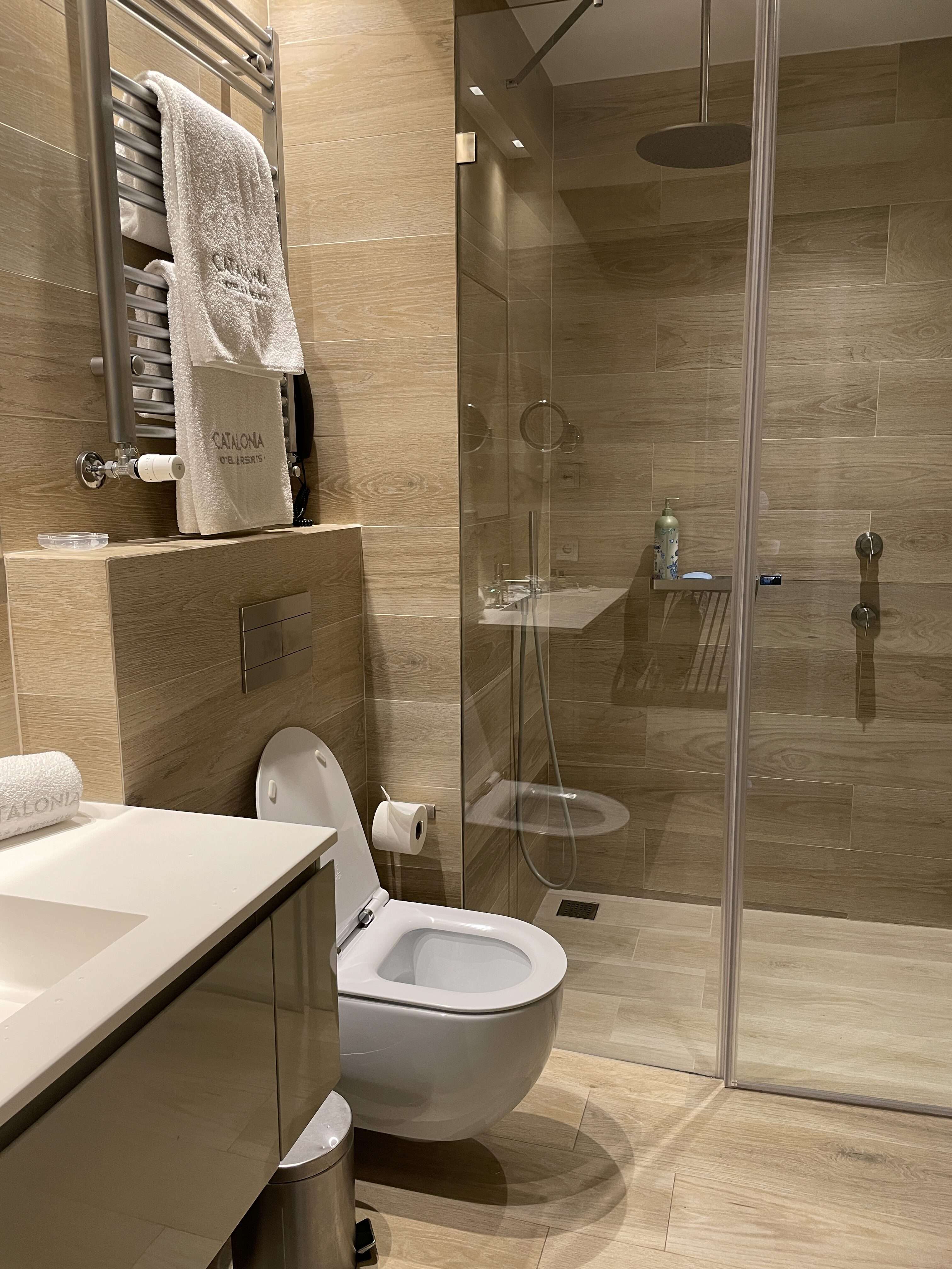 The bathroom was very modern and clean. The shower was nice but there was no ledge so the water tended to leak out onto the floor.