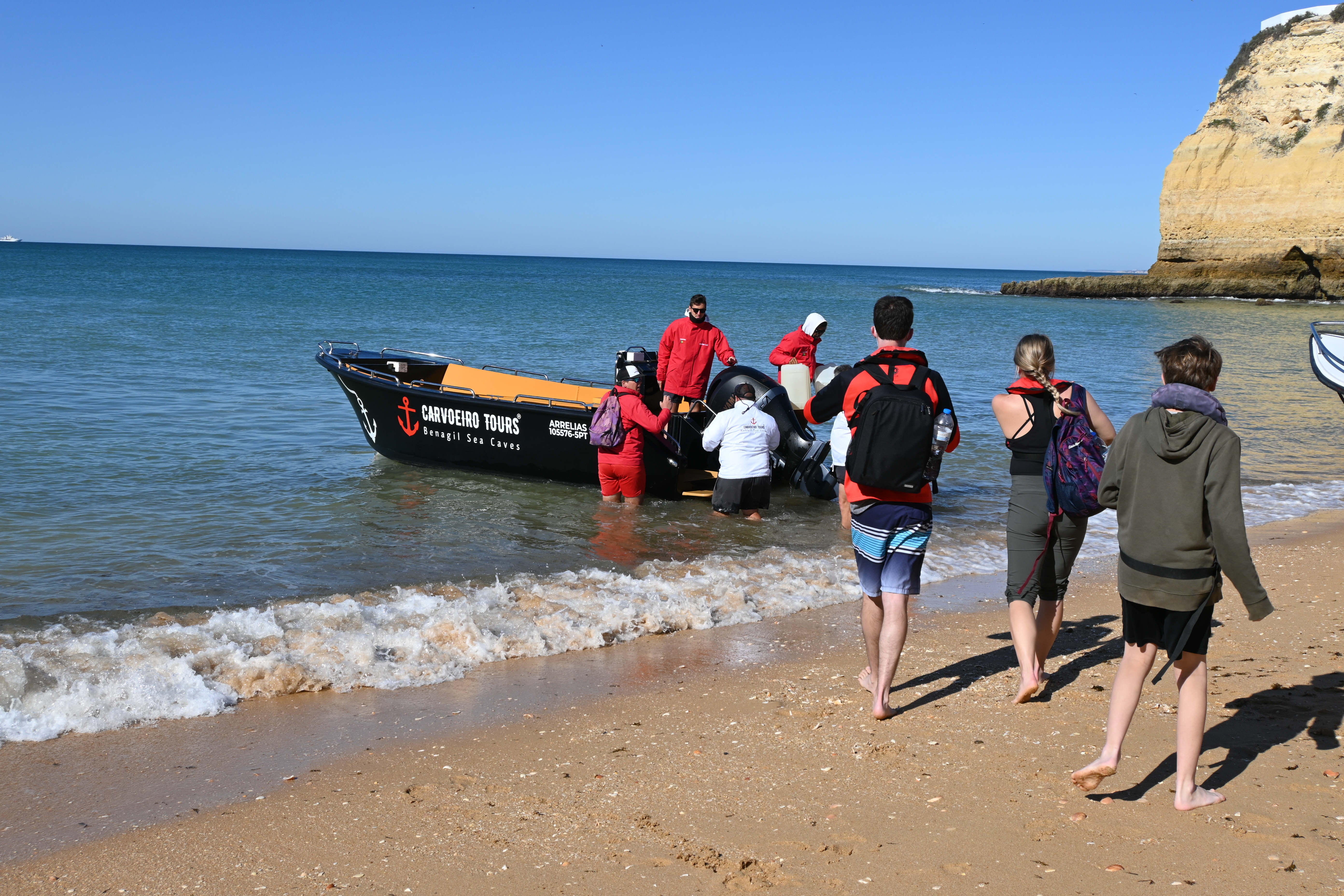 With more than 30 years in the business and 4 boats leaving from two different locations (Carvoeiro and Portimão), Carvoeiro Tours is a well-respected and experienced tour company. Their operation ran smoothly from the stand on the edge of the beach. They fitted us all for life jackets (which were more comfortable than most!), showed us where to store our shoes, and led us down to the water’s edge to board the boat. The wet boarding was smooth and safe and we were quickly pushed off from shore and on our way. You can read about our full experience here.