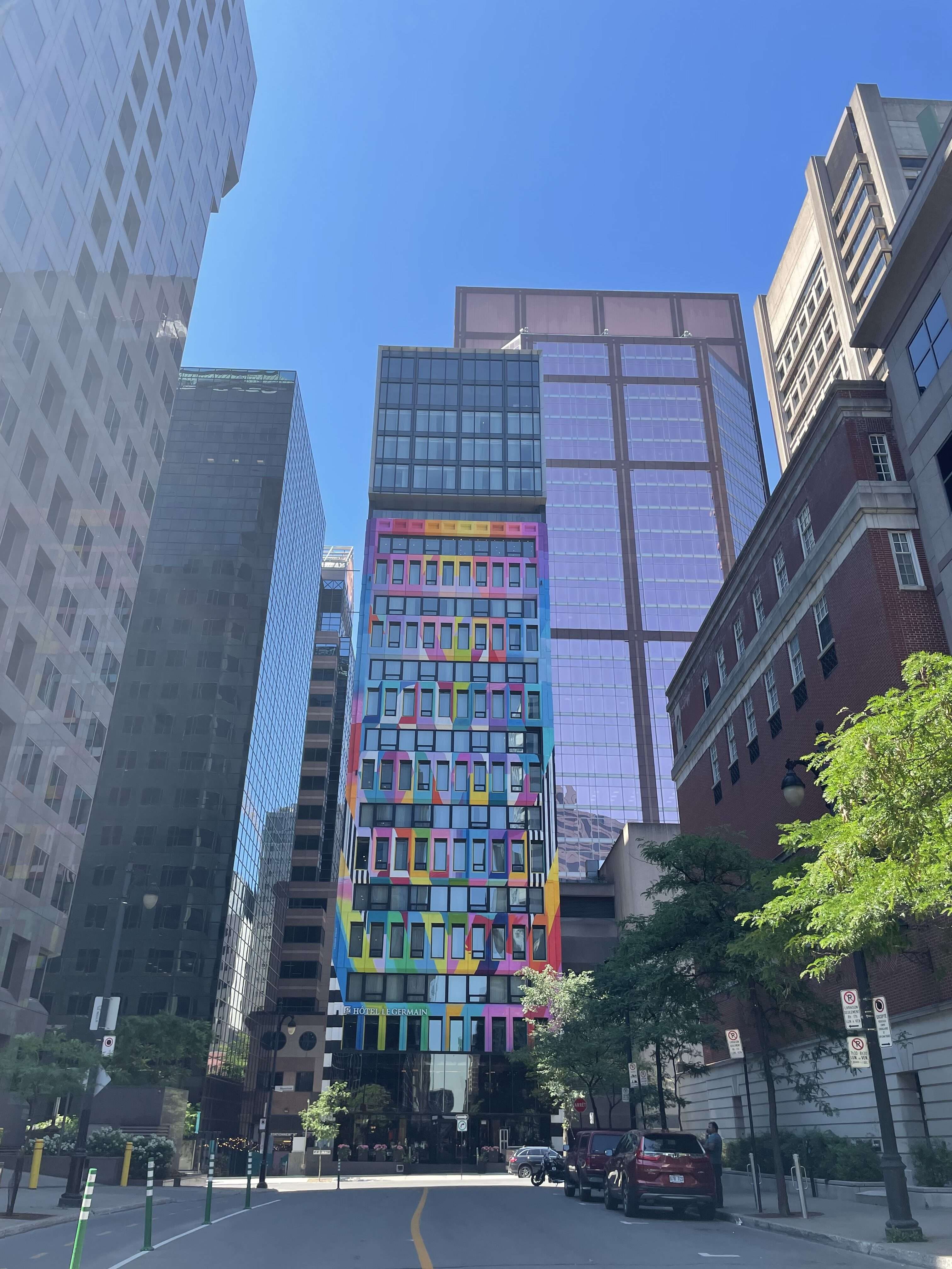 After strolling through the square, we turned down Viger Avenue West and continued walking through the Quartier International. We came upon another square, Place Jean-Paul-Riopelle. Built in 2004 over a former expressway, the square’s main feature is La Joute, an art installation that includes bronze sculptures and a fountain. The fountain operates on a 32 minute kinetic cycle that includes mist, water, and fire. I’ll admit that we passed by it several times without realizing that if we had stood there long enough or gotten lucky with the timing we would have seen a ring of fire erupt around the sculpture. Perhaps we were too distracted by the colorful convention center across the street, Palais des Congrès.