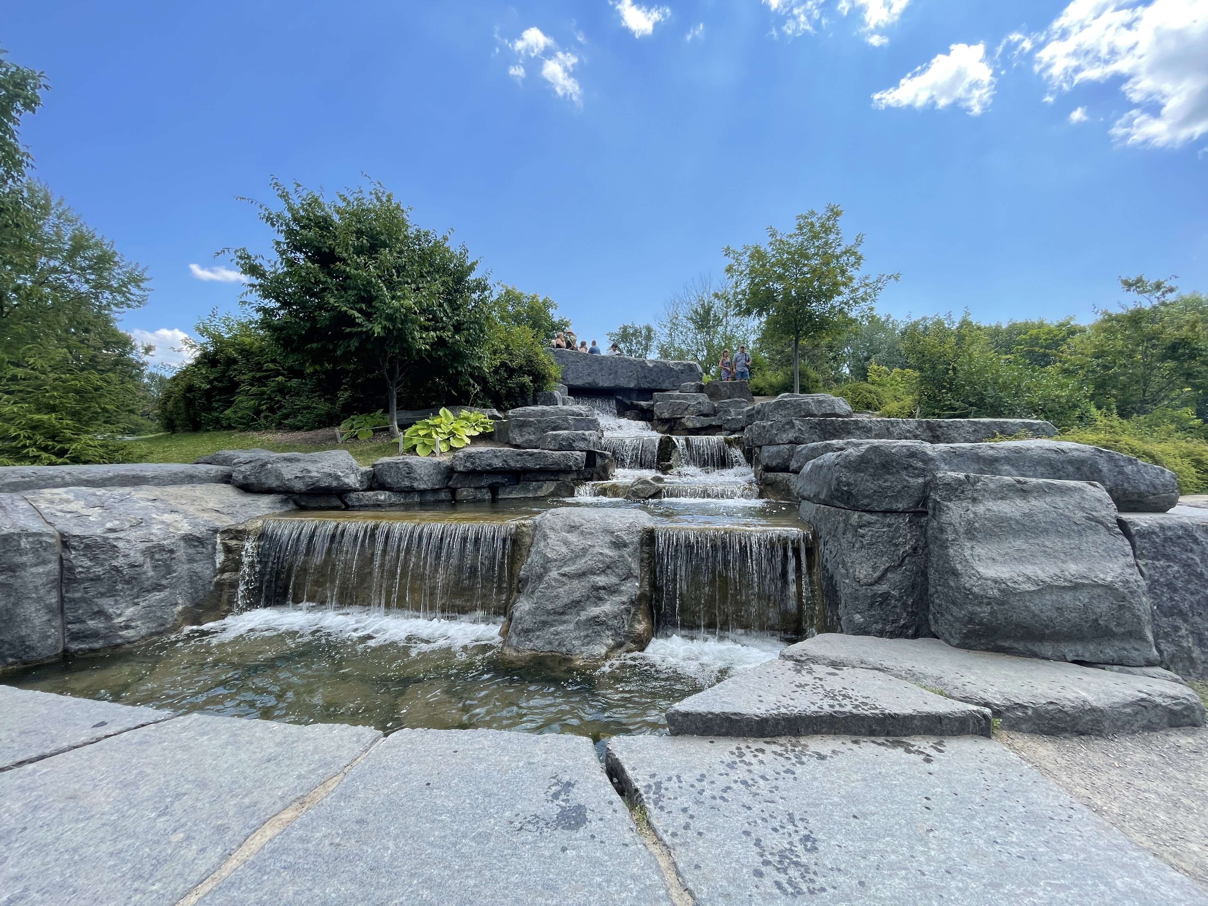 We got some drinks and ice cream at the cafe to cool down and refuel and then headed out to walk to Lac aux Castors (Beaver Lake). On our way, we passed a field filled with huge stone statues. These sculptures were part of the 1964 International Sculpture Symposium in which 12 artists from around the world were invited to create a sculpture in just 26 days. One of the statues was taken down in 1986 due to safety concerns but the other 11 statues can still be seen today between the Smith House and Beaver Lake.