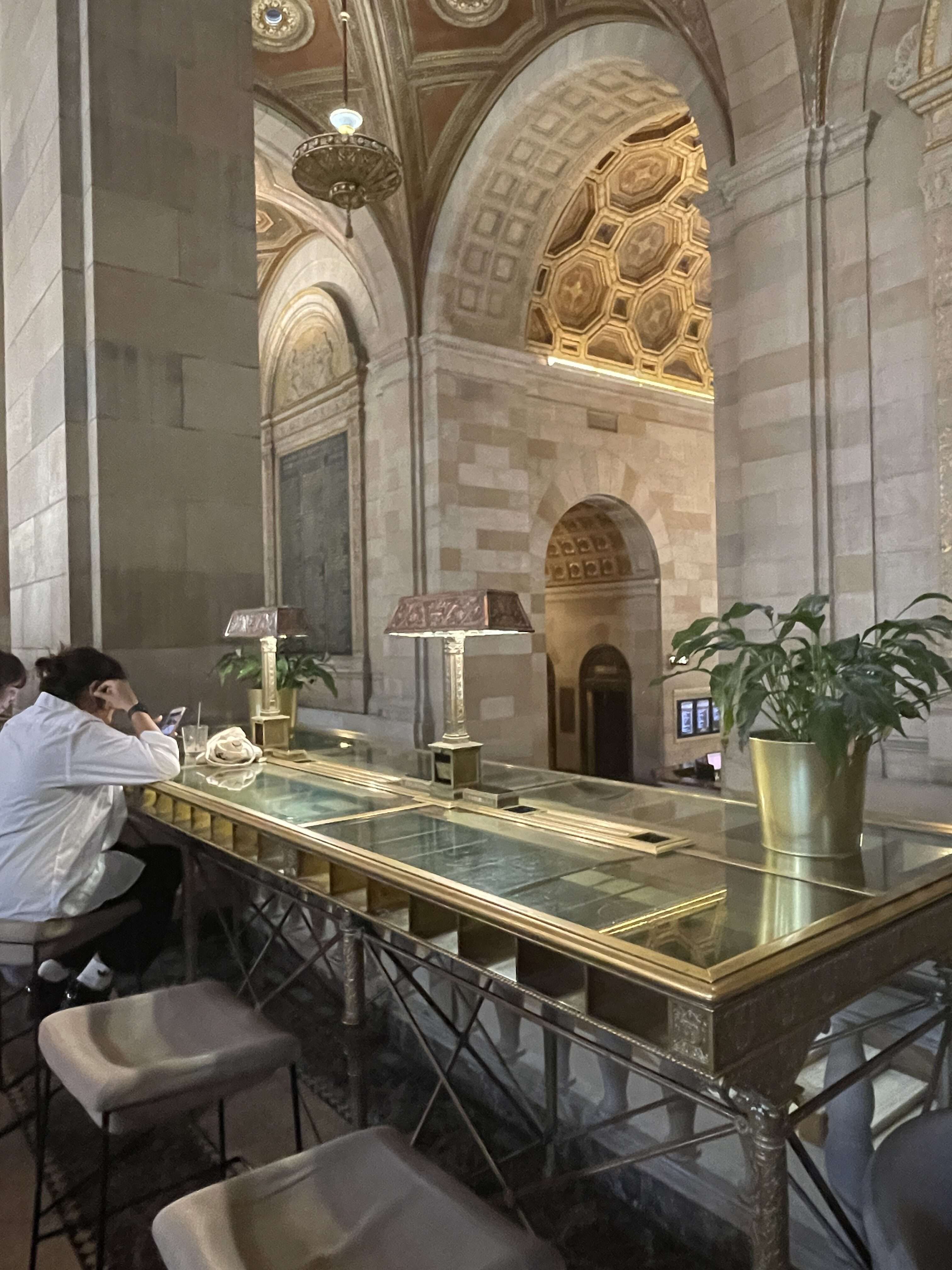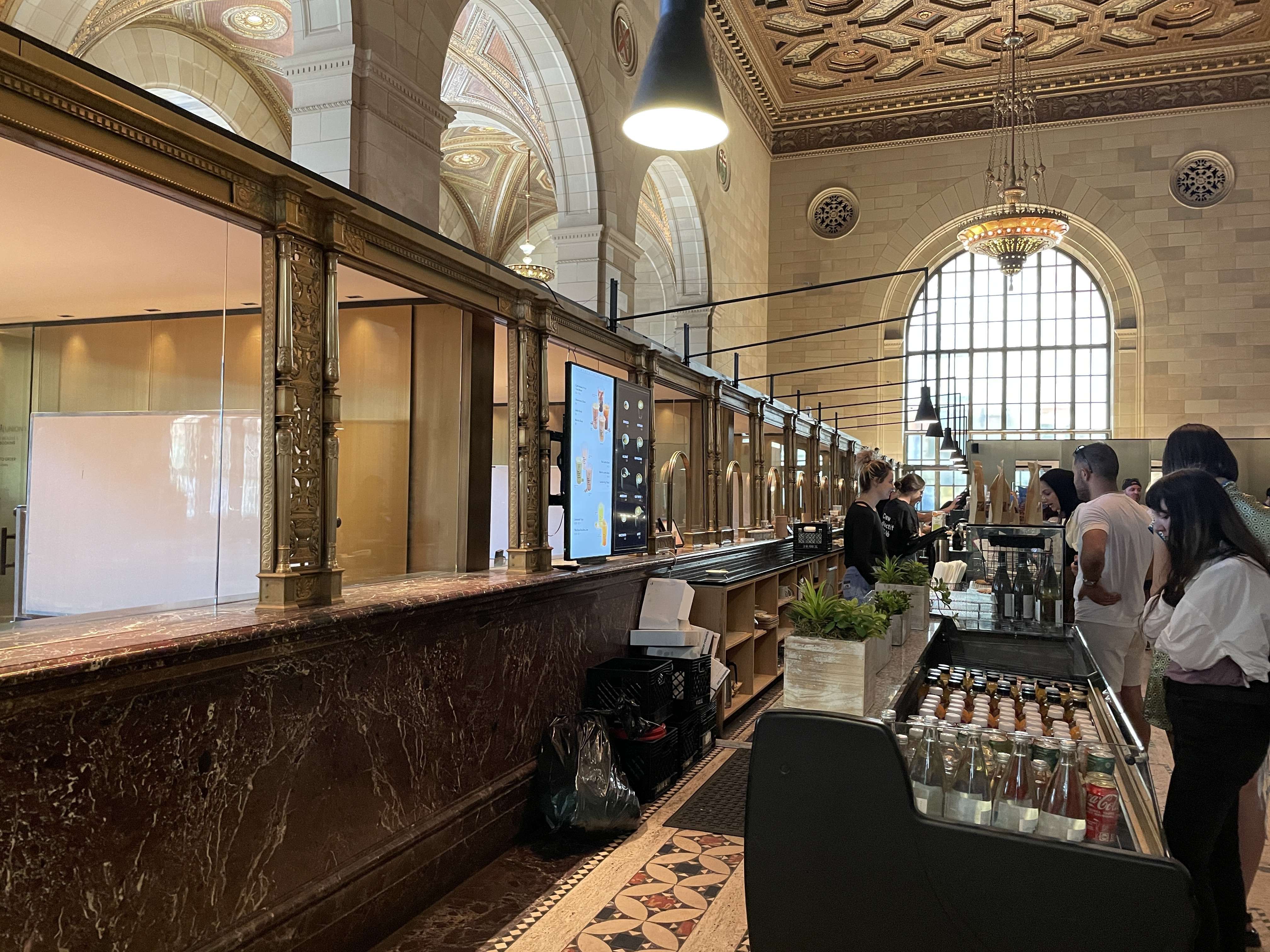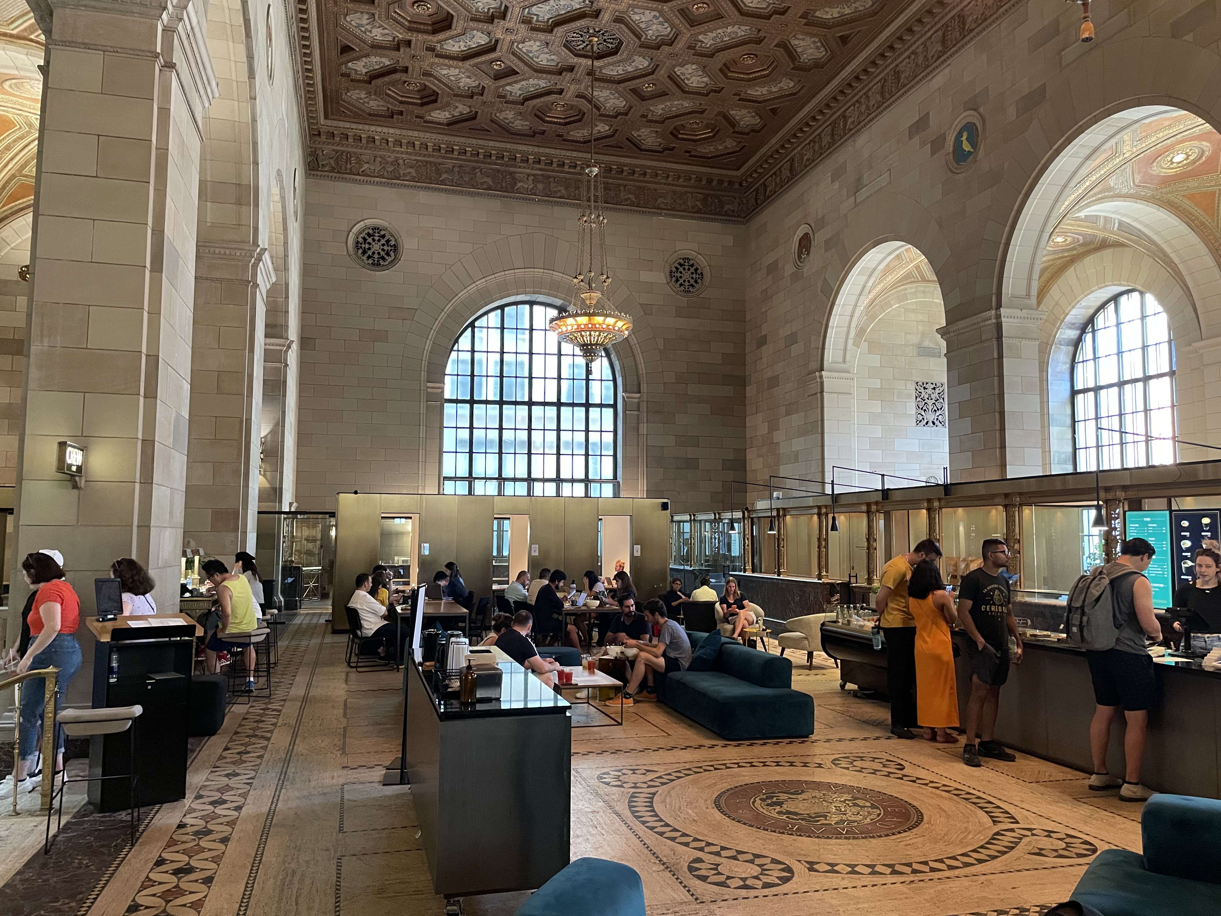 After spending some time taking in all the sights and sounds of Place d’Armes, I continued along Rue St Jacques, also known as Canada’s Wall Street. The Royal Bank Tower found at 360 Saint-Jacques Street was Montréal’s tallest building when it was built in 1928. After standing empty for 6 years, the beautiful building underwent a very unique transformation. In 2016, the space was reopened as Crew Collective & Cafe. Part cafe, part co-working, meeting and event space, Crew brilliantly repurposed the stunning interior of the historic building to be used as a social and professional meeting space. Cafe workers brew coffee in front of the old teller’s counter, while customers sit at the deposit slip desks. We spent about an hour here one afternoon and really enjoyed the unique experience.