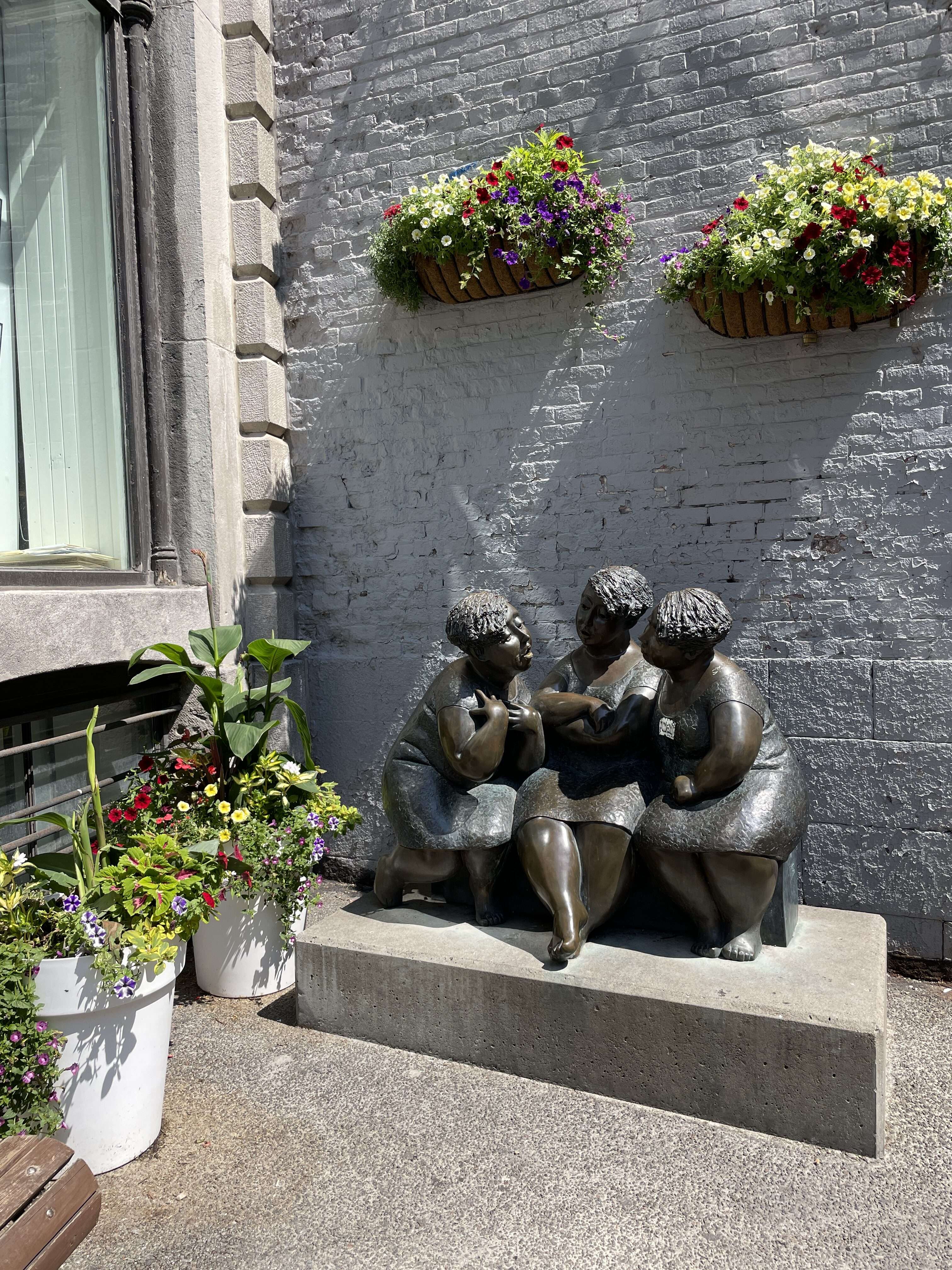 The next stop on the walking tour was a charming bronze statue entitled Les Chuchateuses (The Gossipers). Created in 2002 by artist Rose-Aimée Bélanger, the statue features three woman chatting expressively on a bench. Located on popular Rue St-Paul, the sculpture was intentionally tucked away on a sidewalk in the corner of a building, cleverly turning a previously neglected spot into an area of artistic interest.