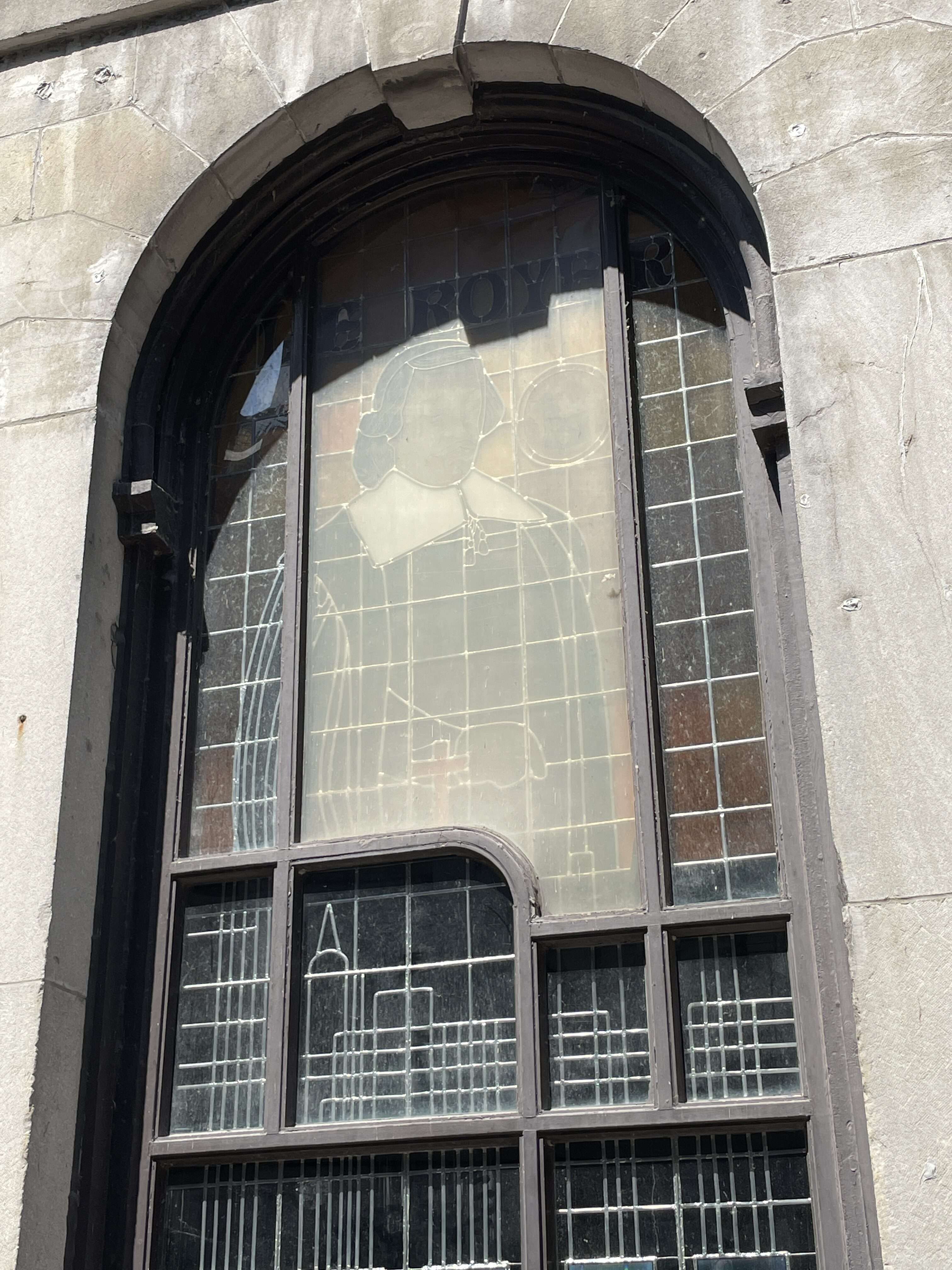 From there I meandered down the little pedestrian lane, Cours Le Royer. The street is short but quaint, featuring beautiful mid-18th century warehouse buildings that have been converted into a commercial-residential mixed use development. A stained glass window featuring one of Montréal’s founders, Jérôme Royer, can be found in one of the doorways.