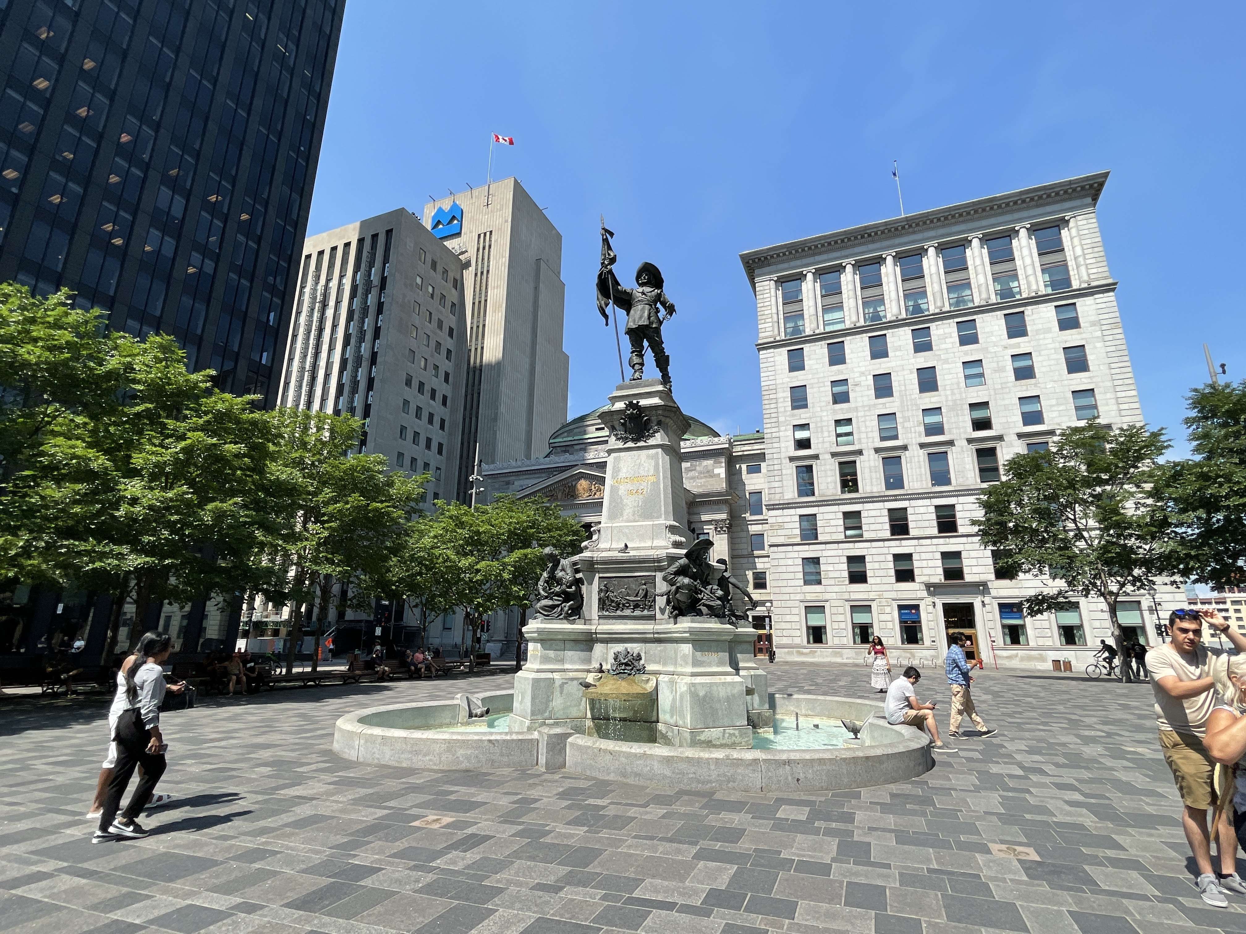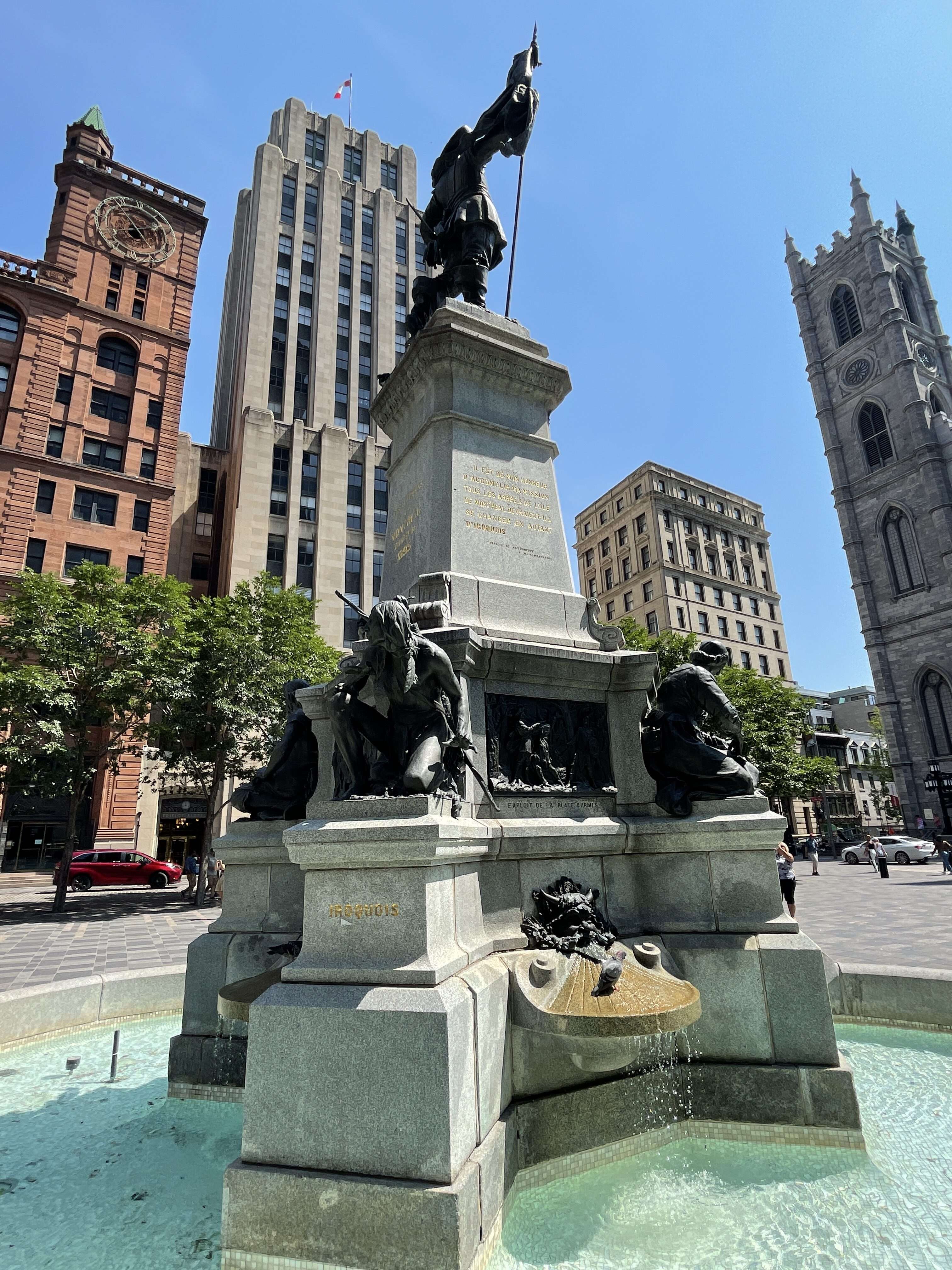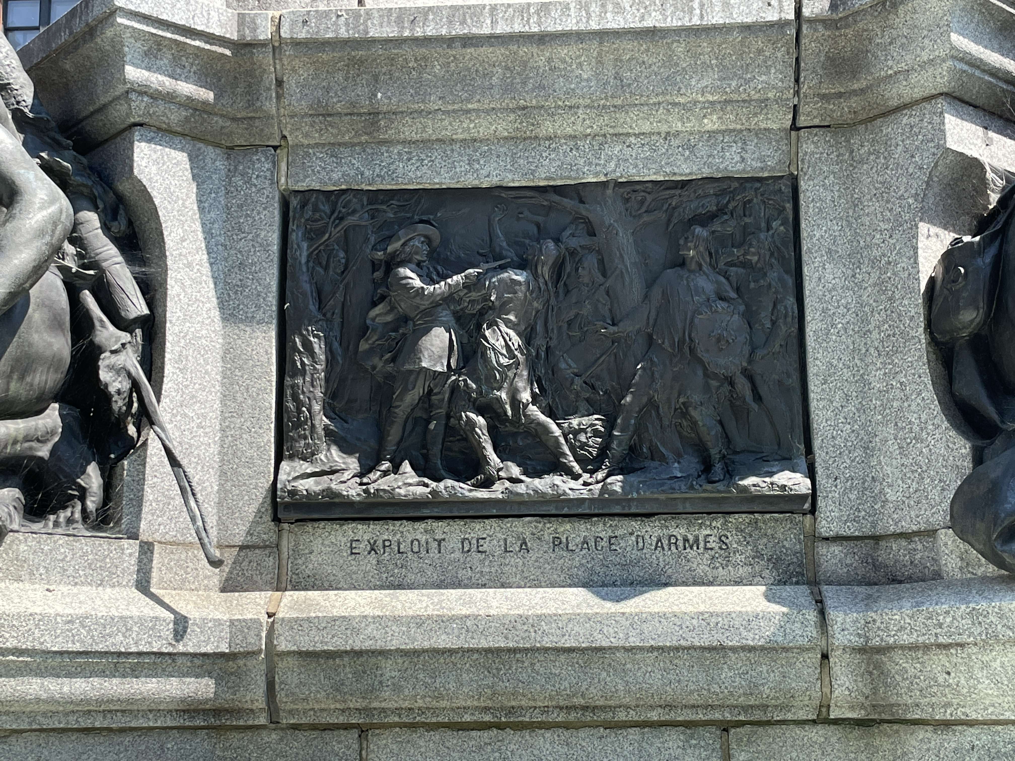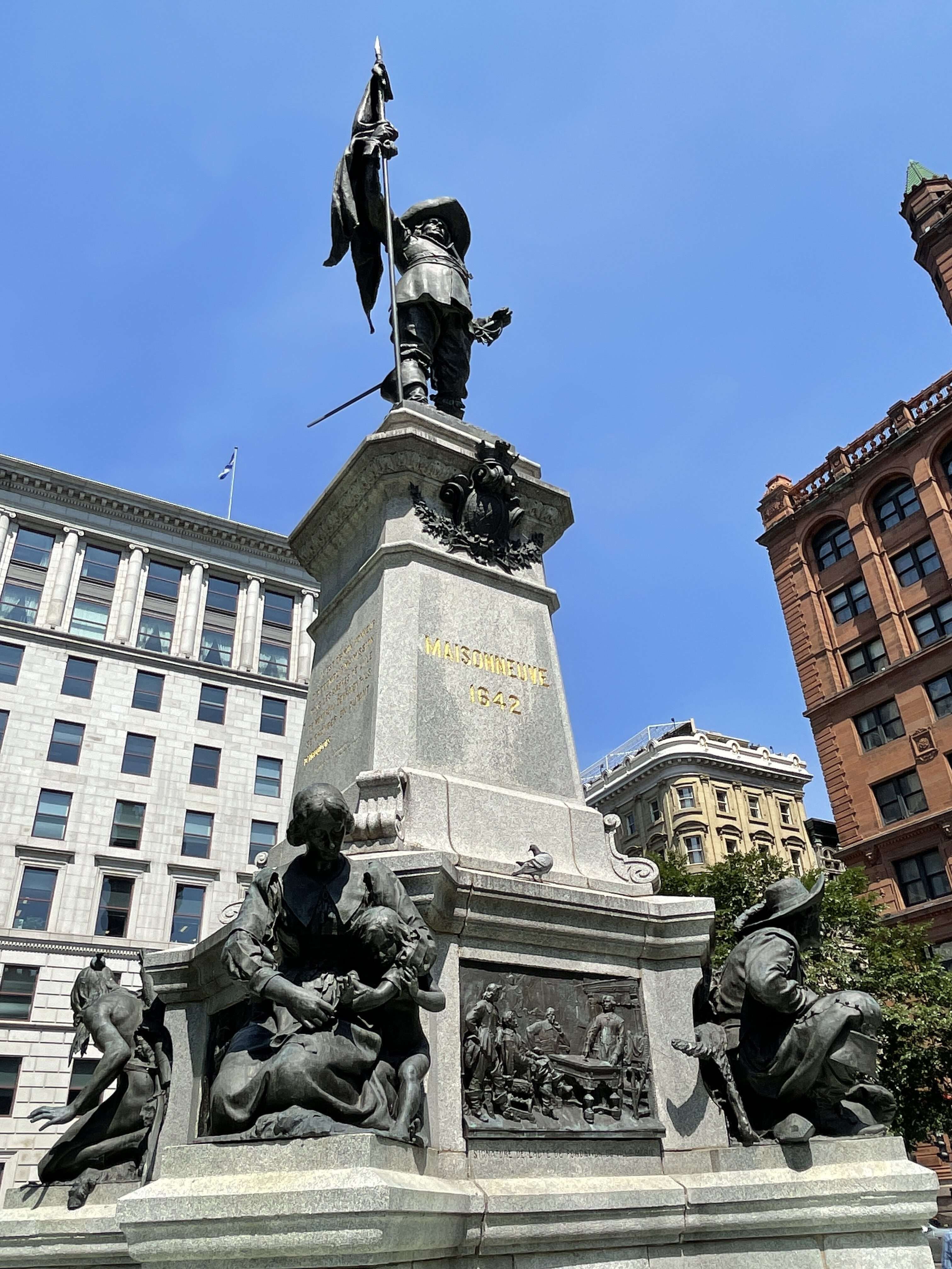In the middle of Place d’Armes is a monument honoring Paul de Chomedey, the founder of Montreal. The Maisonneuve Monument was built in 1895 to celebrate the 250th anniversary of the founding of the city. The base of the statue features 4 figures that played prominently in the founding of the city, including an Iroquois warrior. The statues are on each corner of the base, and in between each figure there is a bas-reliefs depicting an important historical event. And of course, the centerpiece of the monument is the figure of Paul de Chomedey, Sieur de Maisonneuve, holding a flag of the king of France.