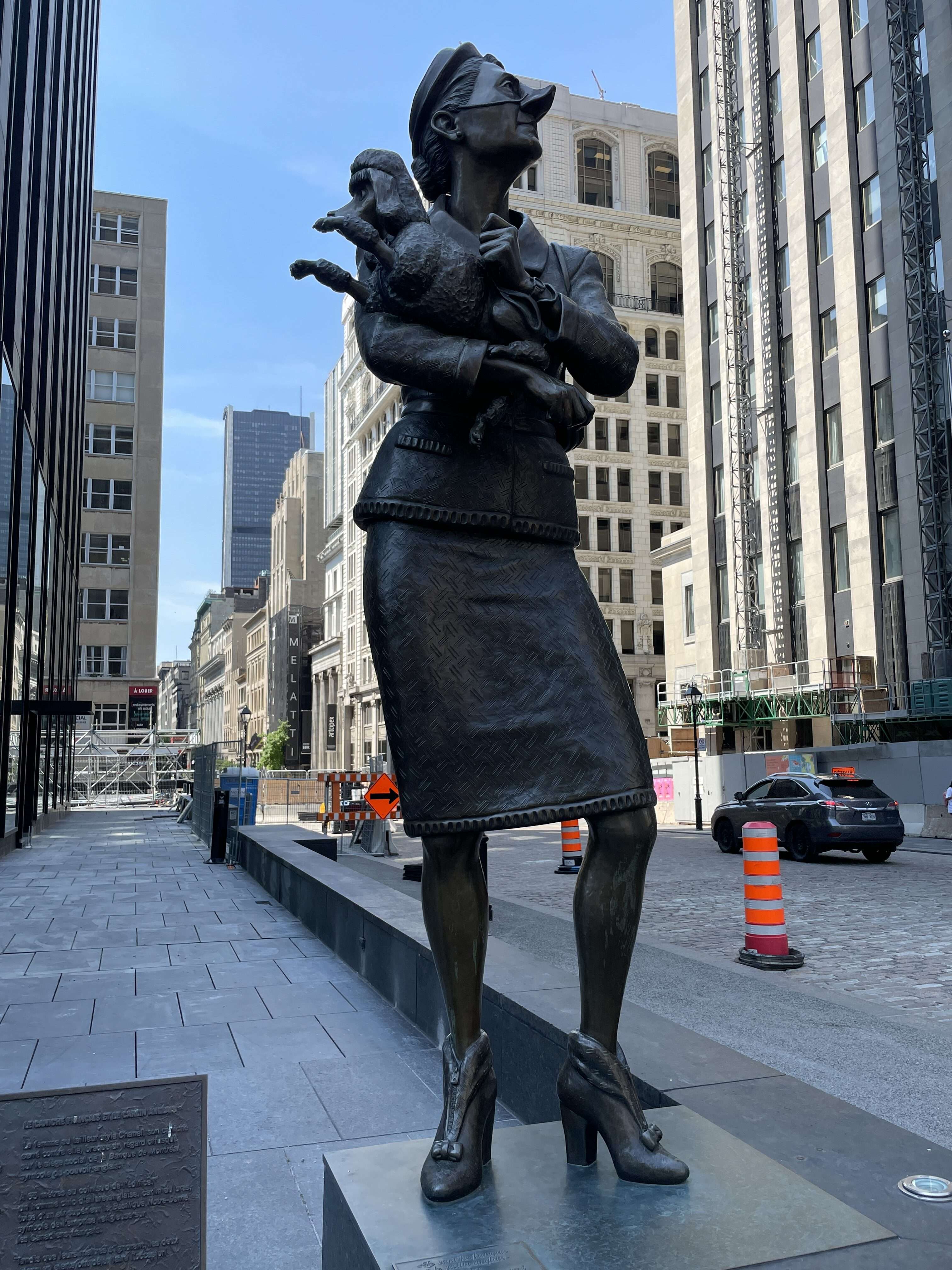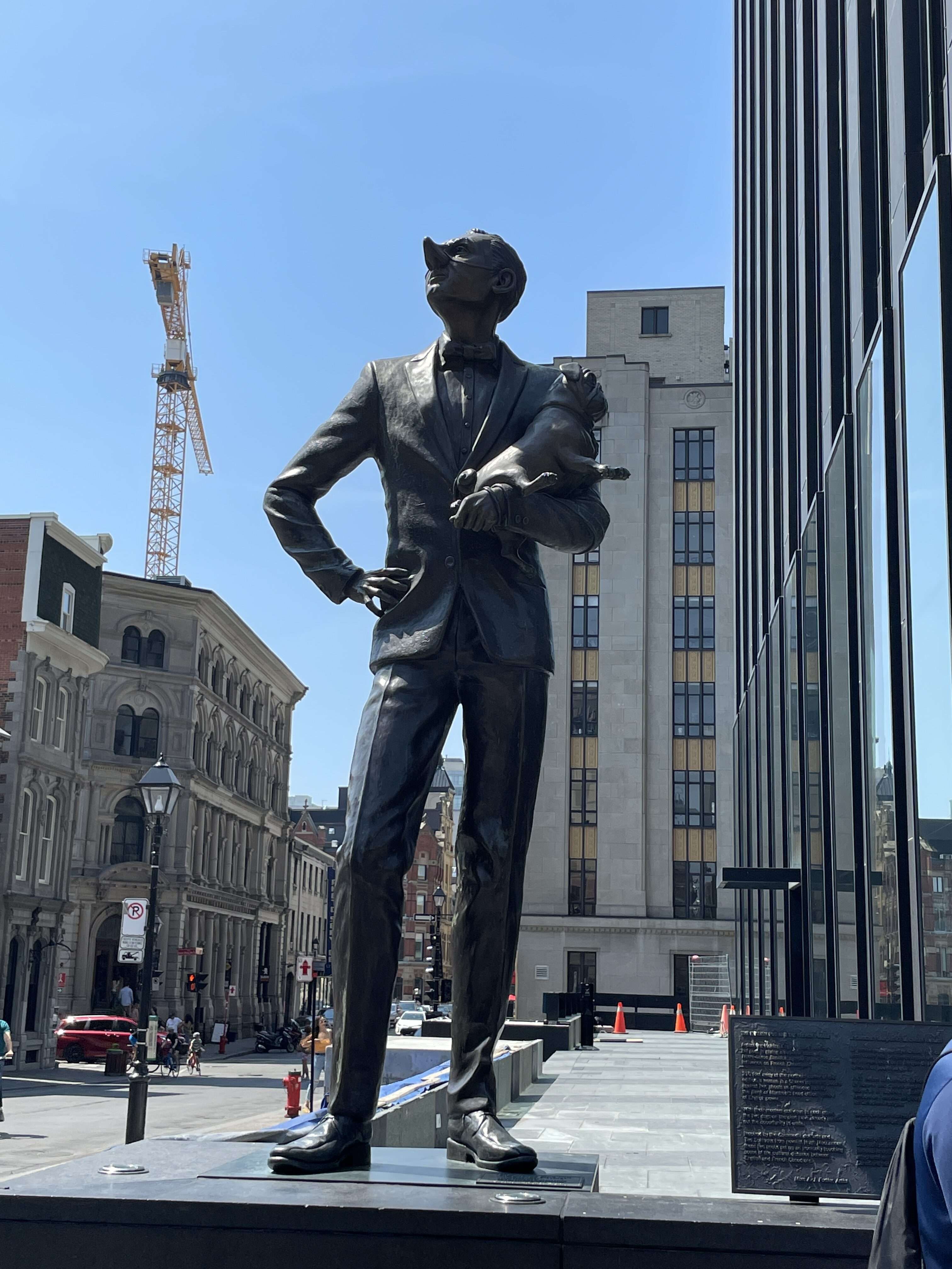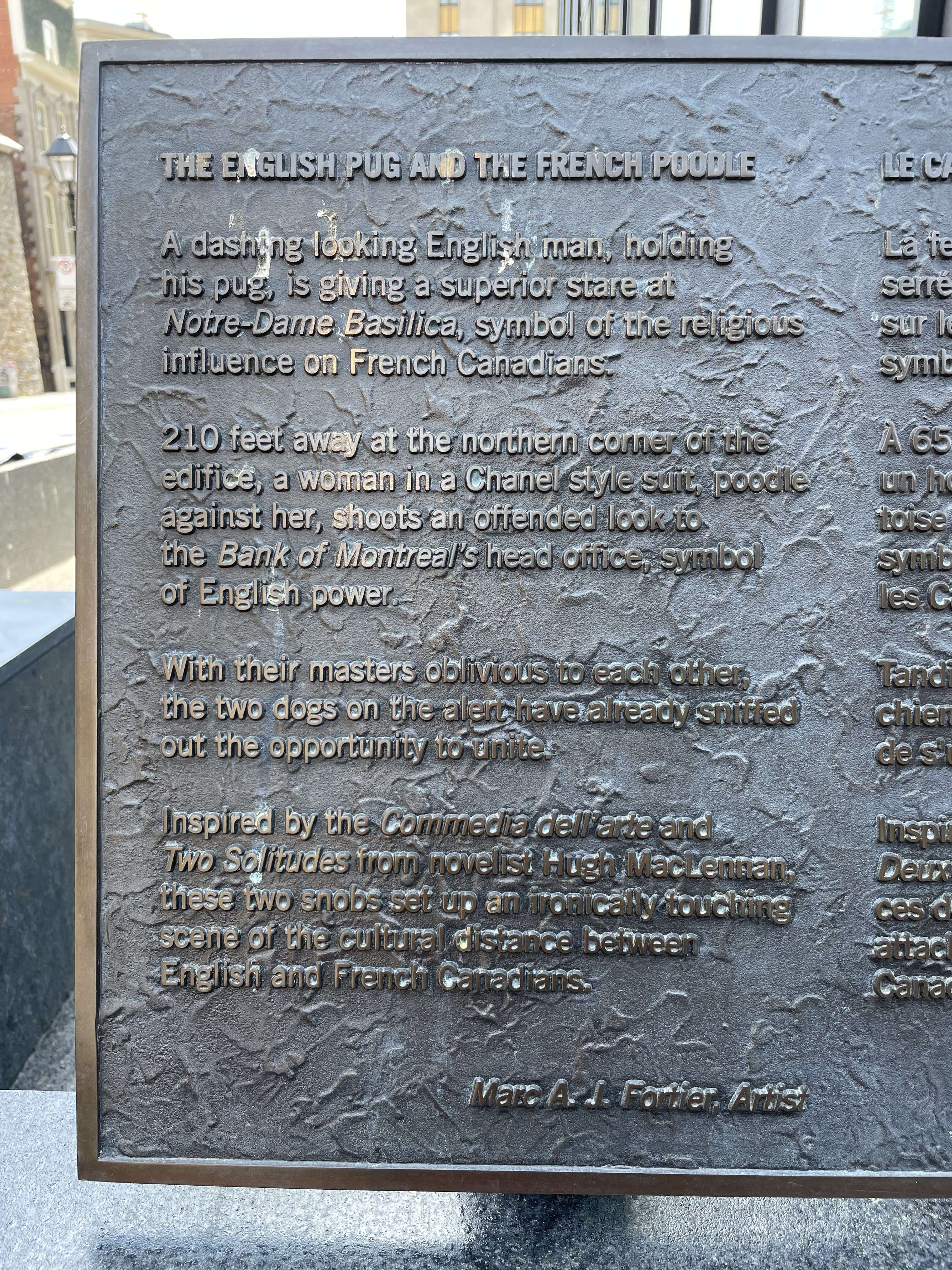 There is another interesting set of statues on the outer edge of the plaza. On either side of the tower at 500 Place d’Armes stand two bronze sculptures, collectively known as Le Caniche Français et le Carlin Anglais (The English Pug and the French Poodle). The statues represent the clash of cultures between English and French Canadians. The pretentious Englishman holds a pug and looks at the Notre-Dame Basilica, a symbol of French Catholic dominance, with disdain. On the other side of the building, a snooty French woman holding a poodle glares at the Bank of Montréal, a symbol of English power. Also known as The Two Snobs, the statues provide an interesting commentary on human cultural divides, as the two people look away from each other critically but the two dogs in their arms reach for each other.