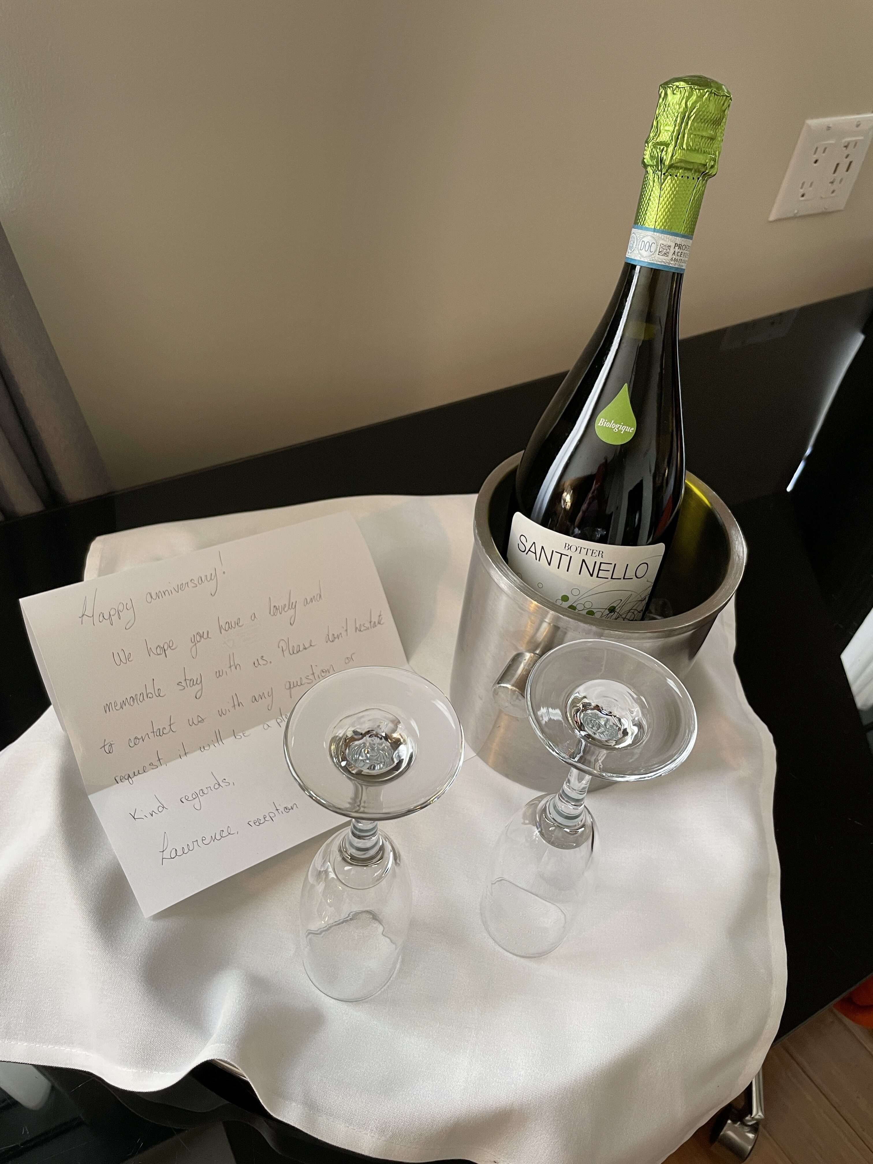 The front desk staff were helpful and friendly. We checked into our room and headed upstairs. There was a chilled bottle of Prosecco waiting for us with two wine glasses and a lovely note wishing us a happy anniversary. We really appreciated the thoughtful gesture.