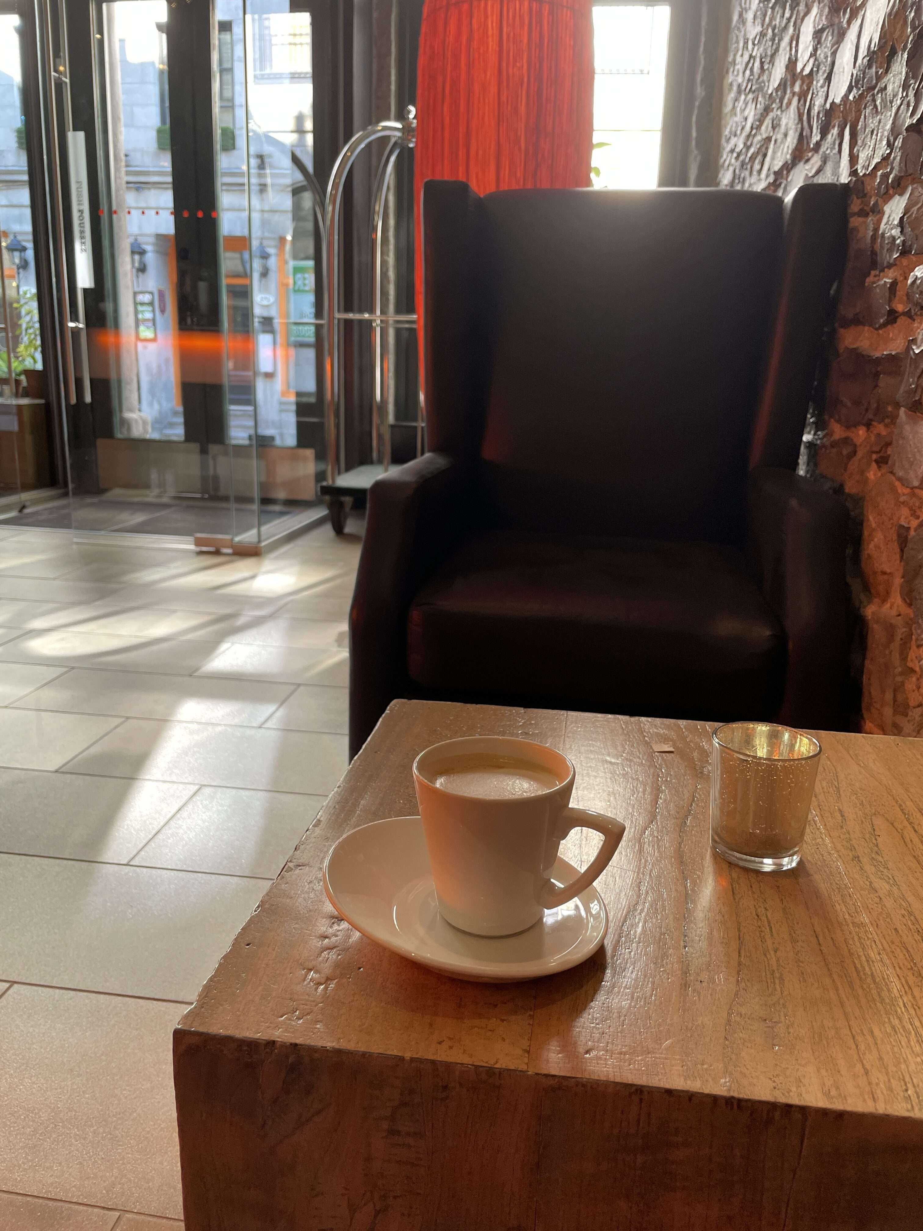 We arrived on the narrow street and pulled into the hotel’s parking spot directly across the street from the entrance. Someone came out immediately to valet park our car for us. We walked into the lobby, which is a cool space with stone walls and some comfy seating areas. And it doubles as a café that offers free coffee drinks to guests! I was immediately in love… free lattes all day long? I might never leave.
