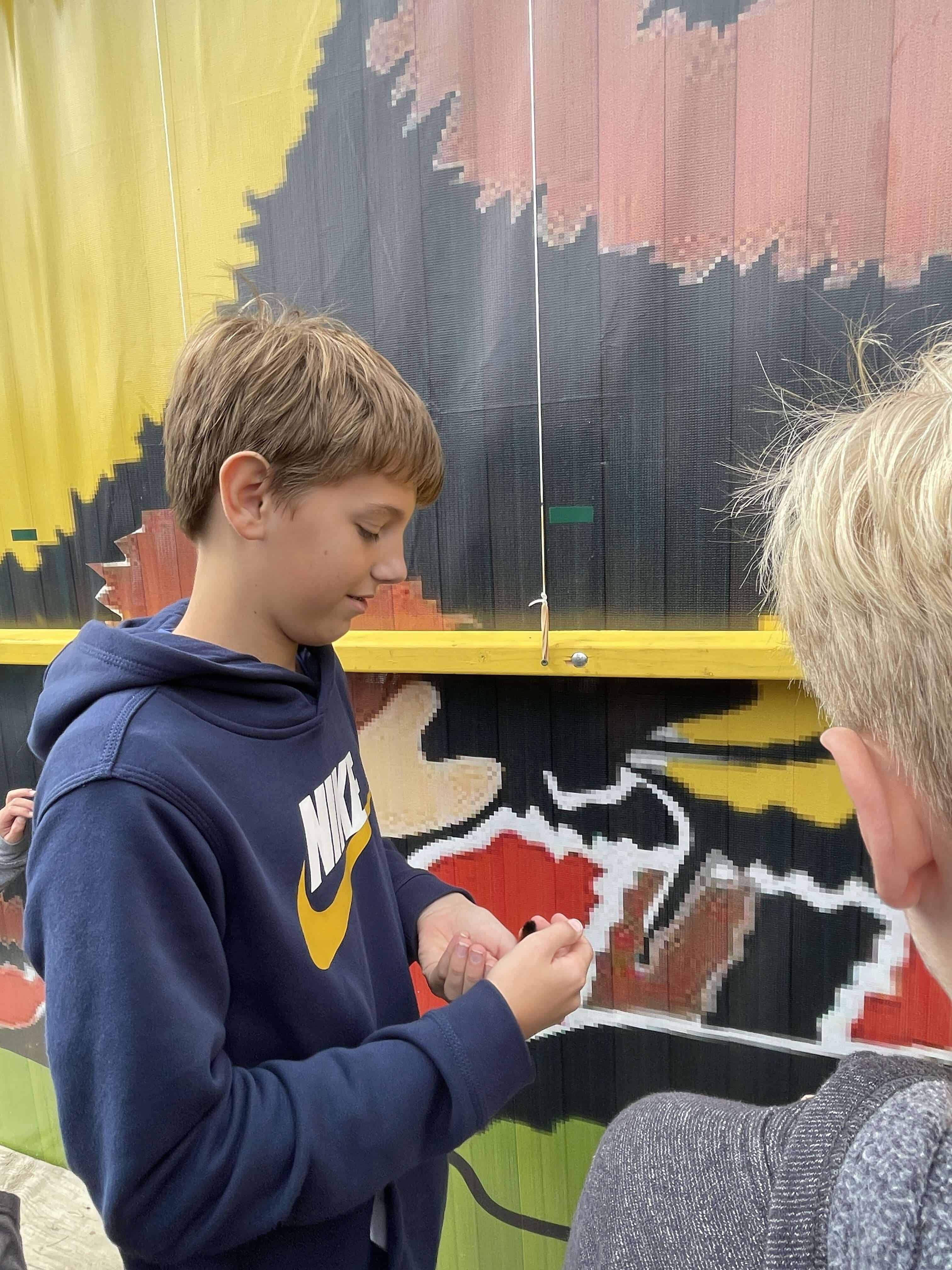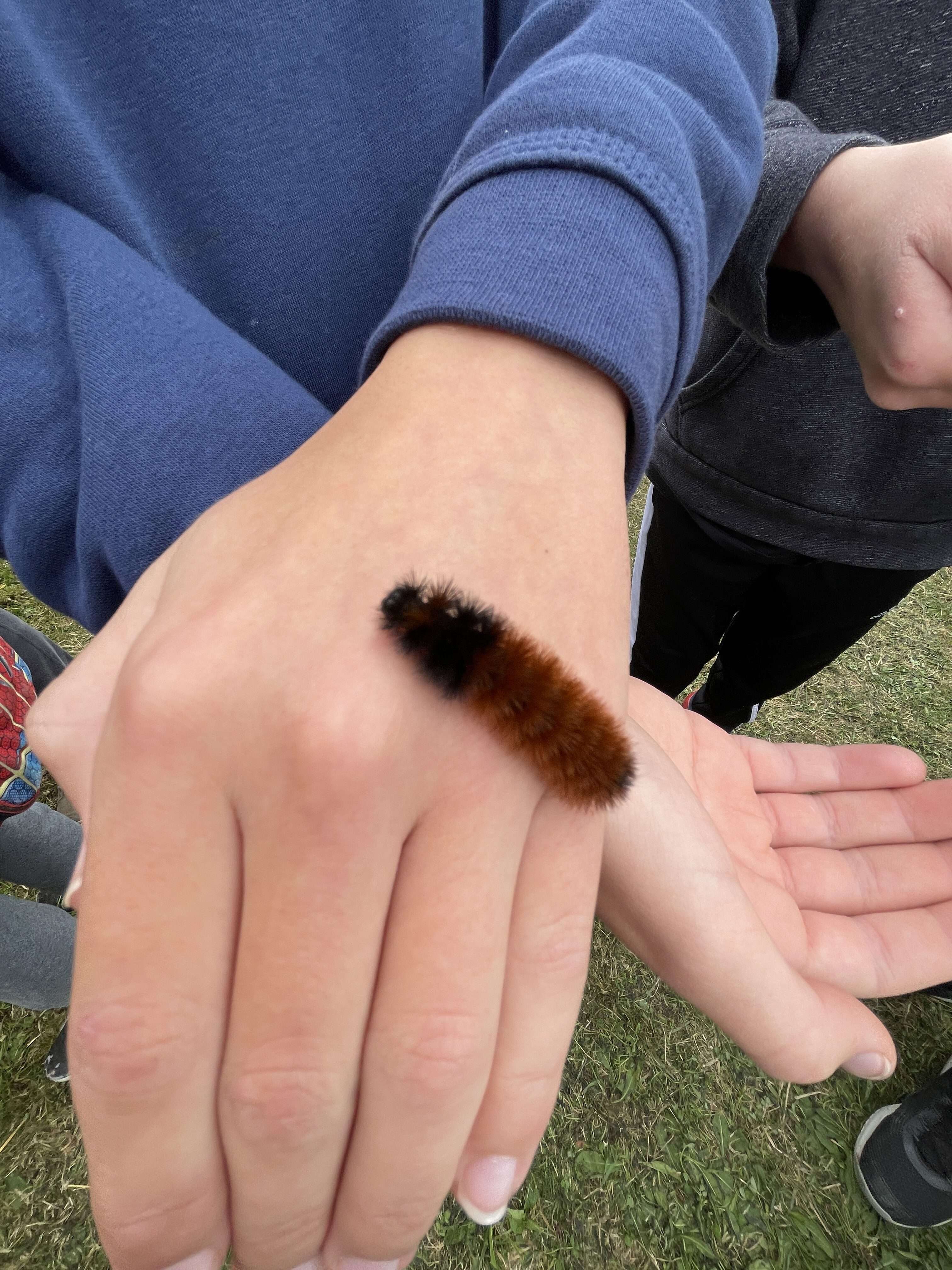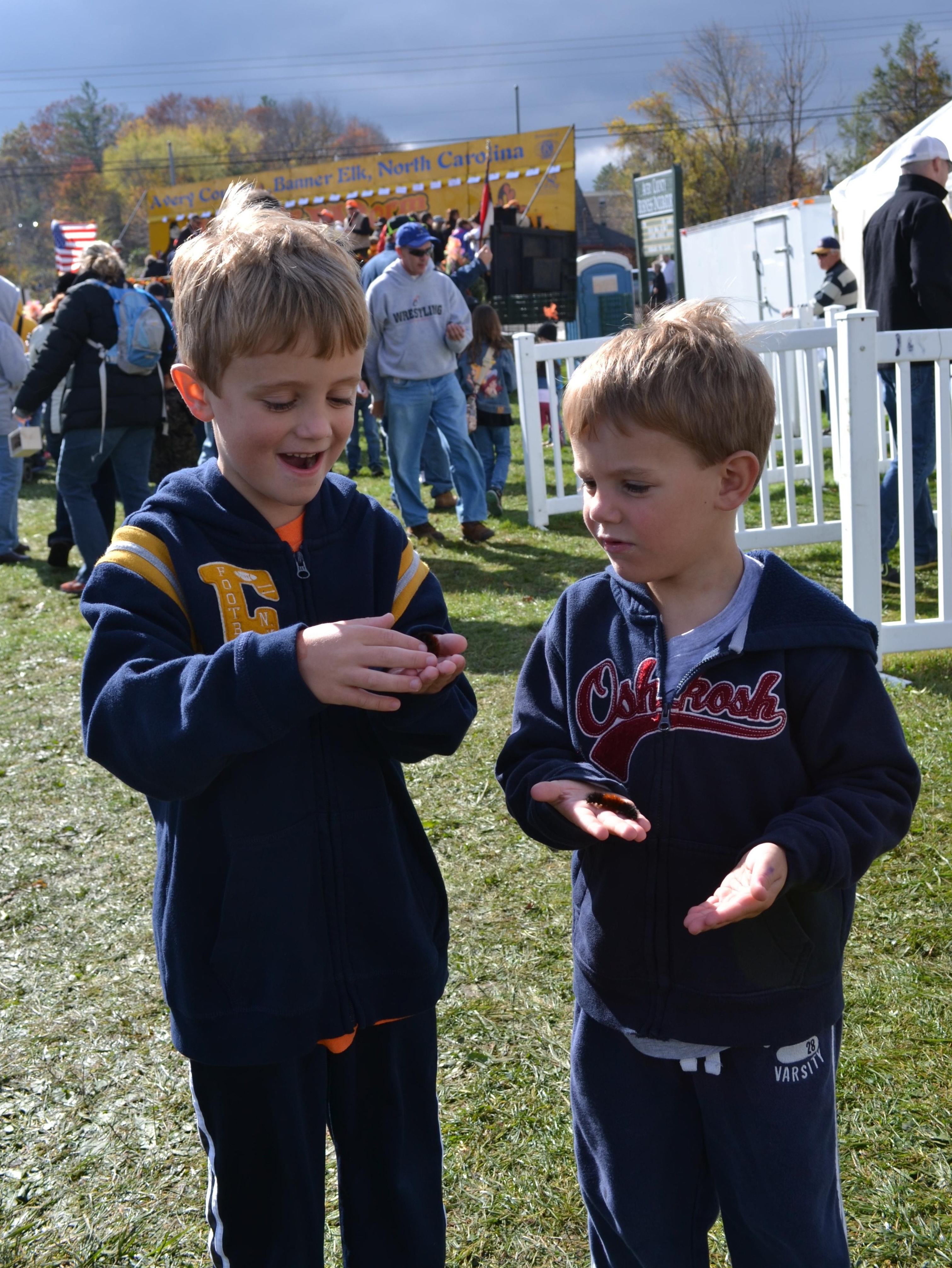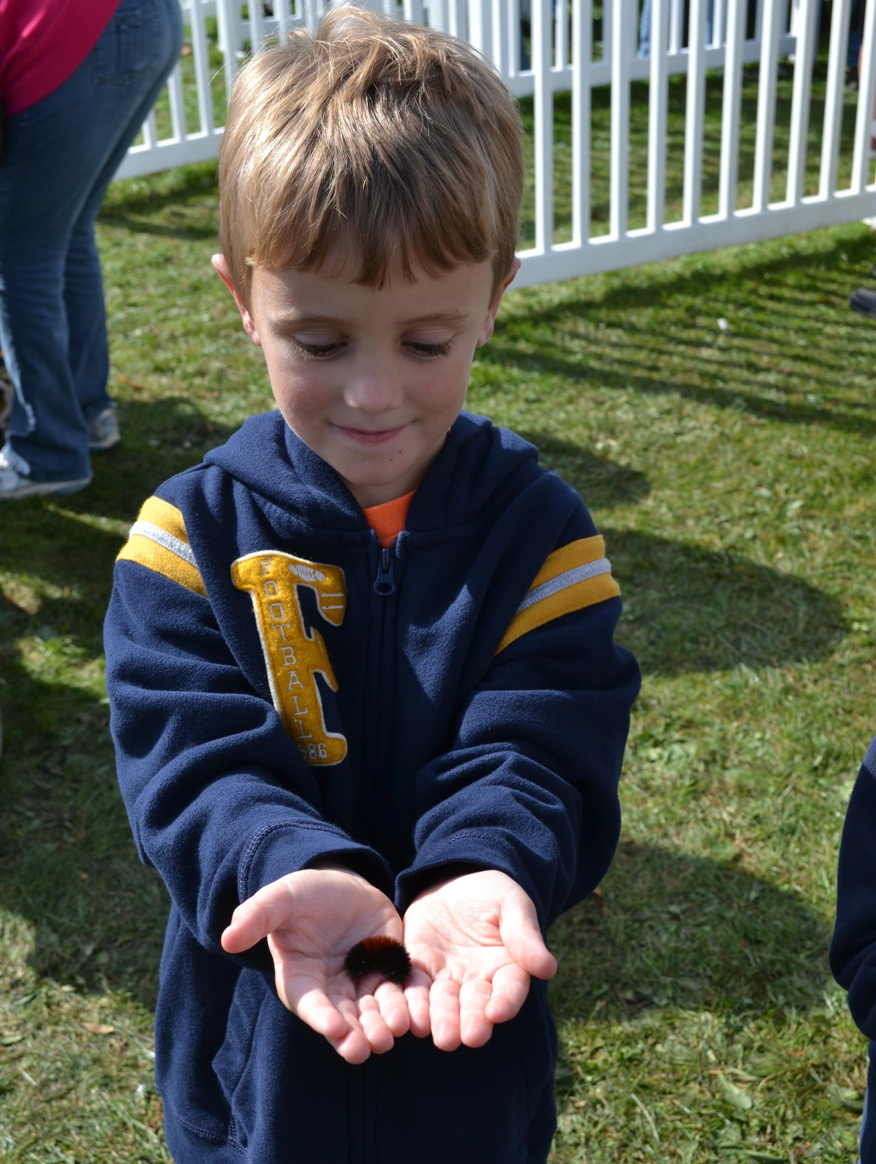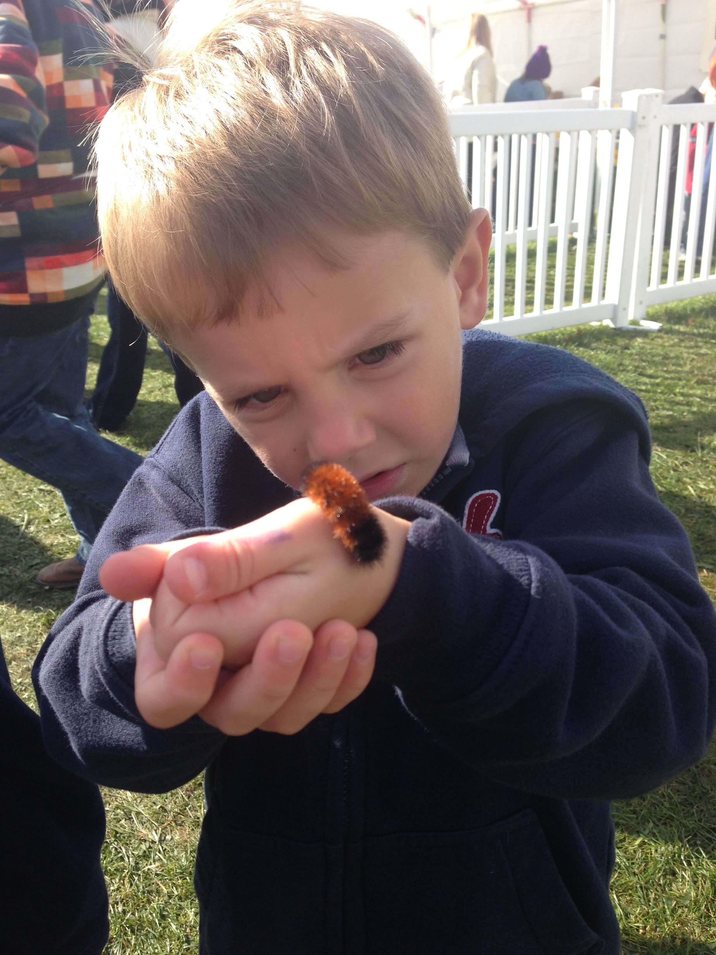 Each race lasts a few minutes (depending on how fast the worms go). Our race had a false start and a disqualification. One worm was disqualified for not being an actual woolly worm. It was some other similar looking breed of caterpillar that is apparently much faster. The officials caught the imposter while they were lining up and replaced it with an actual woolly worm. Then at the start someone dropped their worm so officials stopped the race to let them regroup and everyone started again. Unfortunately, our worm Bunson got off to a great start the first time but not so much the second time. He was nowhere near the front of the pack but the boys enjoyed the excitement of the race.