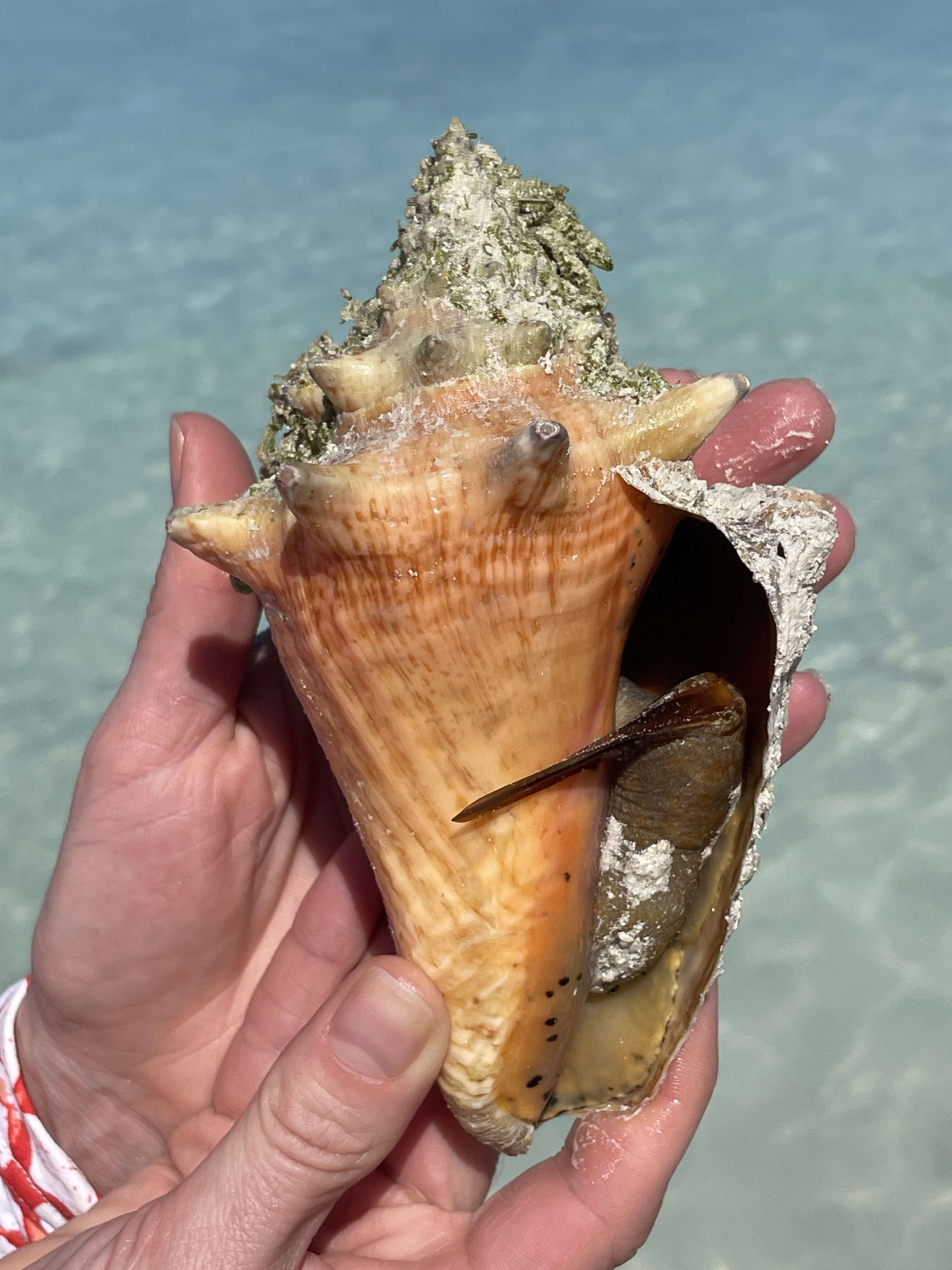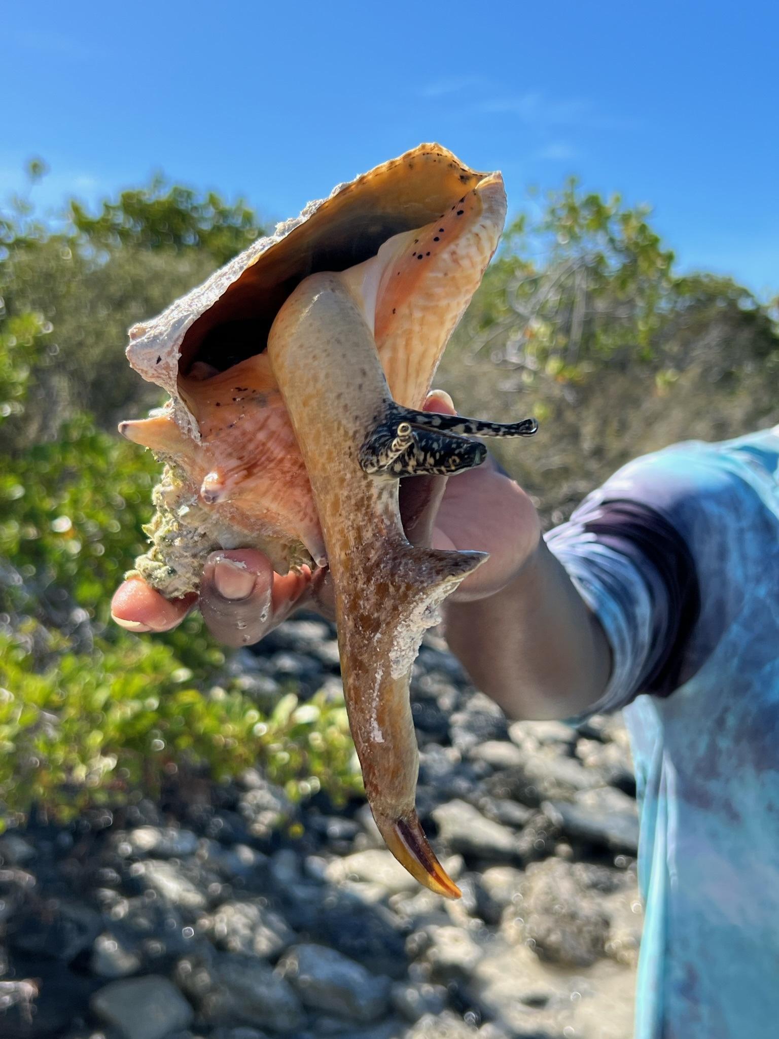 After about 25 minutes we arrived at the island across the channel and pulled our kayaks up onto the beach. We hung out on the small rocky beach for a bit while Mitch was wading in the water looking for a conch. He soon returned holding a beautiful spiral shell with a little critter peeking its way out. He gave us a lot of great information about conch and it was really amazing to see the entire snail emerging from its shell. I had no idea it was such a large and bizarre looking creature! The conch retreated into its shell and we all got a chance to hold it and check it out up close before returning it to the water.